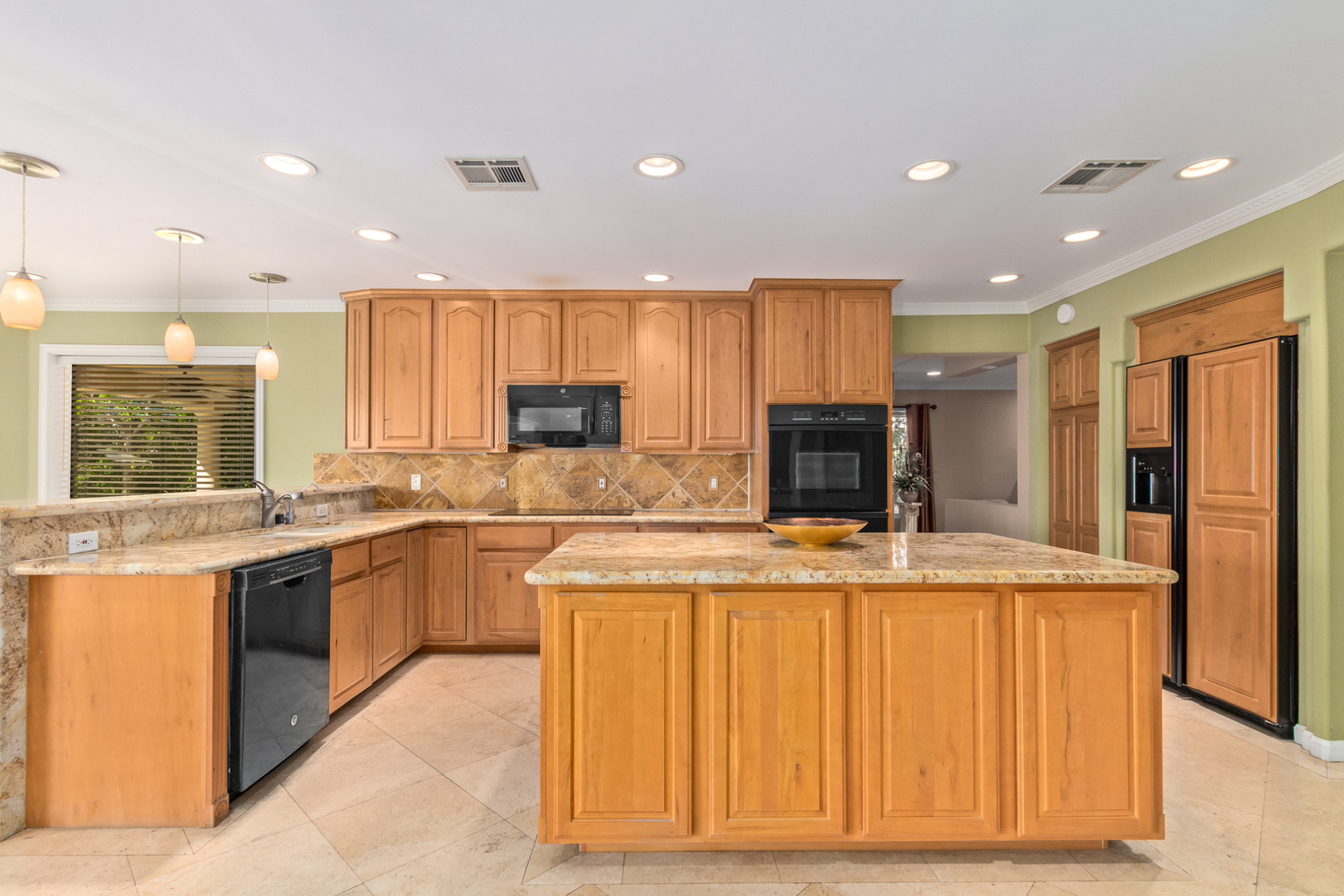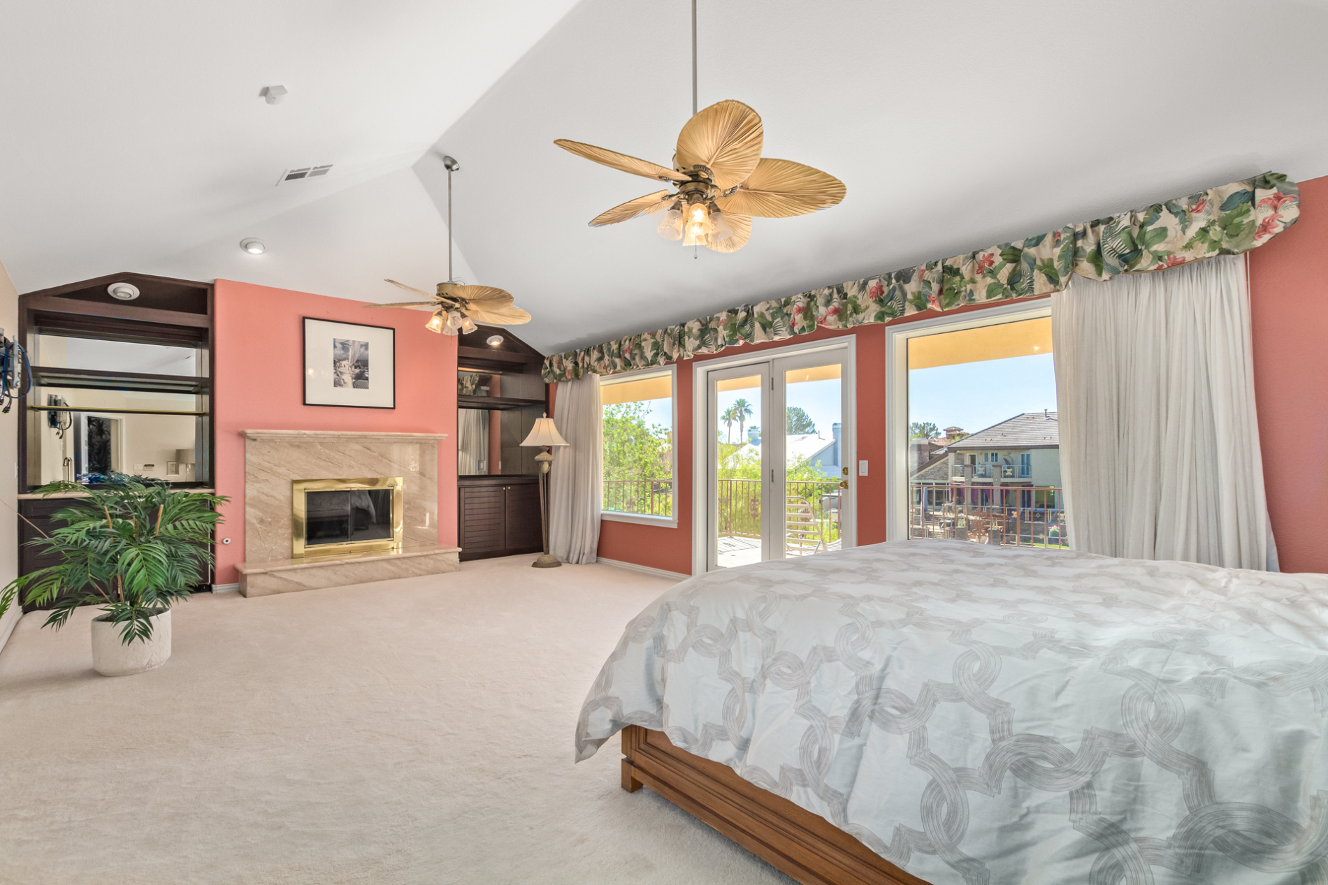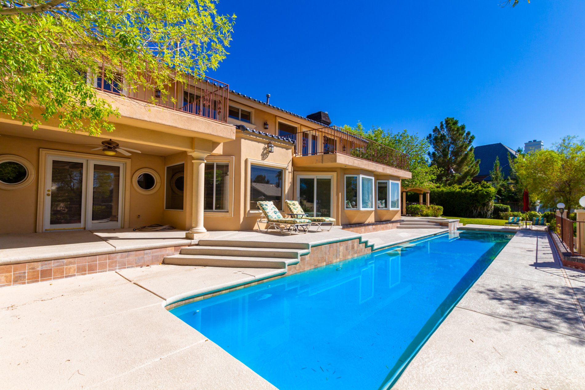 The wet bar, surround sound, and a flex area w/bay windows, ensure top-tier entertainment! You'll love the gourmet kitchen boasting built-in appliances, granite counters, center island, and a cozy nook. Head upstairs to find the bedrooms; two have access to the balconies.