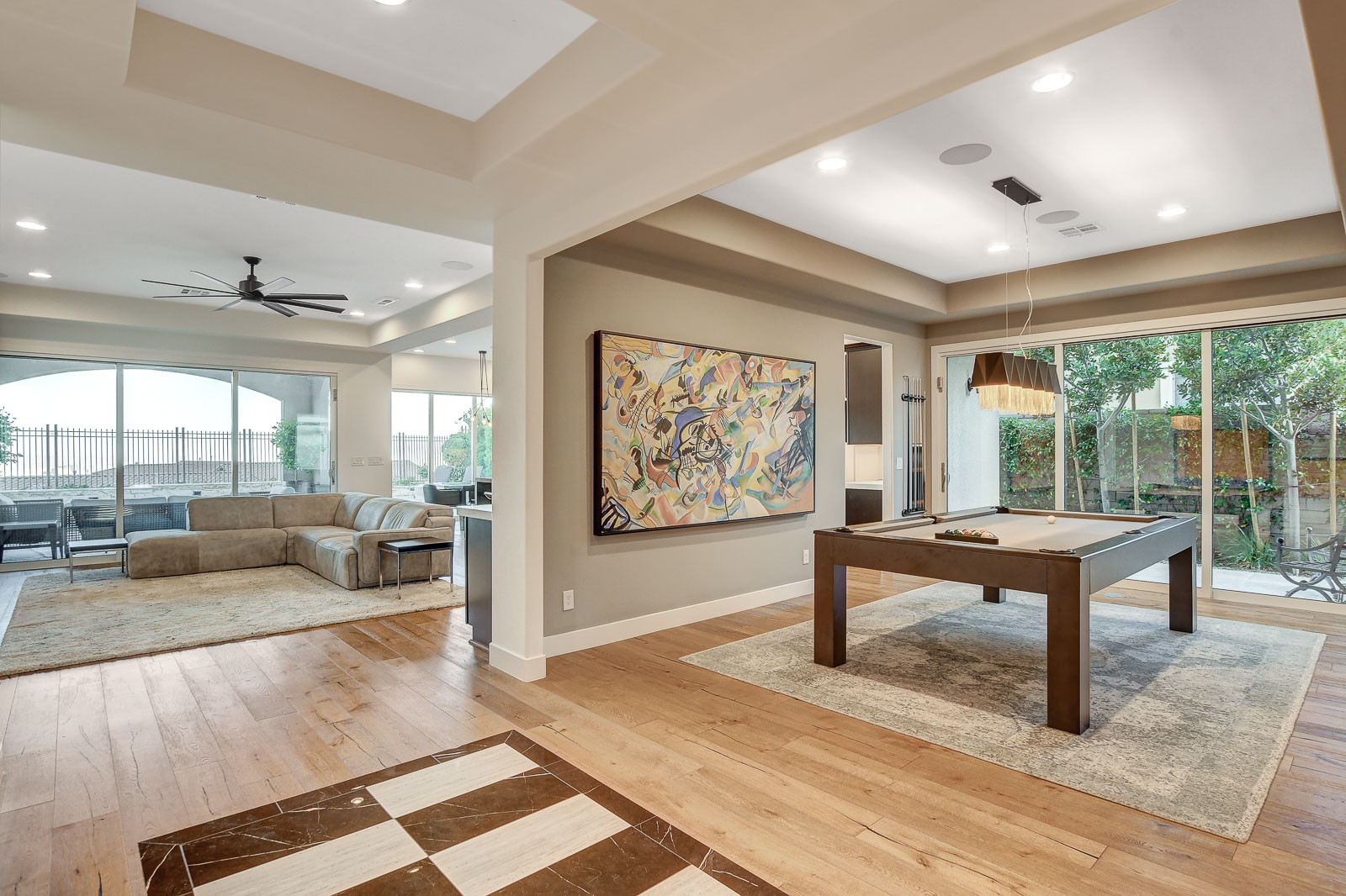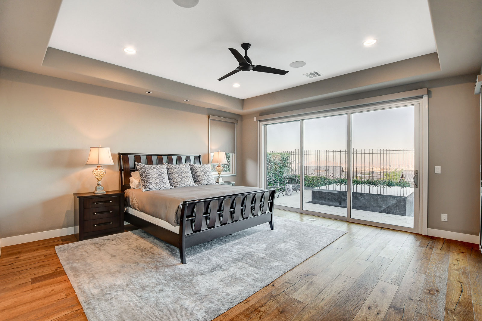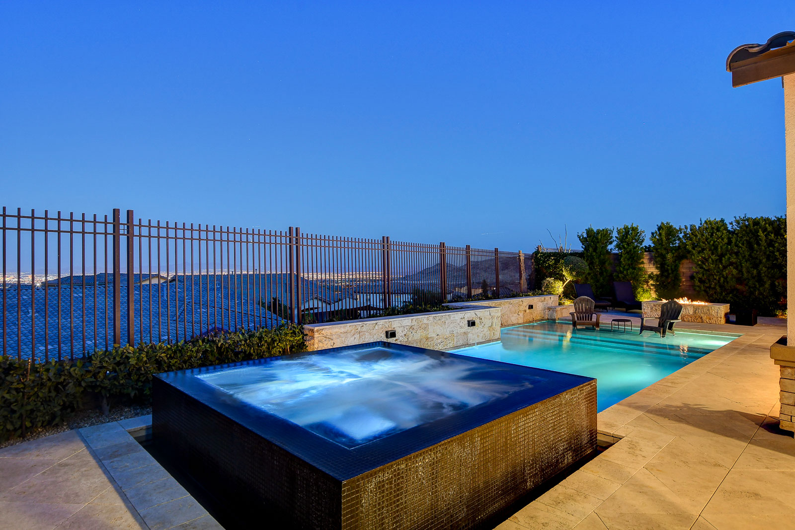 A bonus room, that opens to a secluded covered patio, is large enough for a billiard table or large dining table. The chefās kitchen boasts a double oven, island with bar seating, separate full-size pantry, and breakfast nook overlooking the pool. An en suite bath adjoins the master bedroom where sliding glass doors open to the pool deck, and floor to ceiling windows afford amazing western views. This beautiful lot, on one of the most elevated lots in Montecito, and beautifully landscaped for privacy and simplicity, holds a custom abode with surprising artistic bonuses like a glass front door and travertine accents. The property is located near the Red Rock Canyon National Conservation Area, offering the best of the Las Vegas outdoor recreation opportunities while being close to urban comforts.