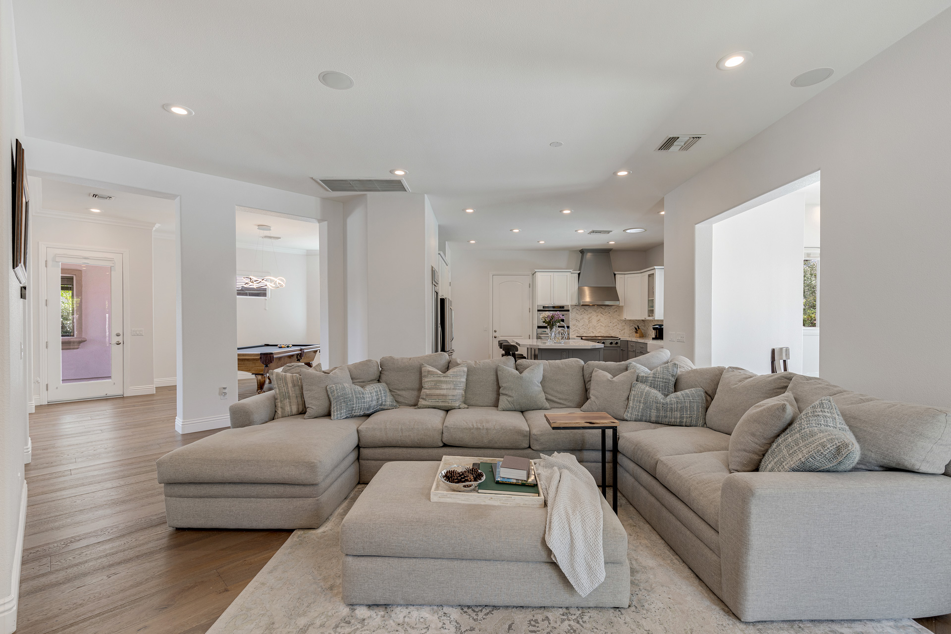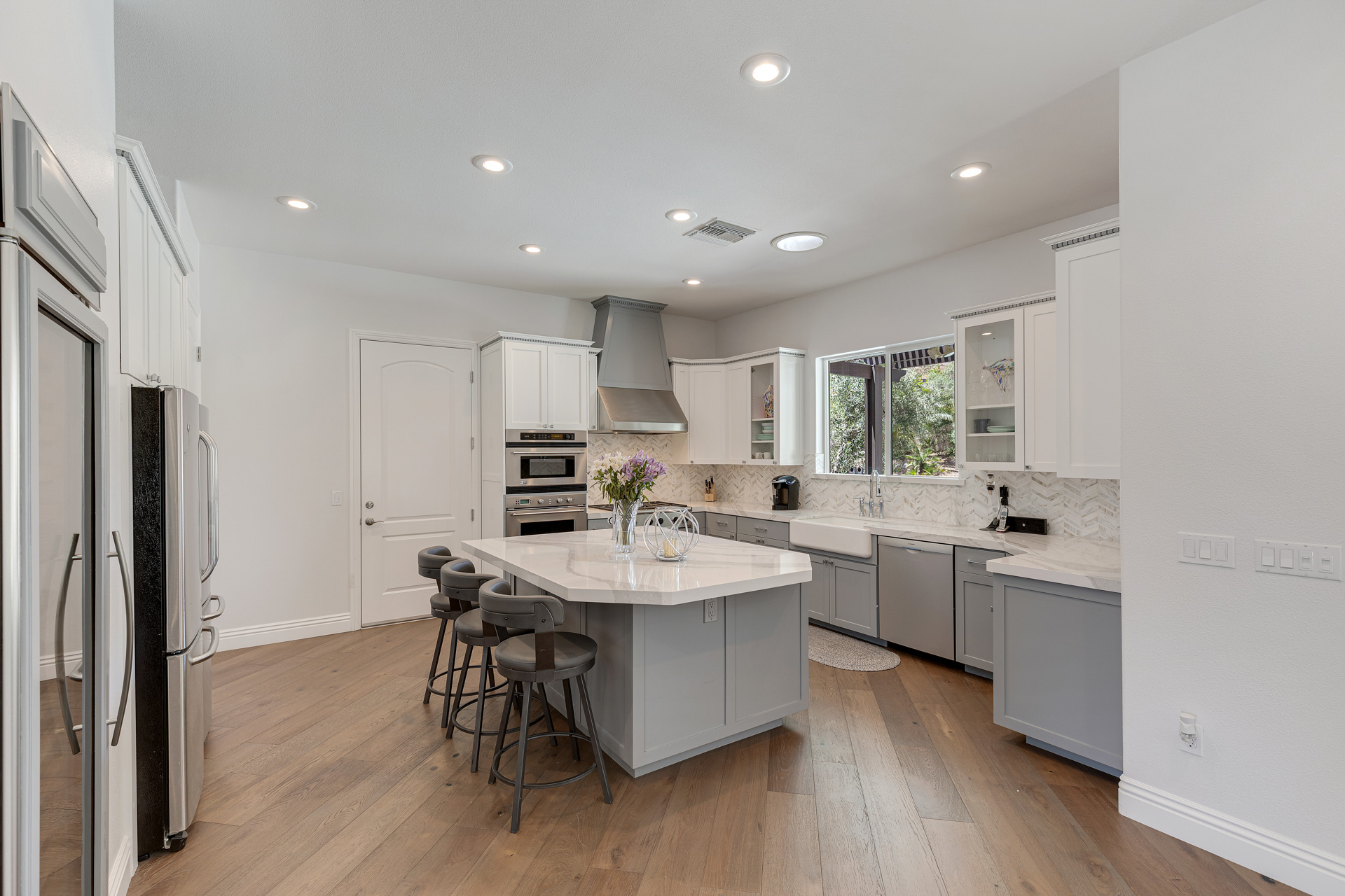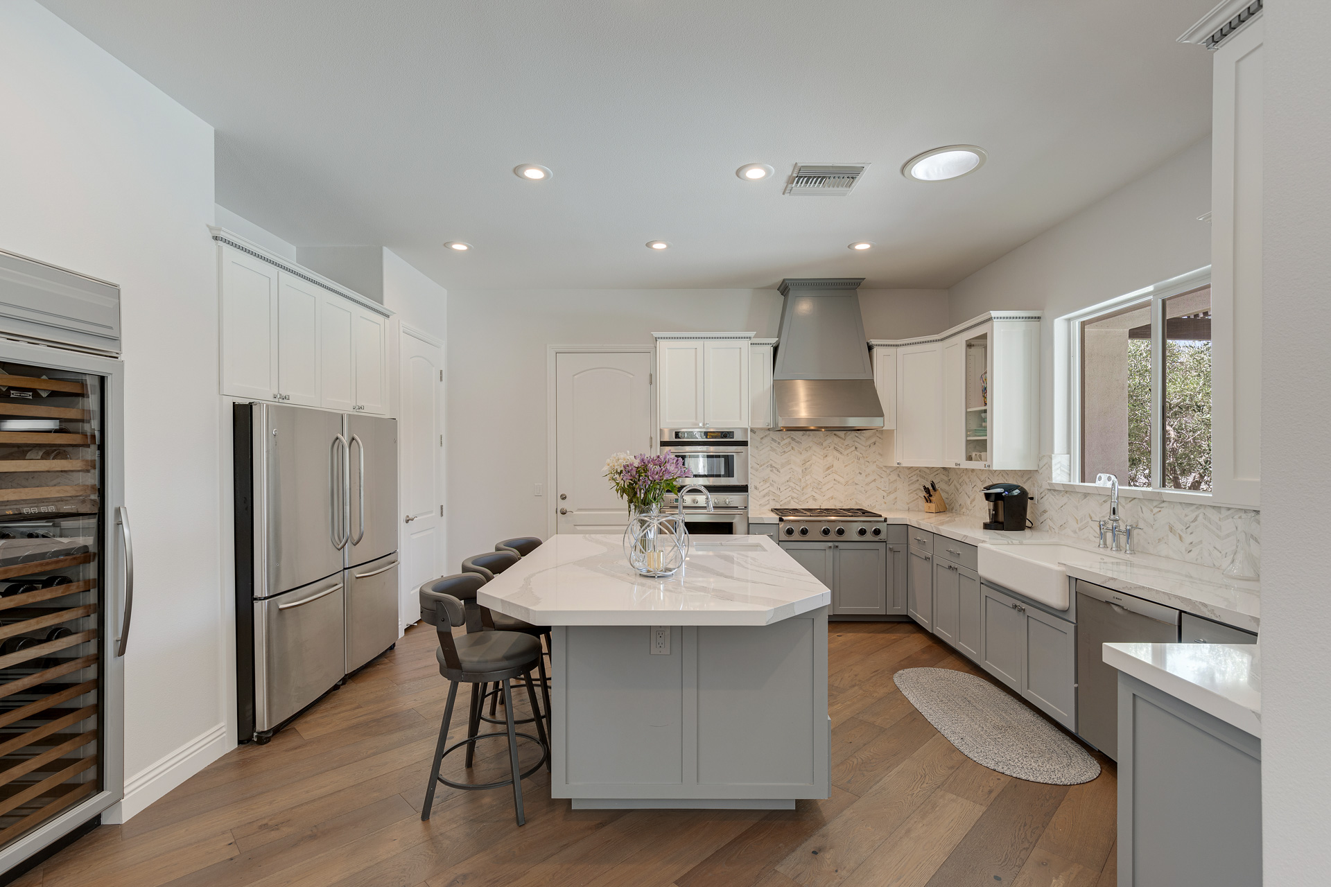 This beautiful Willow Creek custom home features 3,910 square feet of elegant living space located within the double guard gated neighborhood of Willow Falls. With 5 bedrooms, 4 bathrooms, an office, den, and separate workout room, two-story layout is well planned and timeless. Step inside the front door to vaulted ceilings and European oak wood flooring. The kitchen includes custom white cabinetry, dual ovens, a wine refrigerator, and an island with seating.
