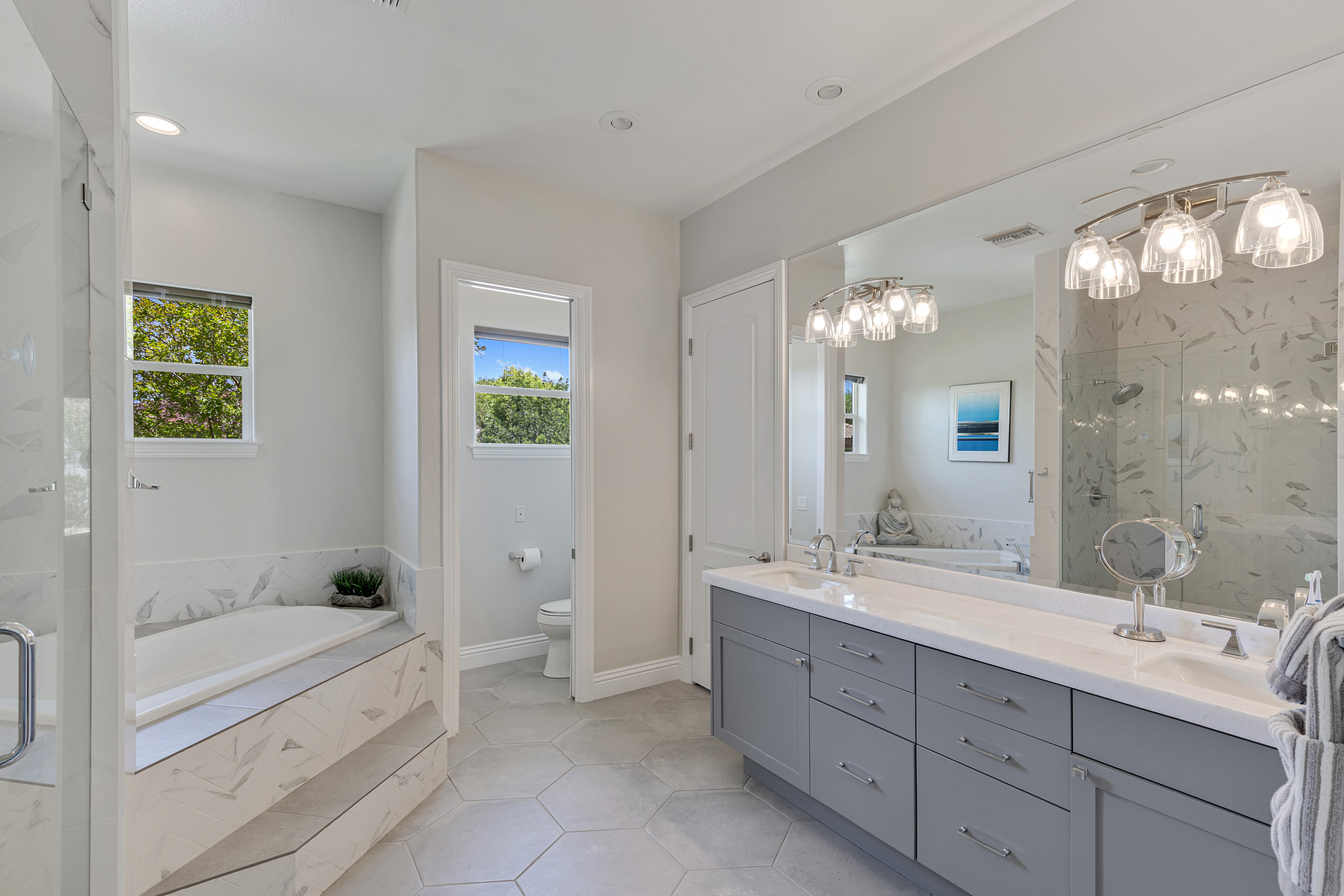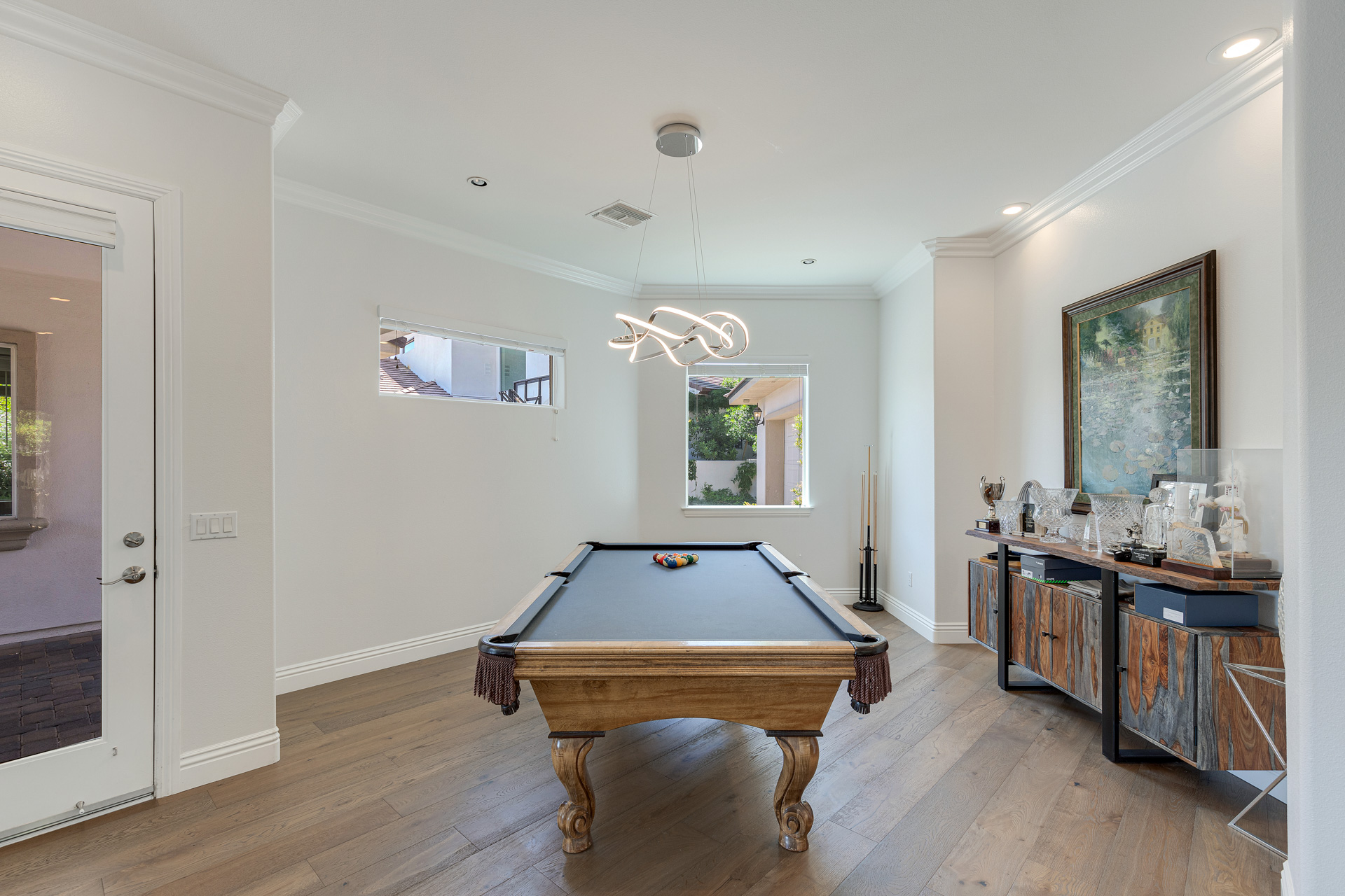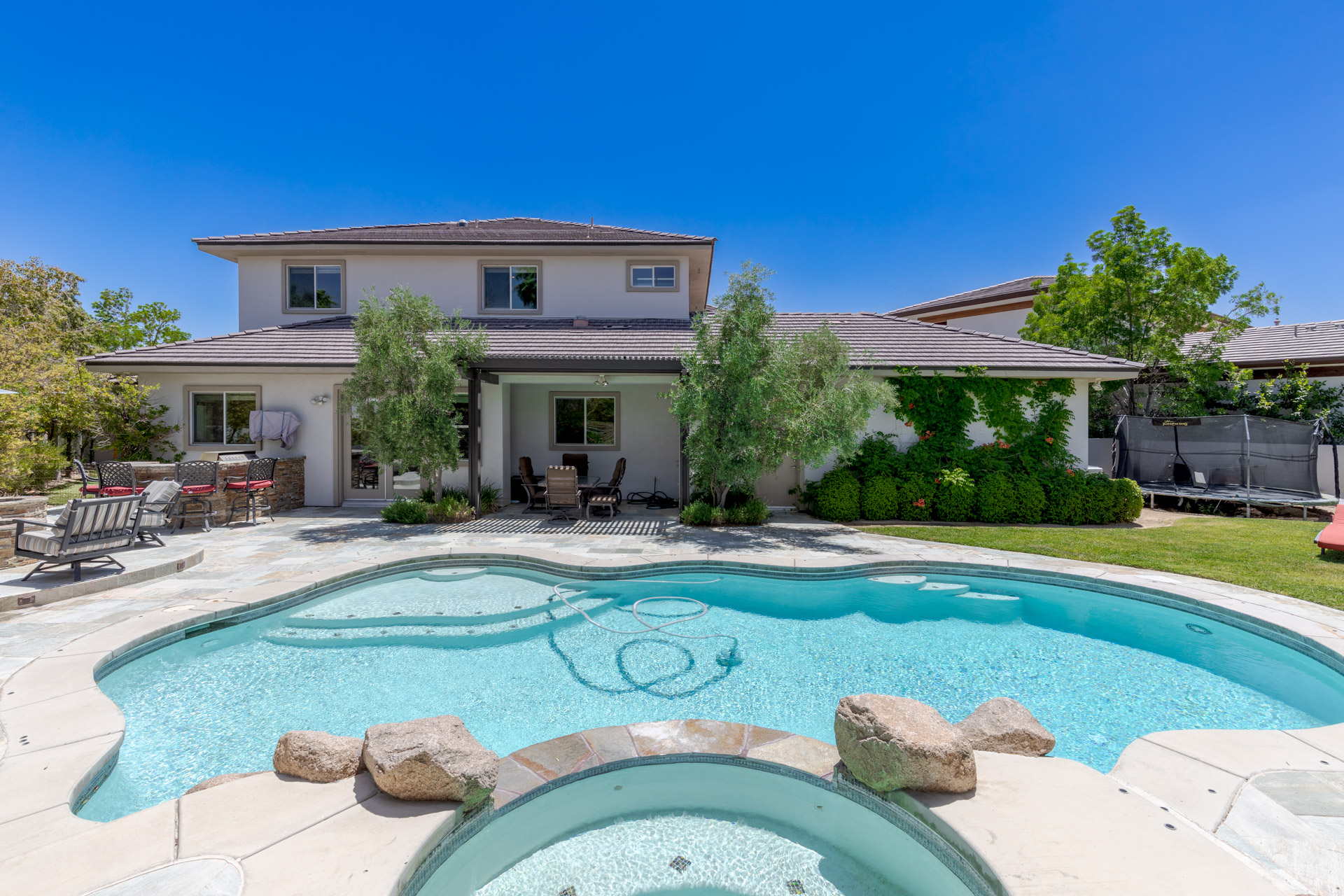 The family room is the perfect place to entertain while the living room and dining room offer more formal options. Enjoy a first-floor primary suite and a spa-like bath- featuring a built-in tub, a spacious shower and dual vanities. Retreat to the backyard and enjoy a sparkling pool and spa, a fire pit, an outdoor kitchen and expansive grass area. This custom property is a true gem in one of Summerlinās most desirable neighborhoods.