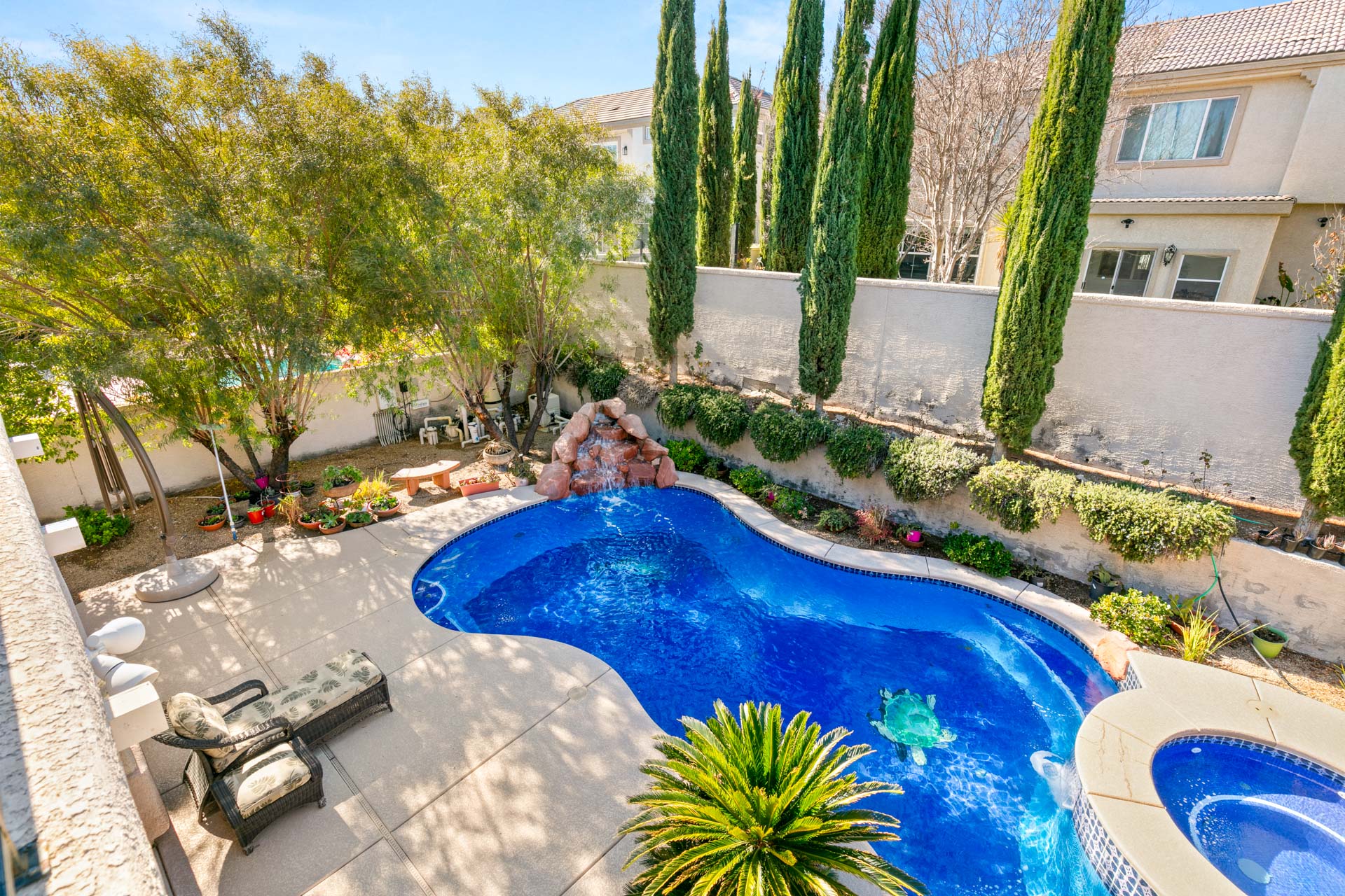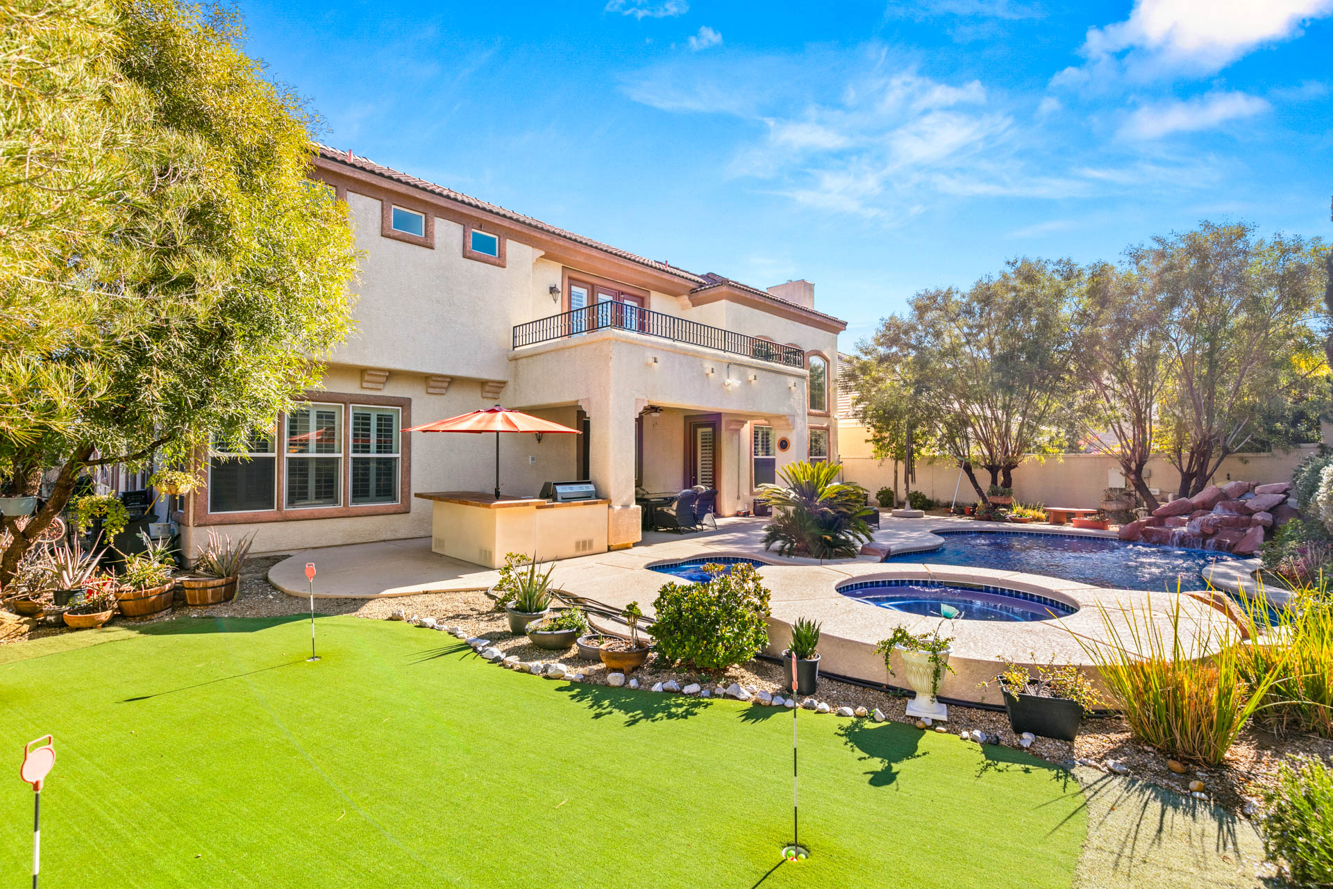 The generous layout seamlessly flows into a charming breakfast nook, bathed in the soft glow of natural light, creating an inviting space for morning coffee or casual gatherings. Throughout the home, custom built-ins grace every corner, marrying functionality with timeless beauty. Plantation shutters, an embodiment of sophistication, adorn each window, offering a perfect balance between privacy and style. The overall design exudes a harmonious blend of form and function, creating an atmosphere that is both welcoming and refined. Ascend the staircase, and a revelation awaits on the upper floor – the primary retreat. Step onto the expansive balcony, a private oasis where the world below fades away. Here, under the open sky, indulge in moments of tranquility while relishing an unrivaled panoramic view that stretches beyond the confines of the home. It's not just a room; it's a haven where luxury meets serenity. The outdoor space continues the narrative of opulence. A custom pool, complete with a soothing waterfall and spa, beckons on warm days, offering a refreshing respite. The backyard transforms into an entertainer's paradise with a built-in BBQ and a mini-golf course, creating a haven for social gatherings and leisure – a rare find indeed. Adding to the allure is the convenience of a 3-car garage, providing ample space for vehicles and storage, completing the functionality of this exquisite residence. The garage seamlessly integrates with the overall design, ensuring that practicality meets elegance at every turn. Beyond the walls of this remarkable abode lies Queensridge, a community defined by its tree-lined streets and manicured landscapes. The setting serves as the canvas upon which this architectural masterpiece is painted. It's more than just a home; it's an embodiment of a lifestyle curated for those who seek the extraordinary. As the sun sets, casting a warm glow over the neighborhood, the ambiance transforms. The gentle rustle of leaves and the tranquil surroundings create a serene backdrop for life's moments. This residence is not just a dwelling; it's an experience, where each detail is a brushstroke in the portrait of refined living. In the heart of Queensridge, 301 Round Stone stands as a rare offering, a residence that transcends the ordinary. It invites you to embrace the extraordinary – a lifestyle where luxury, comfort, and sophistication converge. Seize this opportunity to make this masterpiece your own, where every day is an ode to the art of living well.