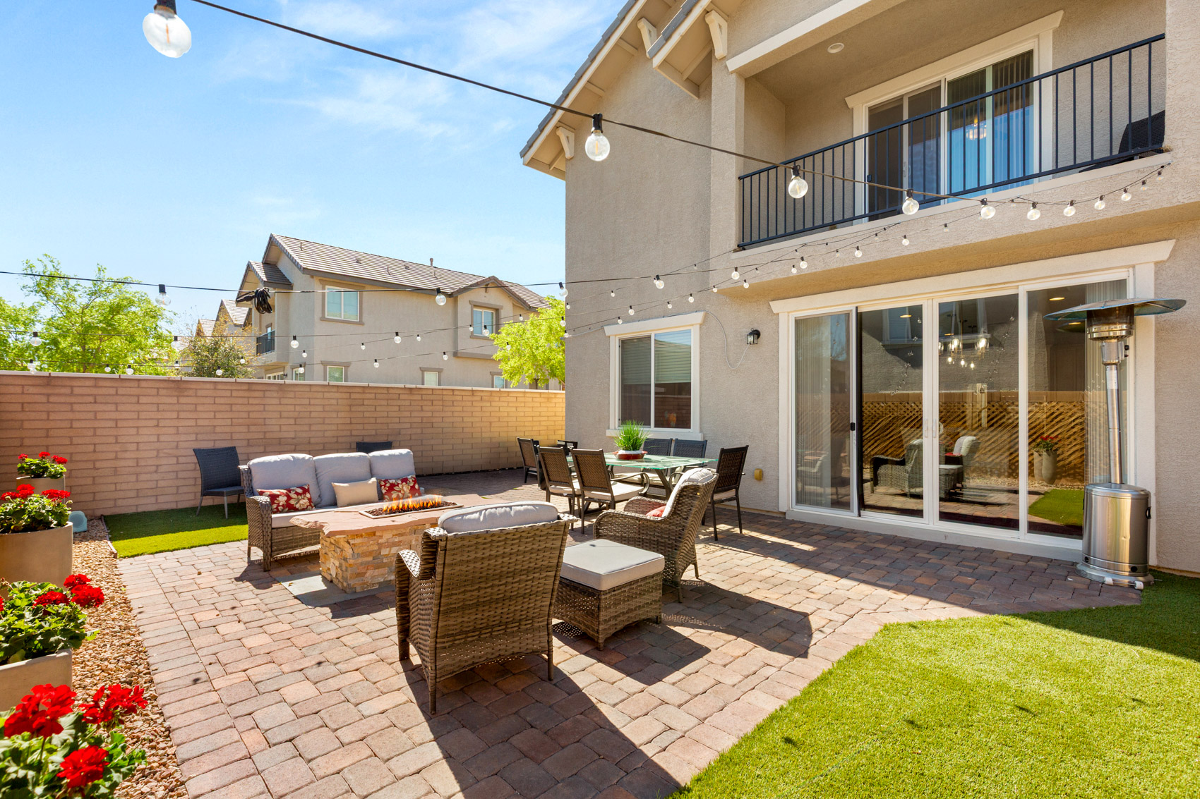 The great room opens to a dining room that seamlessly connects to the kitchen. The upper level includes well-sized bedrooms and a private primary suite with a balcony. The tranquil primary bath offers a large walk-in shower with seating, double sinks and a soaking tub. The upstairs loft is very versatile for a craft room, office space or a children's play area. The backyard patio is a perfect place to lounge around the custom built- firepit. Tumbled pavers, a low-maintenance yard, synthetic grass, and party lights make this a great place to entertain family and friends.