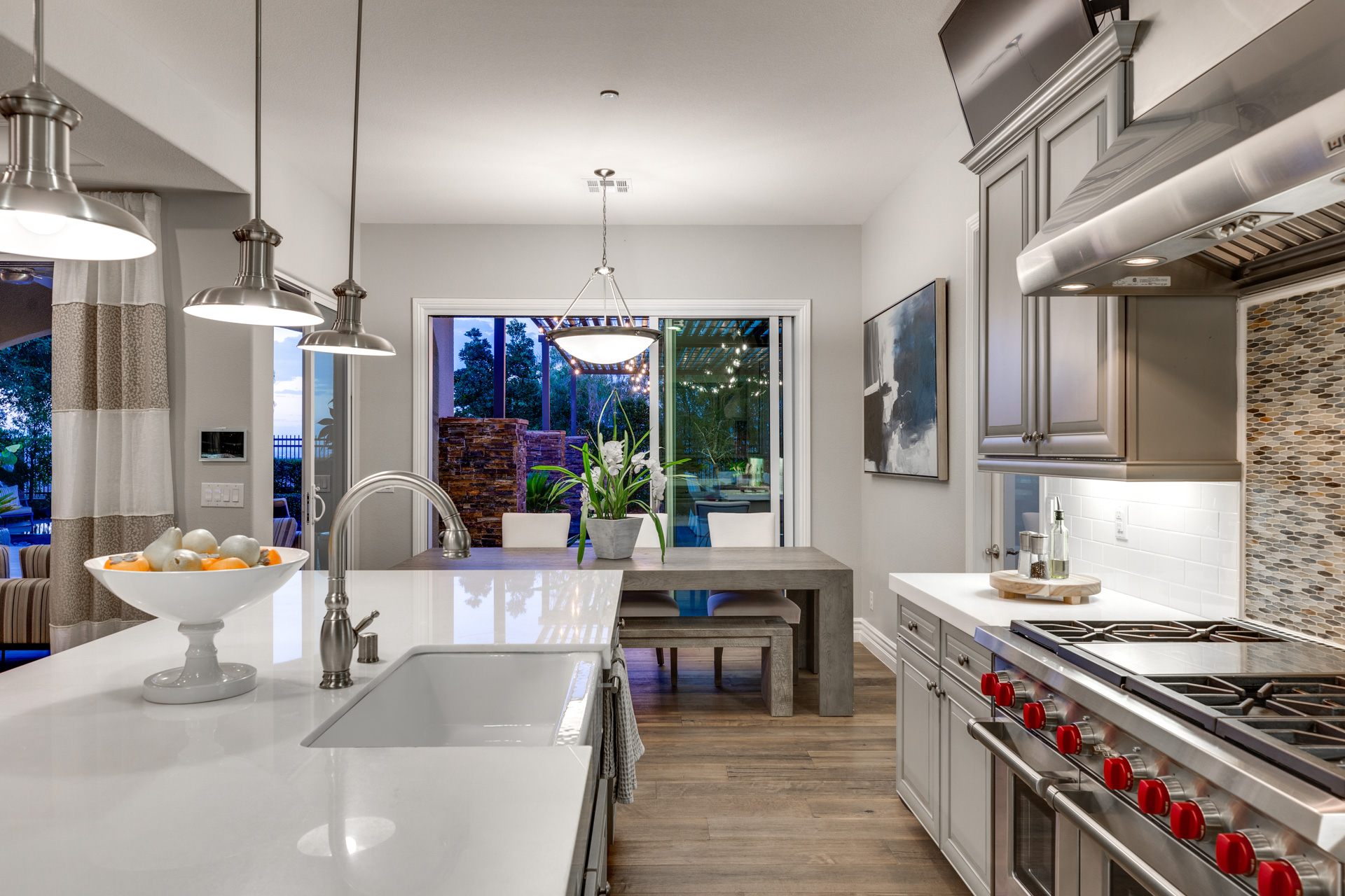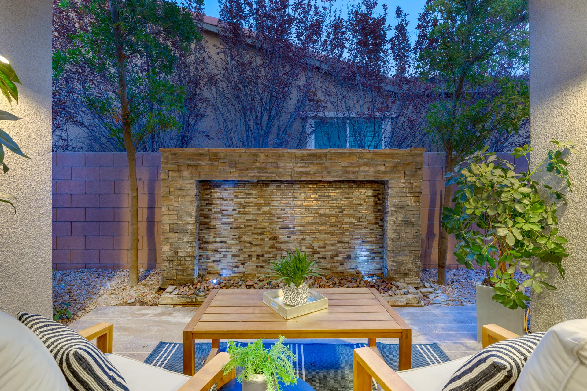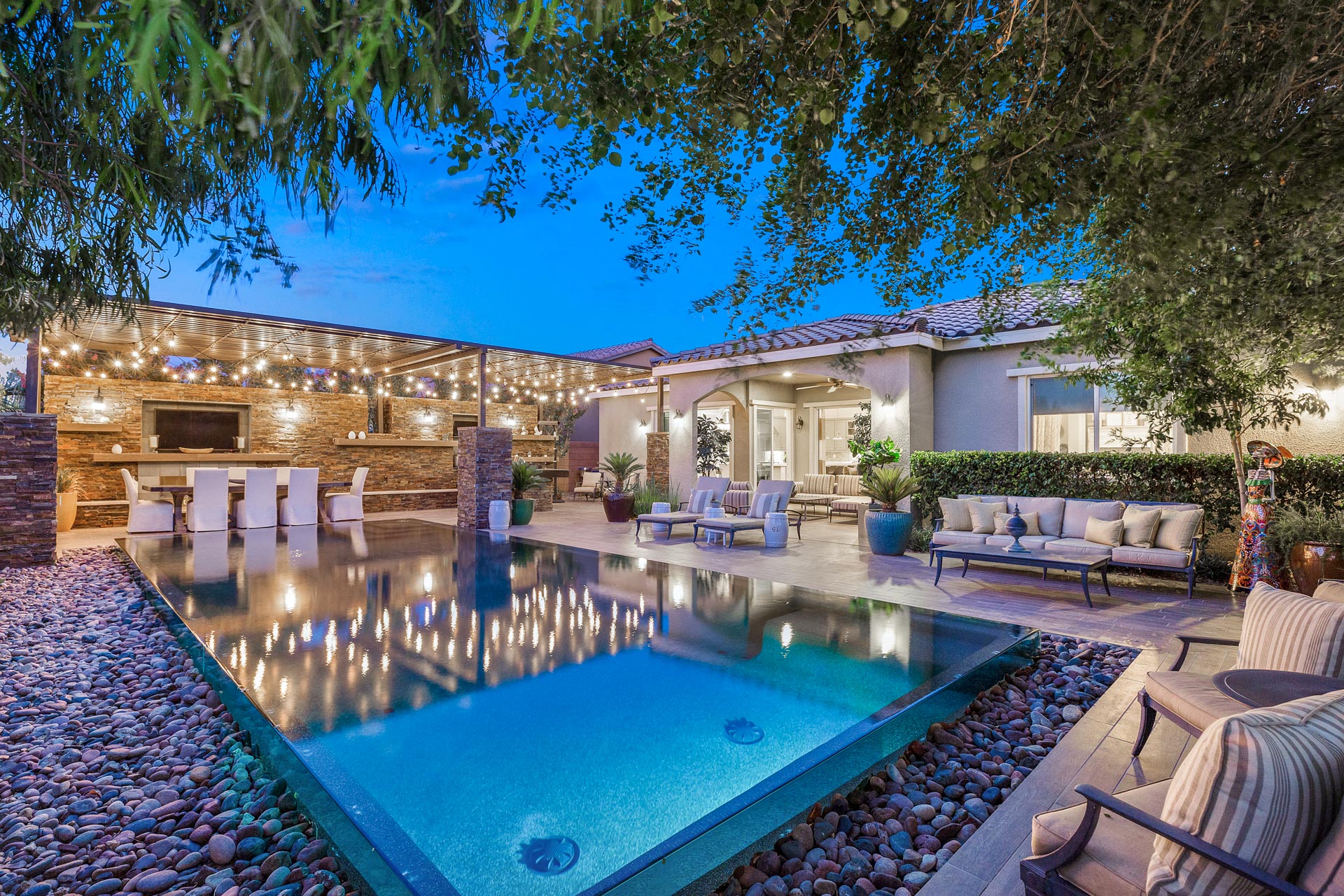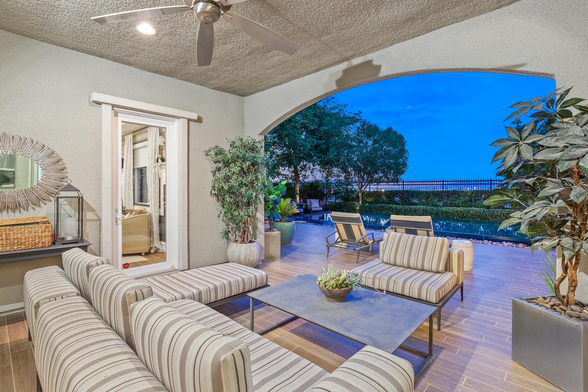 Stunning single-story Toll Bros former model home. Exceptional strip views and fabulous outdoor spaces make this home a very rare find. Designer finishes throughout featuring a gourmet kitchen with Wolf appliances and a grand island. A stylish wet bar with a seating area is perfect for entertaining. Hardwood floors, inset marble tile, unique ceiling details, beautiful lighting, and luxurious accents are found throughout.
