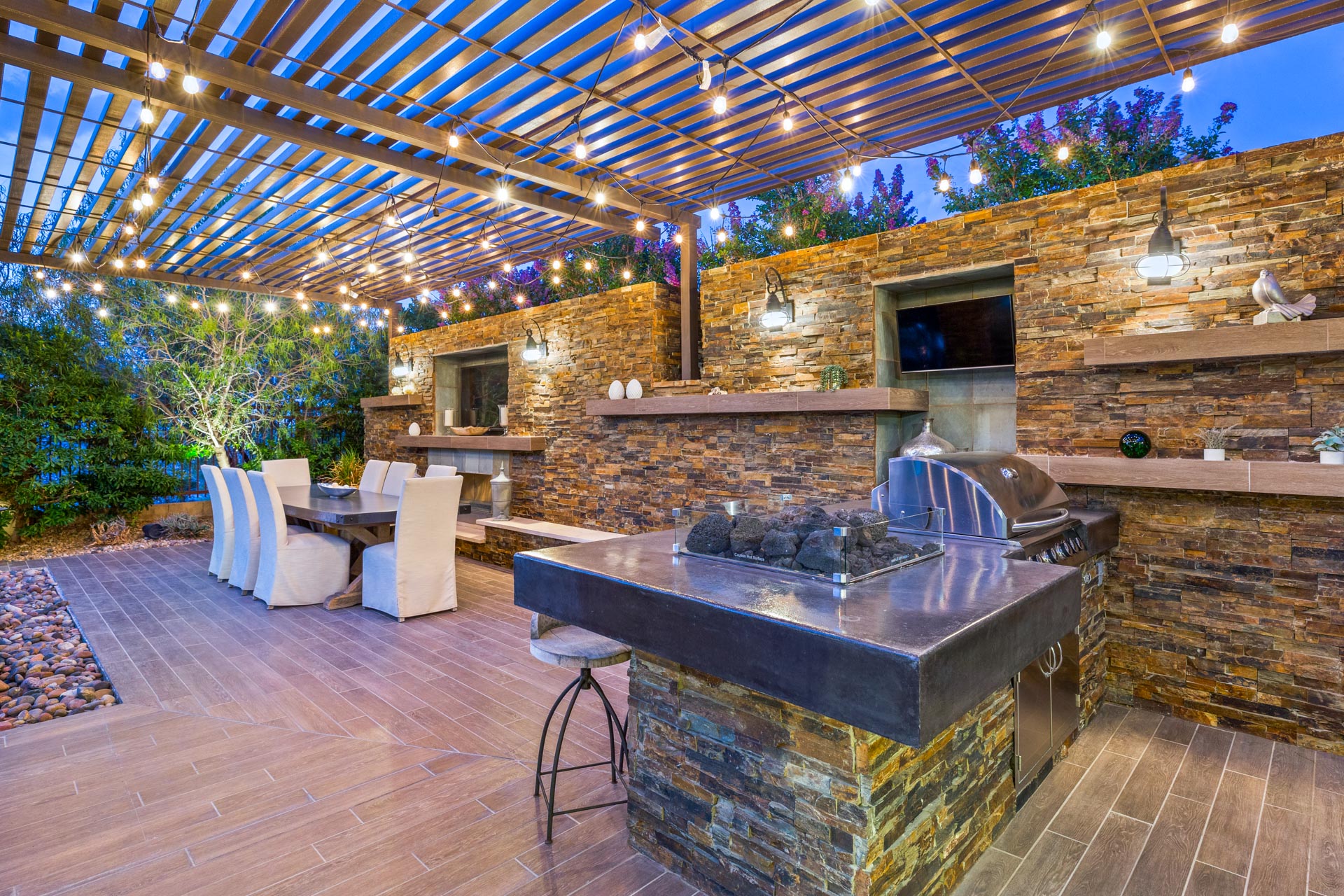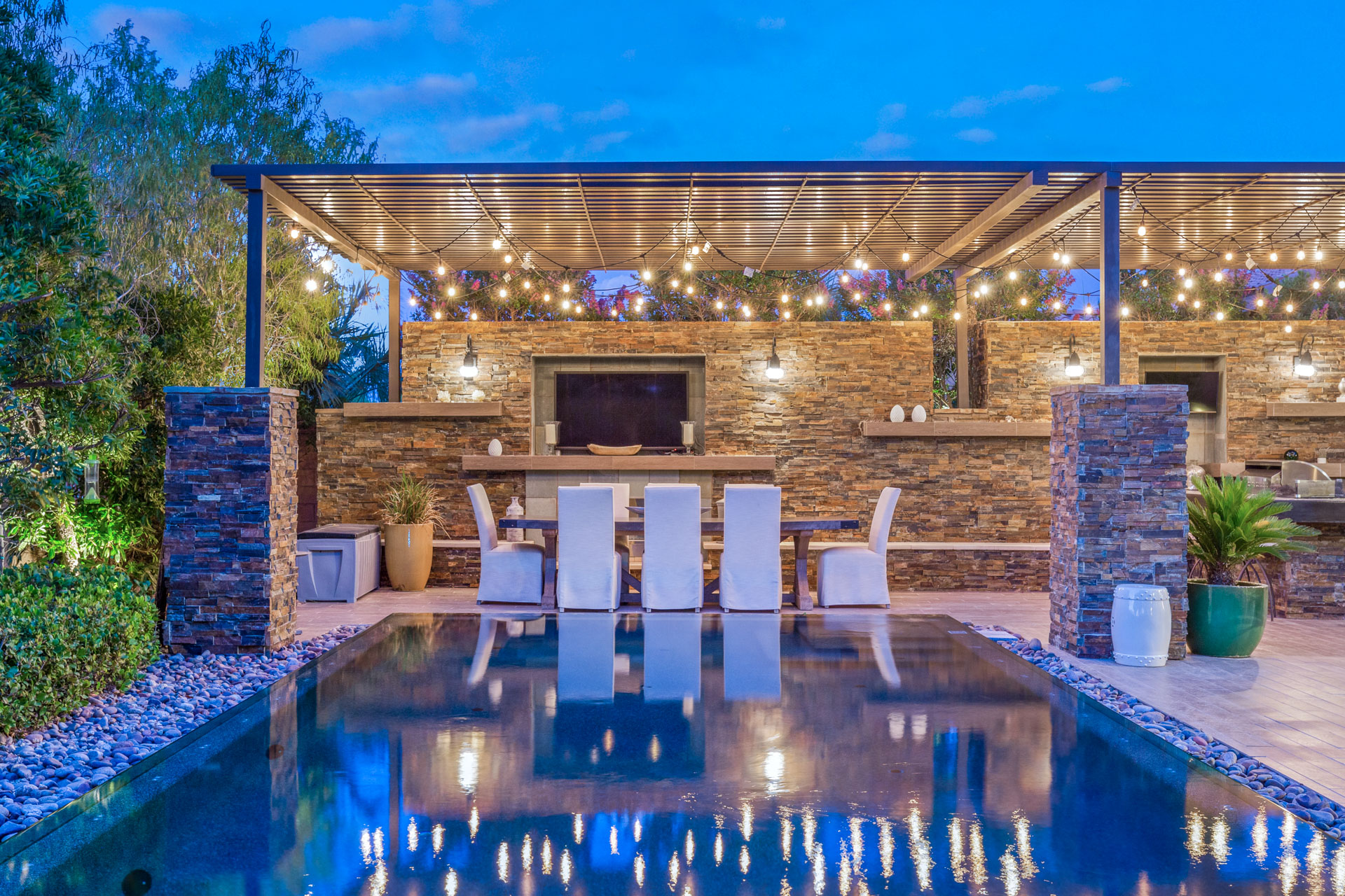 The master retreat is very well appointed with a spa-like bath and large closet. The outside area is just as well finished as the interior with BBQ area, water feature, glass rimmed pool, fireplace, large covered pergola, built-in TVs and is extremely private.
