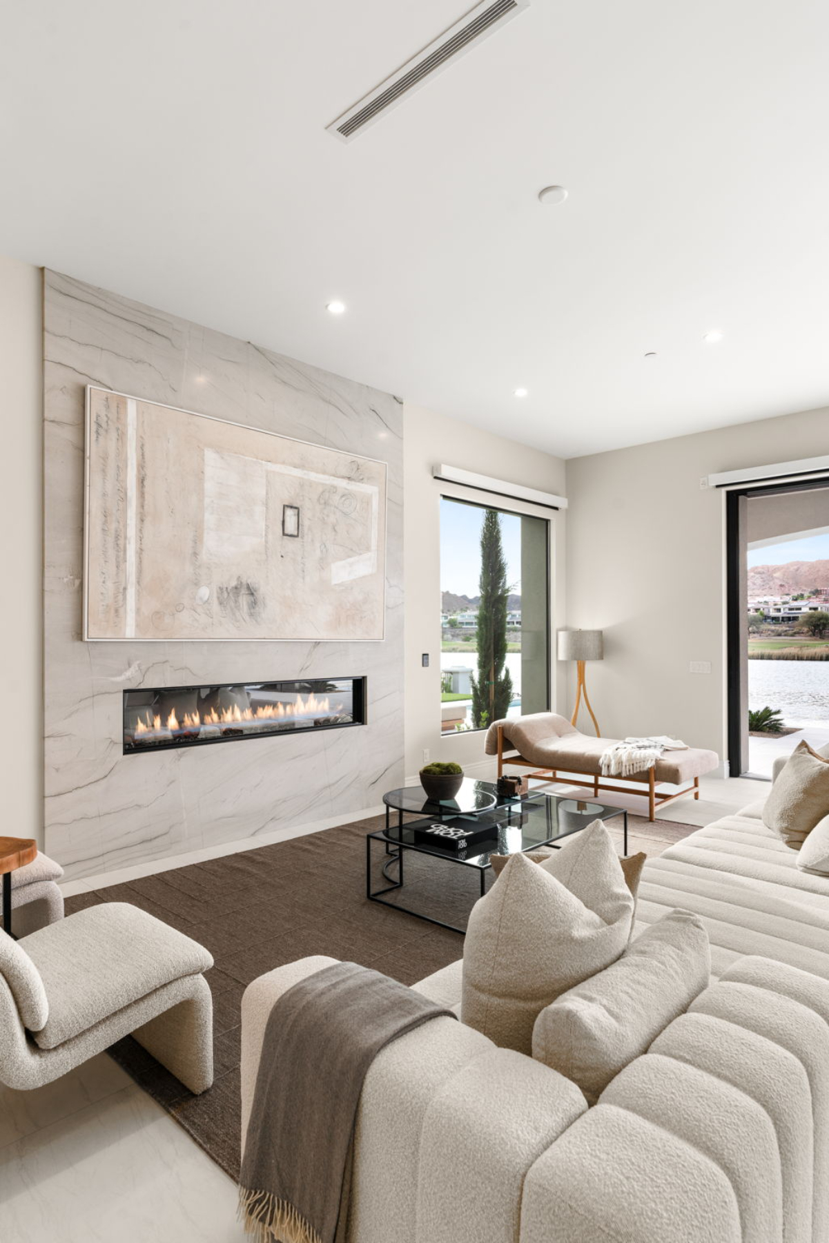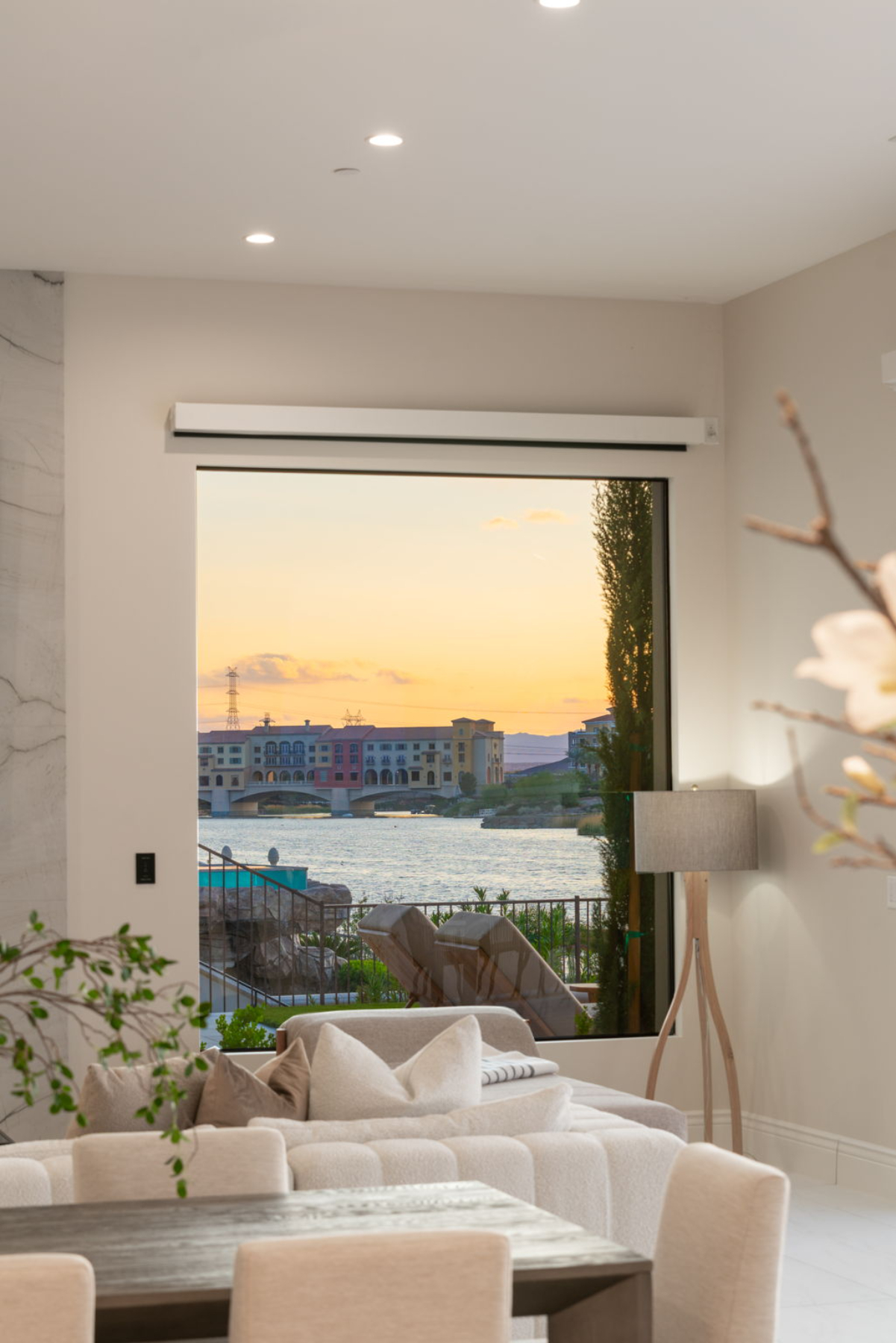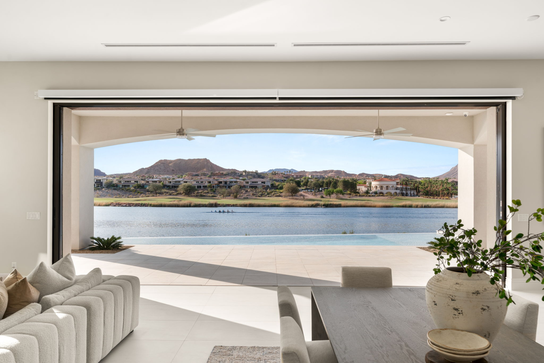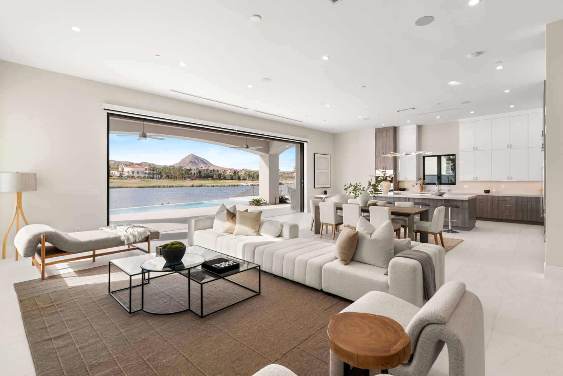 Spanning 5,857 square feet on a 0.31-acre homesite, this two-story estate is designed for both effortless entertaining and serene relaxation. Walls of disappearing pocket doors create a fluid transition between the sophisticated indoor living spaces and the expansive 2,000-square-foot patio, where you can lounge by the negative-edge saltwater pool and spa, taking in the tranquil beauty of the lake.