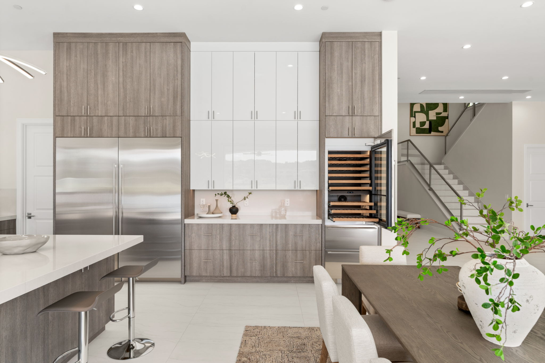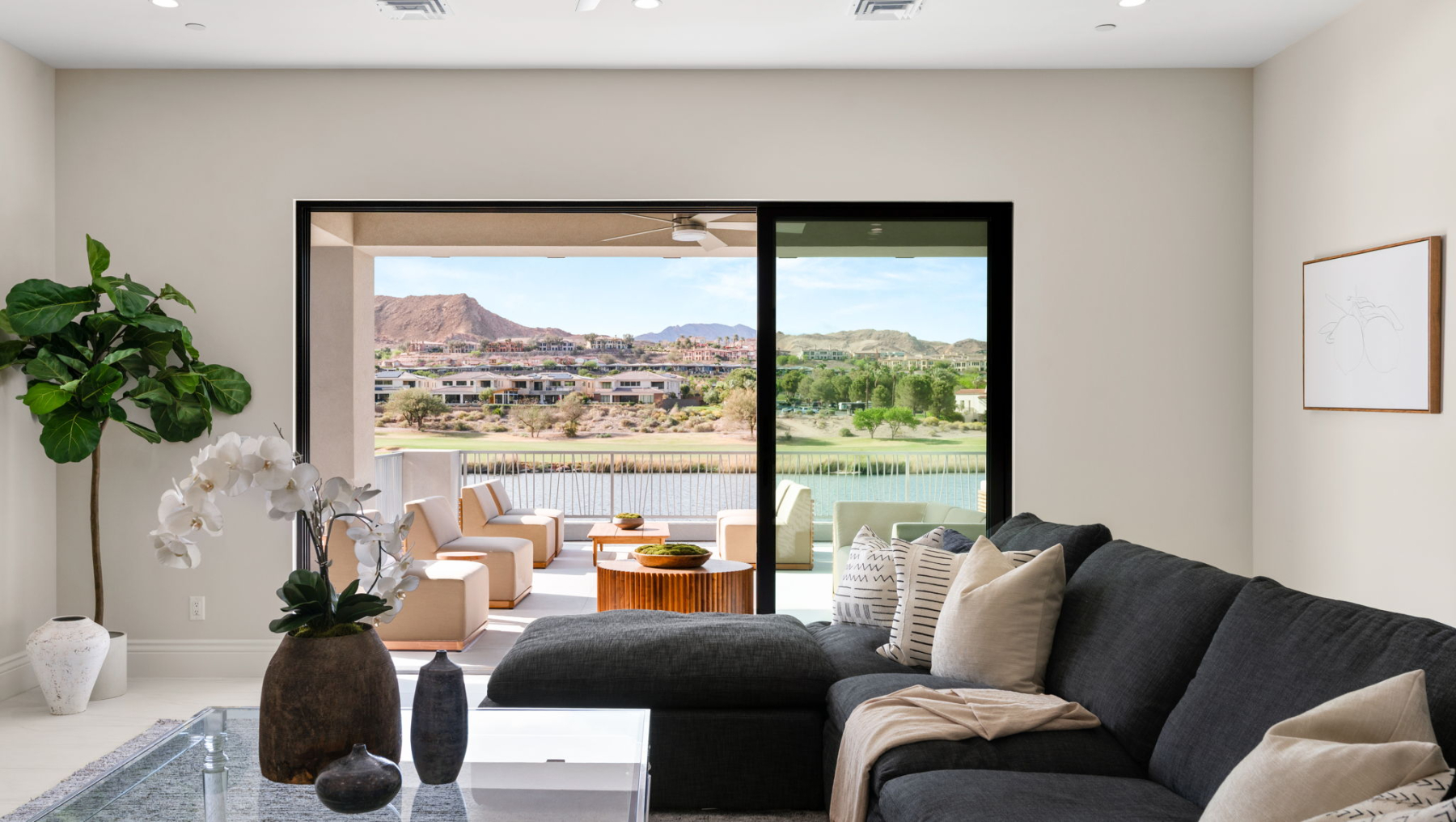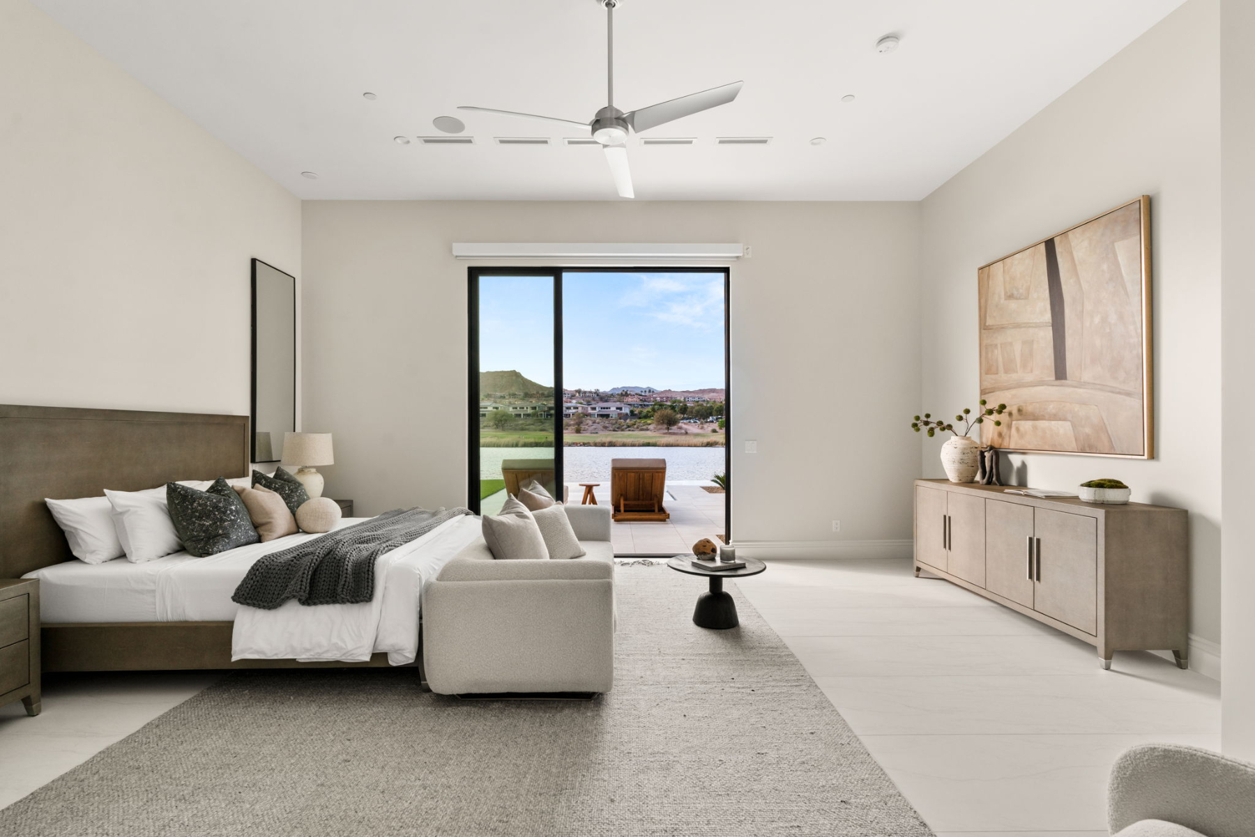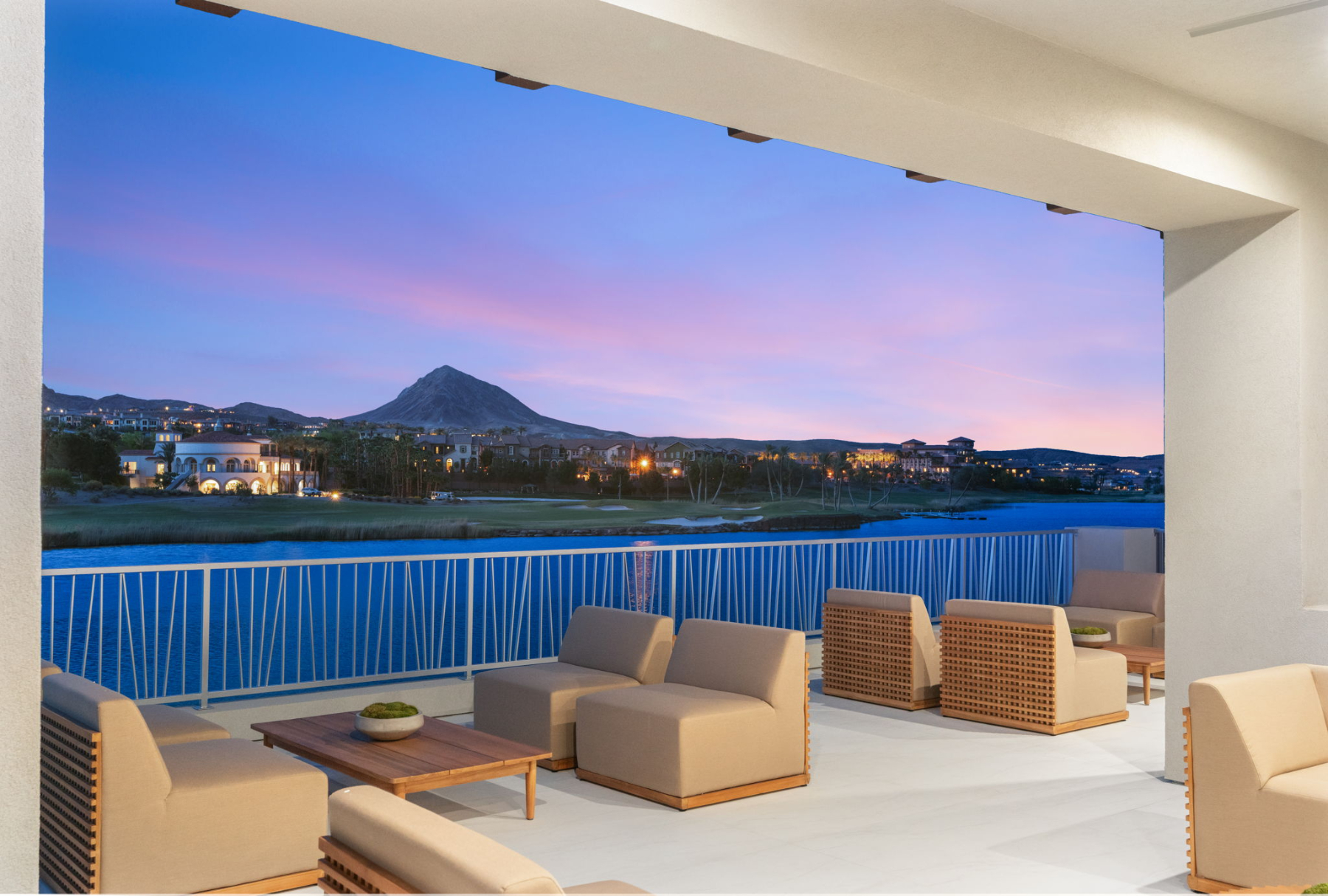 Spanning 5,857 square feet on a 0.31-acre homesite, this two-story estate is designed for both effortless entertaining and serene relaxation. Walls of disappearing pocket doors create a fluid transition between the sophisticated indoor living spaces and the expansive 2,000-square-foot patio, where you can lounge by the negative-edge saltwater pool and spa, taking in the tranquil beauty of the lake.