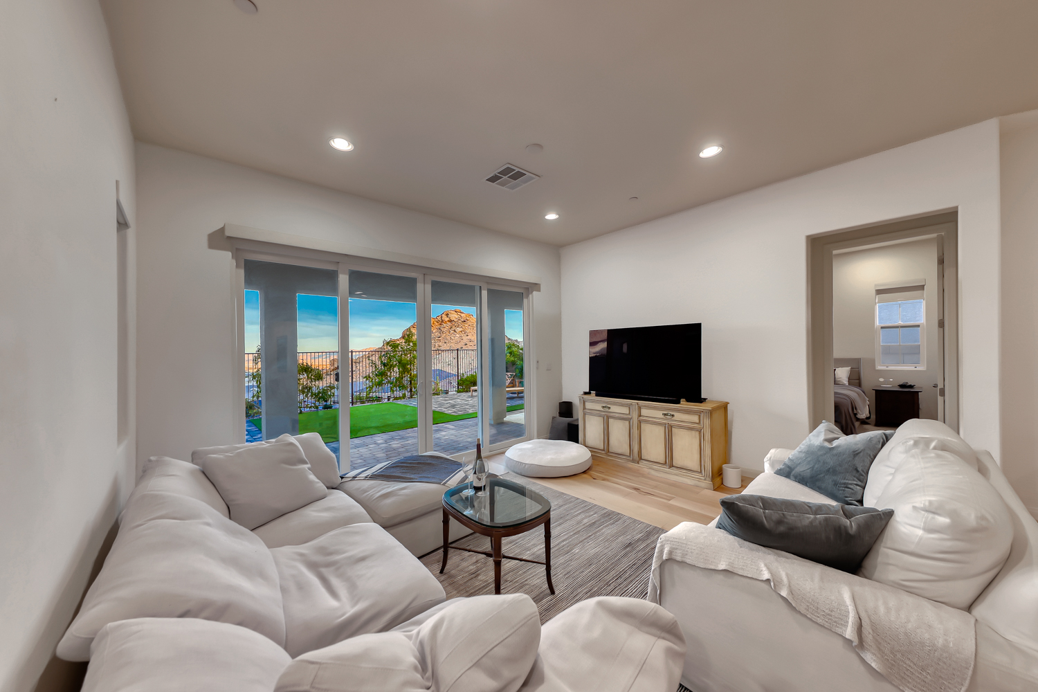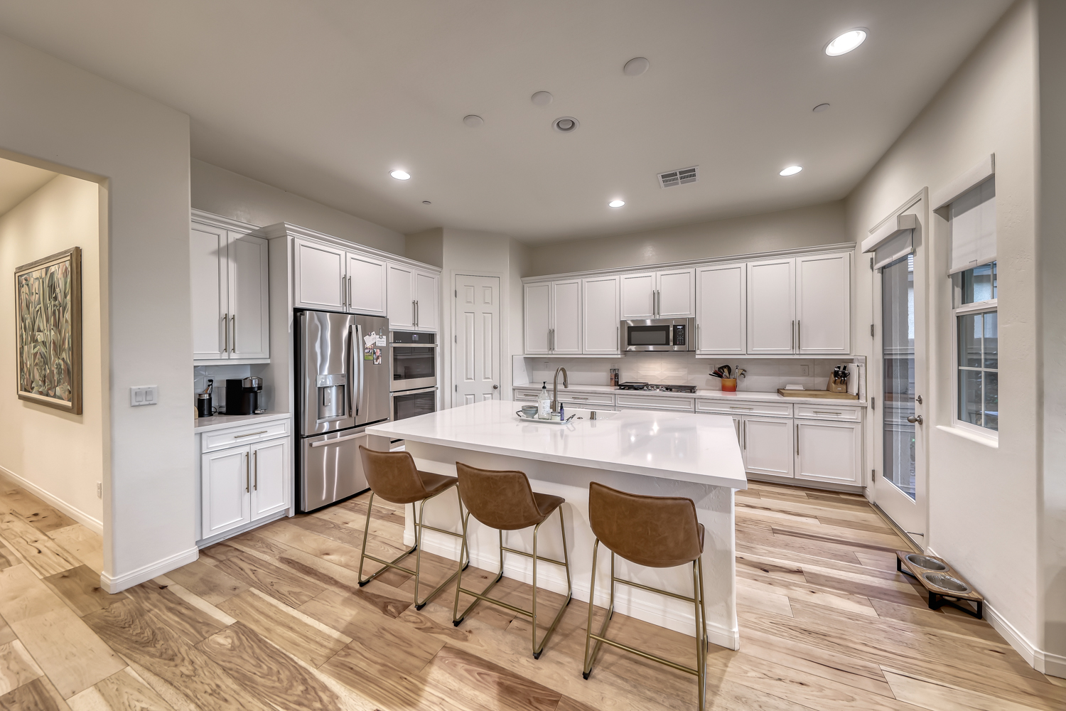 Inside, abundant natural light fills the open-concept layout, enhanced by expansive stacked sliding doors in the living room that create a seamless connection to the outdoors. The kitchen is both stylish and functional, featuring quartz countertops, stainless steel appliances, and a central island anchored by a wide farmhouse apron sink—ideal for everyday living and casual entertaining. The adjacent dining and living areas flow effortlessly, making the most of the home’s elevated setting and scenic backdrop.