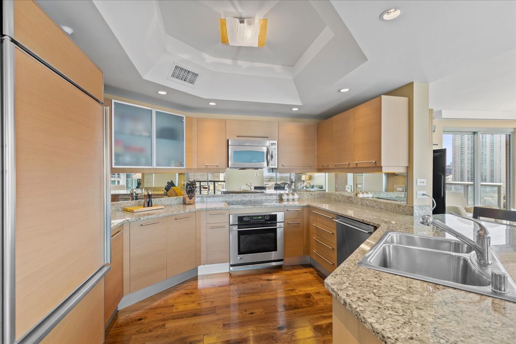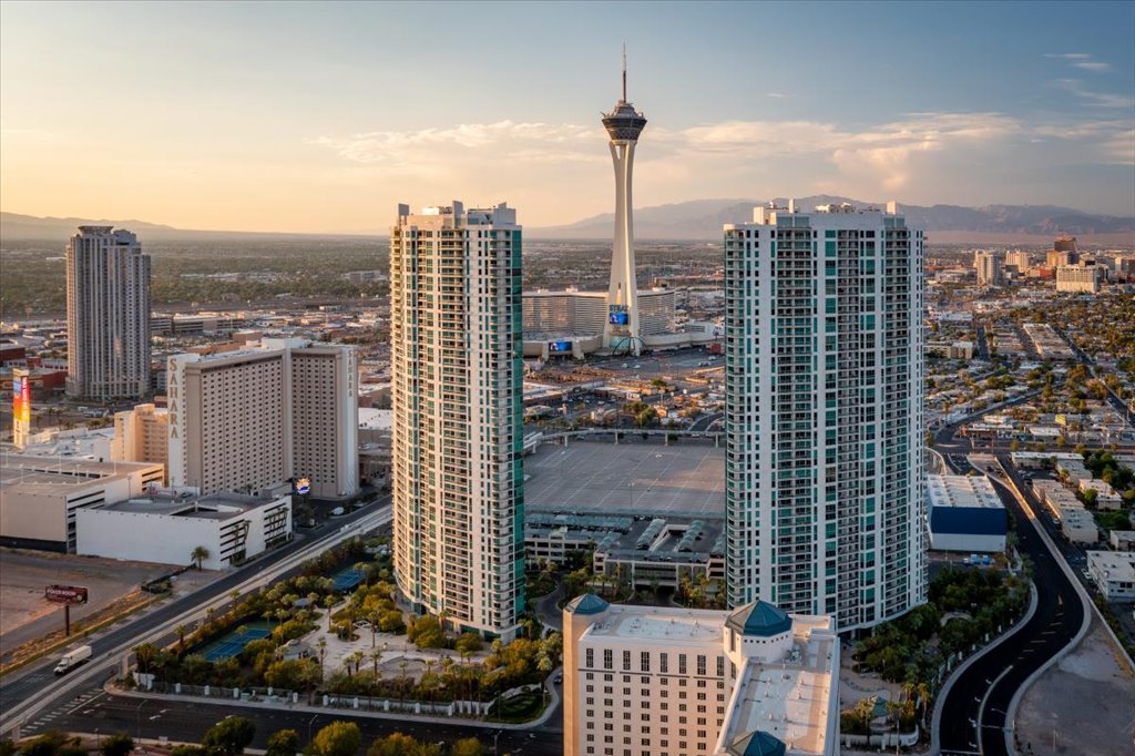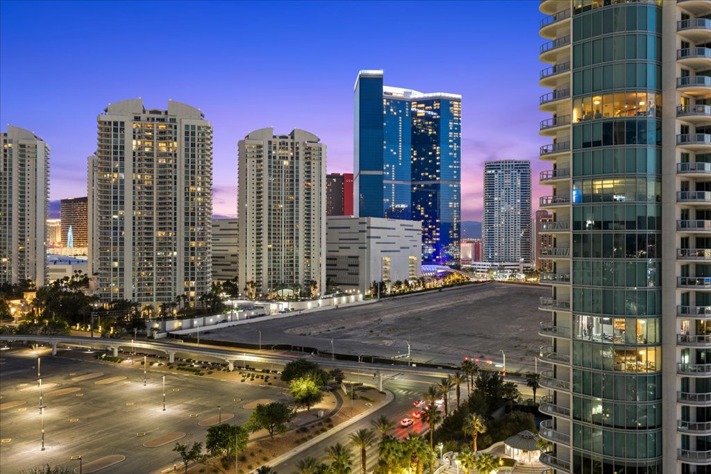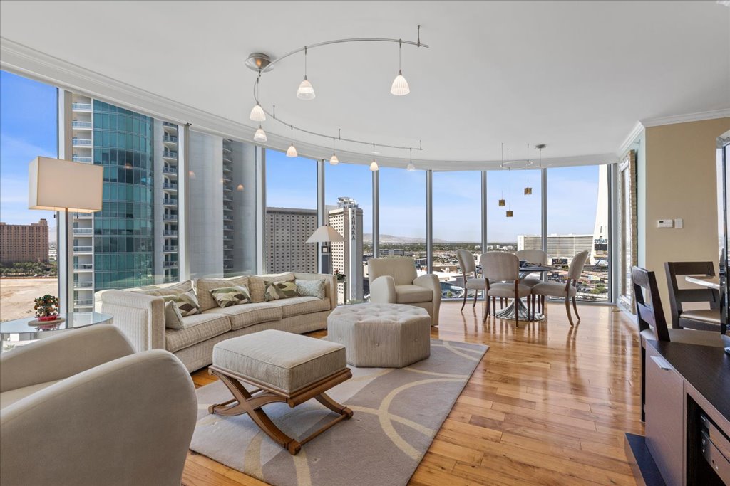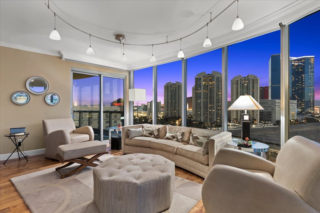 Residence 1608 at Turnberry Towers Las Vegas offers luxury high-rise living with panoramic views of the Las Vegas Strip, city skyline, and resort-style pool. This 2-bedroom + den, 2-bath condo features floor-to-ceiling windows, wood flooring, granite countertops, custom cabinetry, and stainless steel appliances.