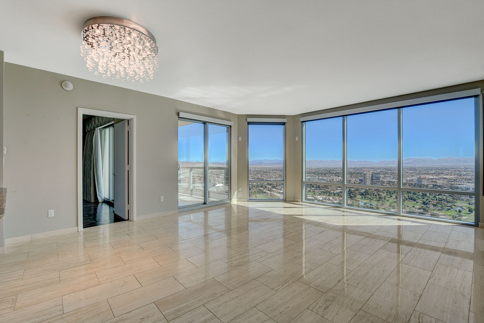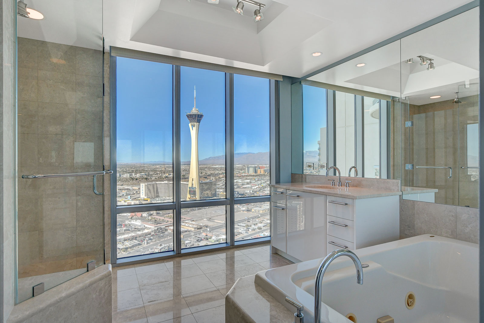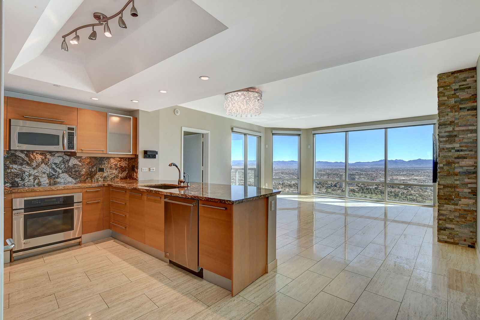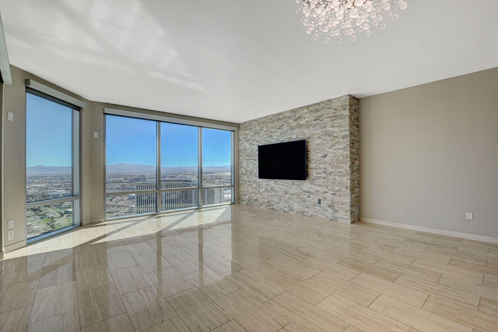 Perched on the 42nd floor of Turnberry Towers East, this exquisite 2-bedroom, 2-bath residence showcases breathtaking panoramic views of the Las Vegas Strip, Las Vegas Country Club Golf Course, and surrounding mountains through rare floor-to-ceiling windows not found on every level. This sought-after floor plan runs through the center of the tower, capturing both north and south exposures for stunning day-to-night vistas.