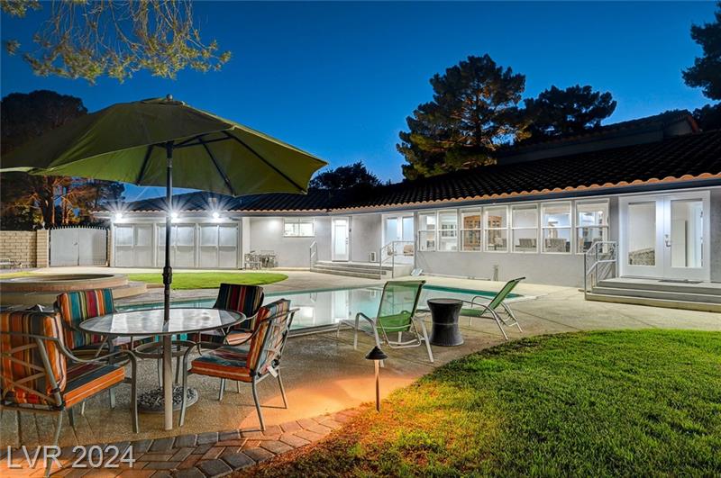 Expansive ceilings, and an abundance of light from the windows and doors invite you out to the lush, mature, manicured grounds, and back yard complete with a spa, and pool with a brand new cover to keep it warm and clean year round, a covered patio, and space to entertain. The primary suite boasts an office and custom closet, spa-like bathroom with huge shower, free-standing soaking tub, and separate toilets. Gorgeous next-gen guest house with separate entrance, heat, A/C, & water heater. This fully fenced home has an electronic gate, and room to entertain!