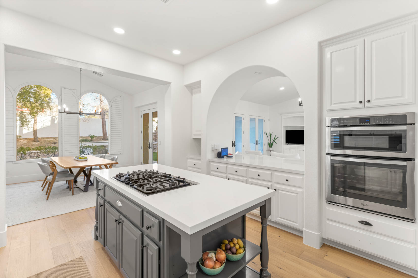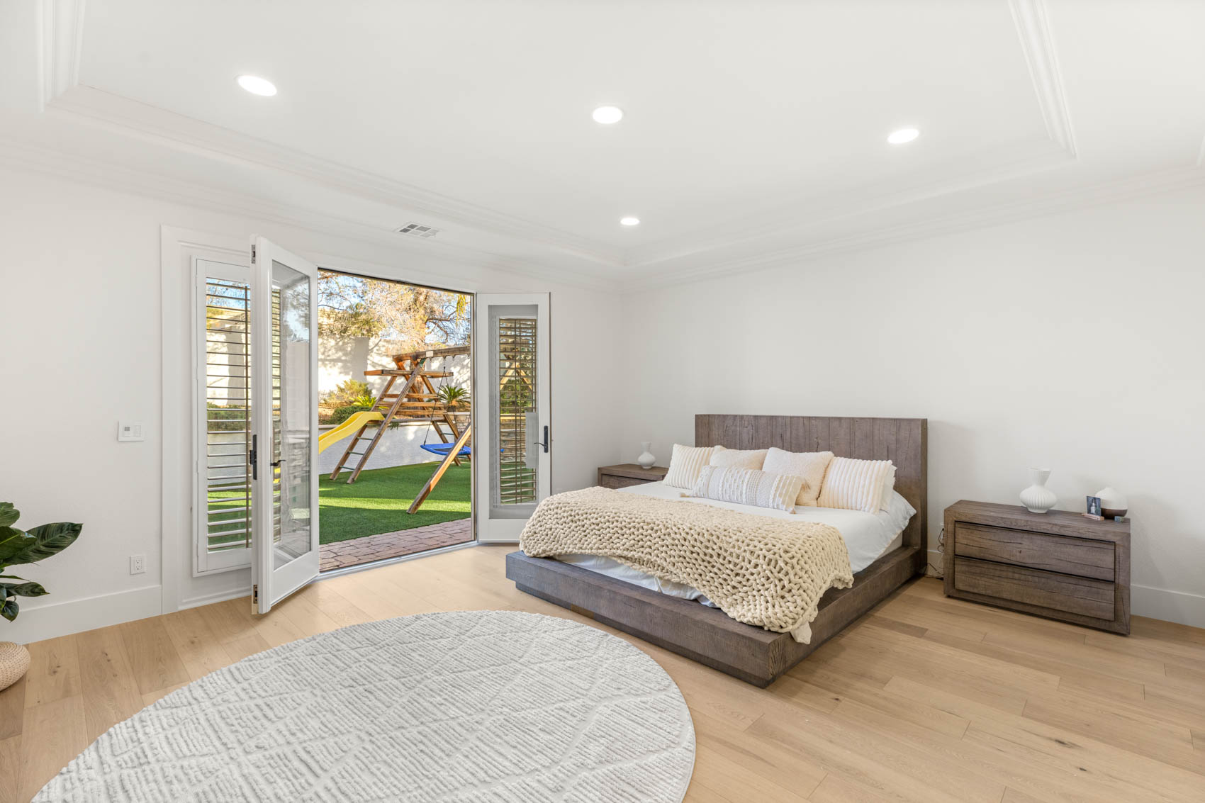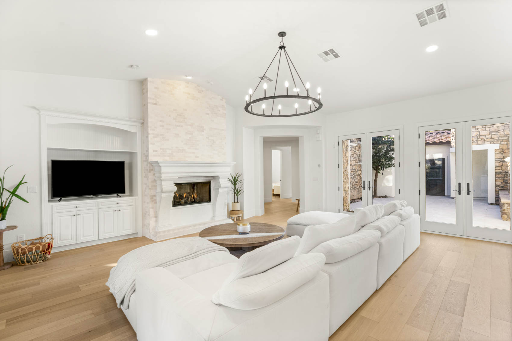 A tiled outdoor courtyard with a gas fireplace sets a warm, welcoming tone upon arrival—an ideal space for morning coffee or evening conversation. Inside, the home opens to a dramatic vaulted living room wrapped in five sets of French doors, each leading to outdoor spaces and filling the interior with abundant natural light. White oak hardwood floors, upgraded interior doors, fresh interior and exterior paint, and curated designer lighting elevate the home with a clean, sophisticated aesthetic that feels both current and enduring.