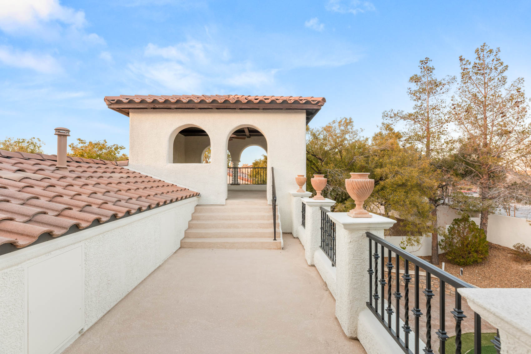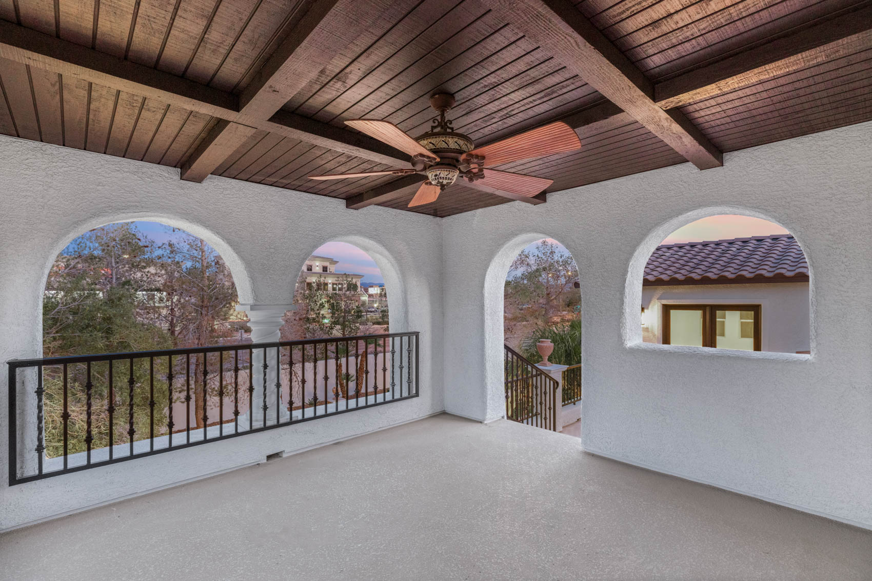 Designed to live like a single-story, the main level hosts the primary suite and two guest bedrooms, making everyday living both comfortable and convenient. The expansive primary suite is a true retreat, featuring spa-inspired finishes including floating vanities, an updated walk-in shower, a freestanding soaking tub, and a smart toilet. An oversized custom walk-in closet with a center island adds both luxury and functionality, offering ample storage and thoughtful organization. The two additional downstairs bedrooms provide flexibility for guests, family, or a home office, each well-positioned for privacy and ease of use. Upstairs, a large multi-purpose space with a full bathroom offers endless possibilities—perfect as a media room, home gym, office, or guest suite. A private balcony opens to a charming loggia overlooking the backyard, adding another layer of indoor-outdoor living. Outside, the private backyard is designed for both relaxation and entertaining. There is generous space for outdoor activities, complemented by an outdoor kitchen, tranquil water feature, and thoughtfully designed landscaping. The side yard includes raised planter beds, ideal for gardening enthusiasts or those who appreciate fresh herbs and seasonal plantings. With its bright, open layout, high-end updates, and seamless connection to outdoor living, this move-in ready home offers a rare opportunity to enjoy comfort, style, and privacy within the gates of Southern Highlands Golf Club.