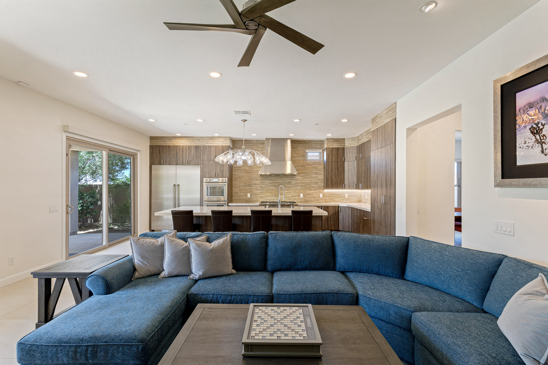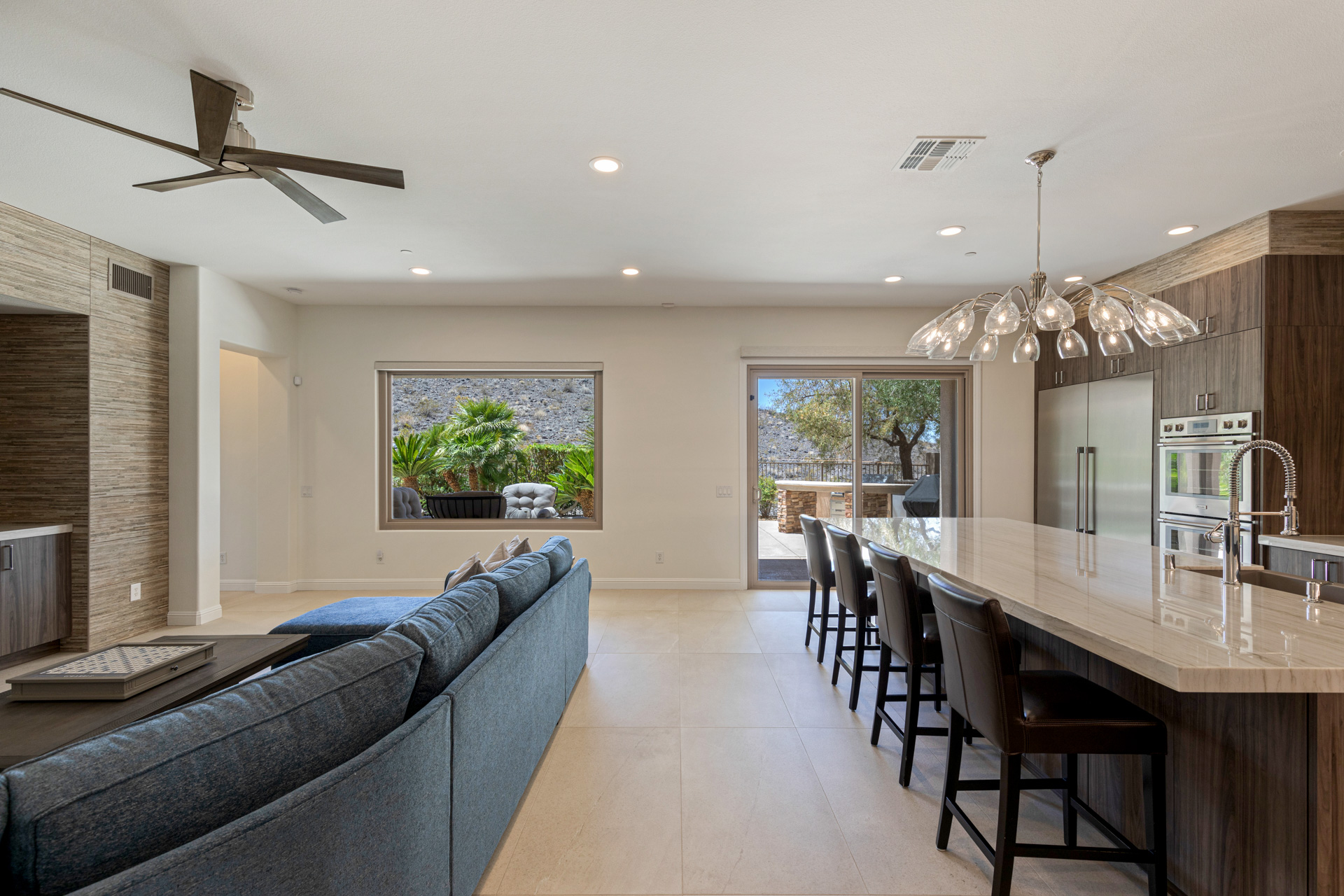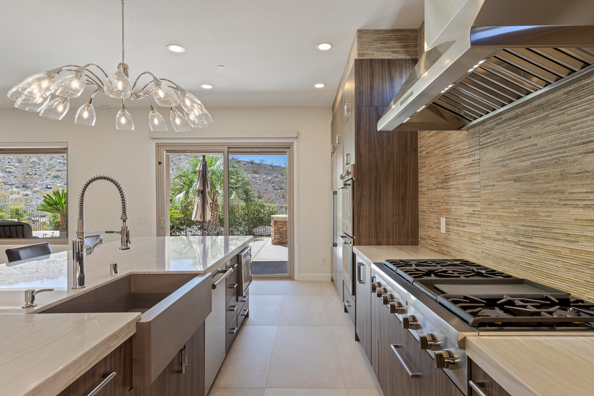 The exquisite chefās kitchen with enormous island and Thermador luxury appliances is open to the family room. Large format porcelain tile floorings, dramatic accent walls and all new Milgard windows & sliders, including picture/viewing windows/ Polar shades add character throughout. Epoxy finished garages with new RO system/tankless water heater/ water softener with custom cabinets in the secondary garage compliment the interior upgrades.
