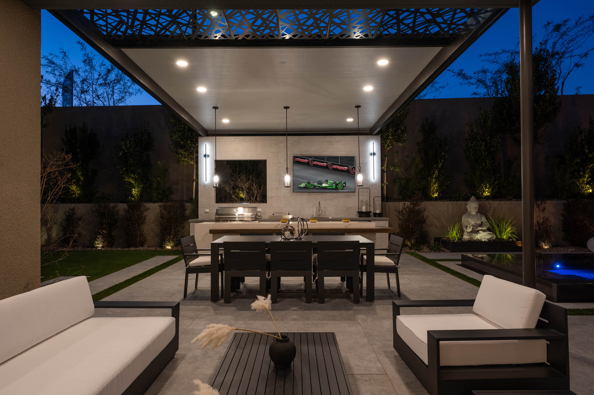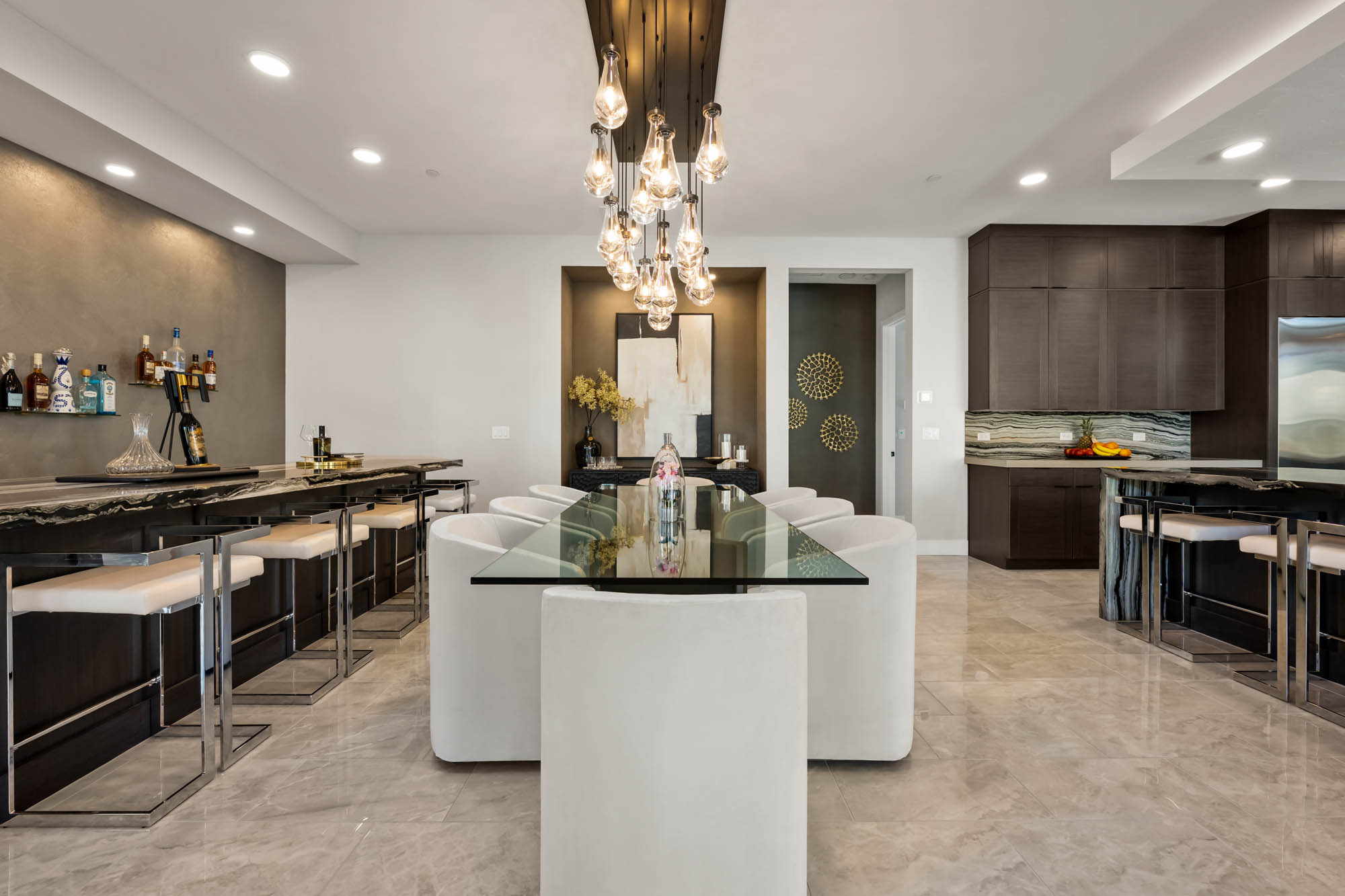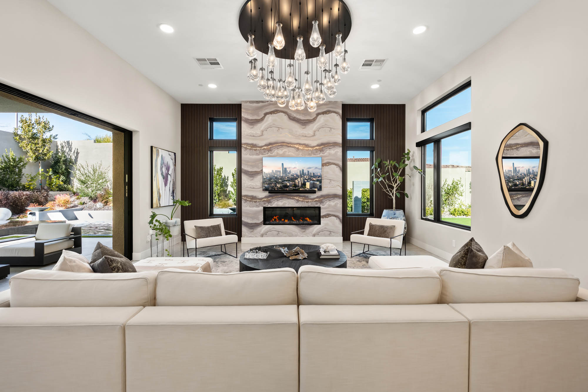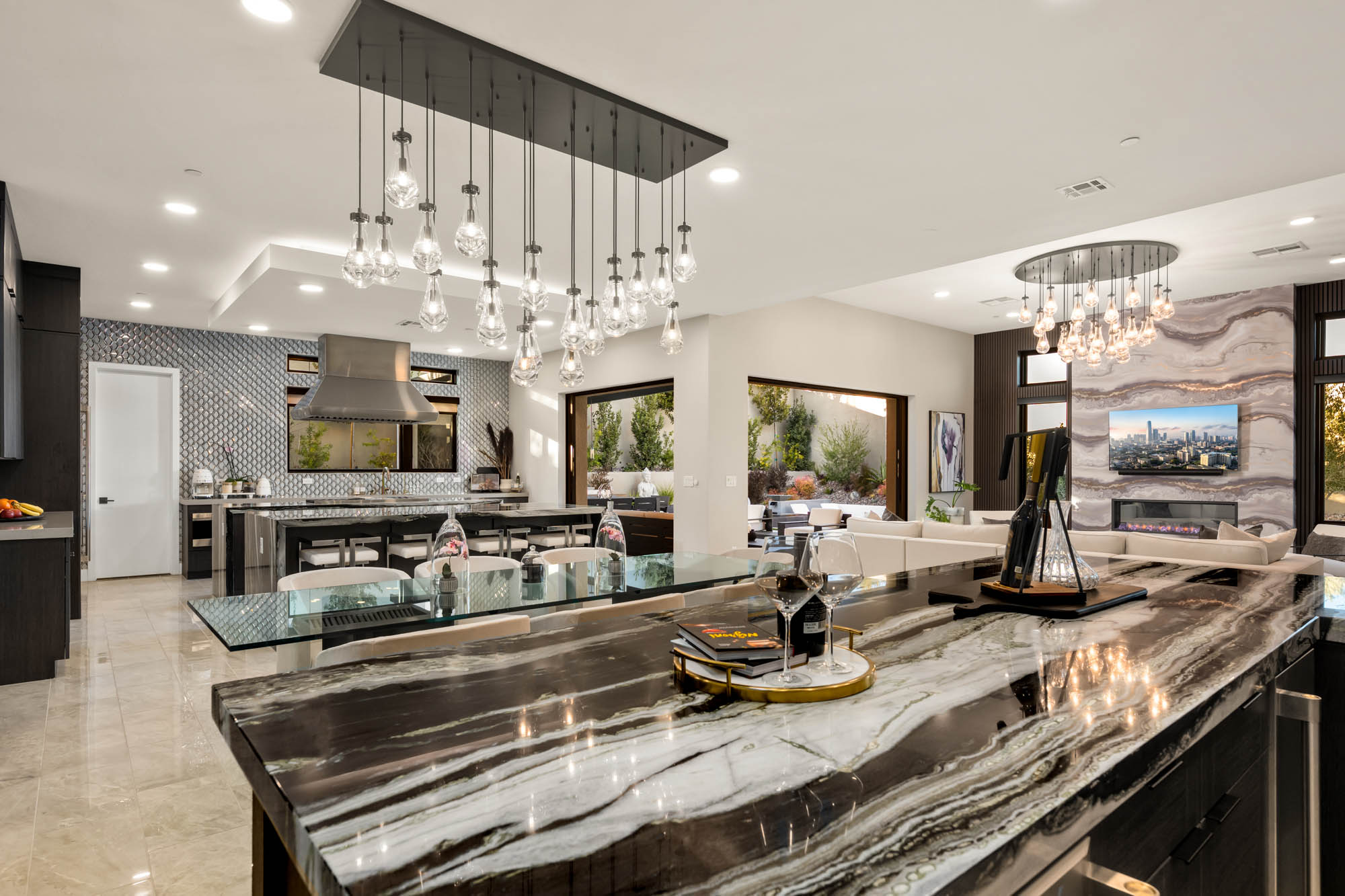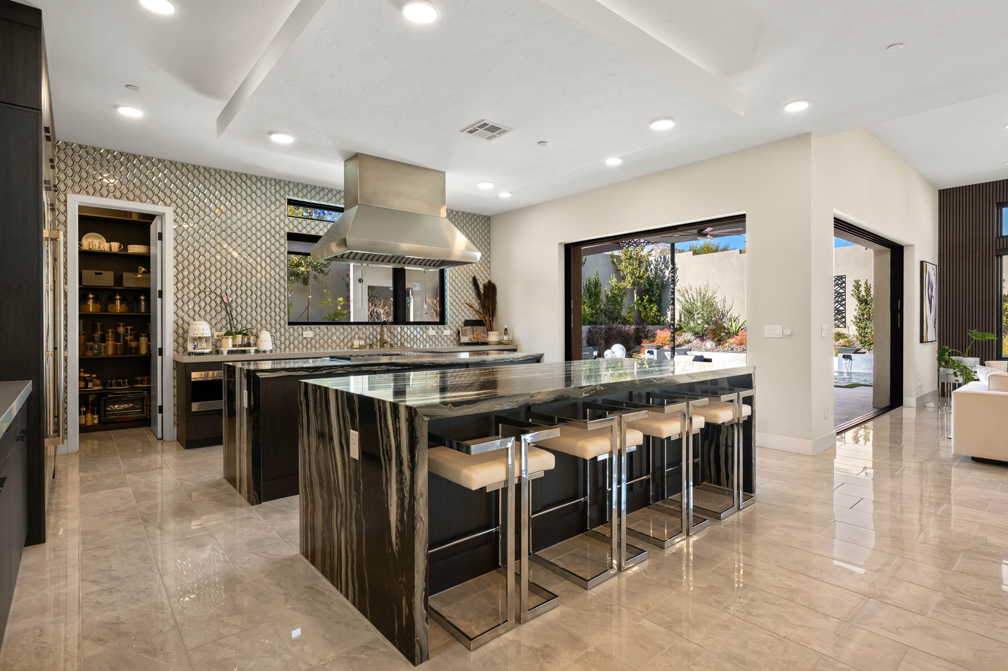 The dream kitchen is a chefās paradise, featuring a double island, marble countertops, and top-tier Wolf and Sub-Zero appliances. Fully custom built cabinets and closets provide exceptional storage and organization throughout the home. Pocketing doors seamlessly blend indoor and outdoor living, leading to a resort-style backyard oasis complete with a sparkling pool, tranquil water features, and a covered pavilion with a fully equipped outdoor kitchenāperfect for entertaining in true luxury.