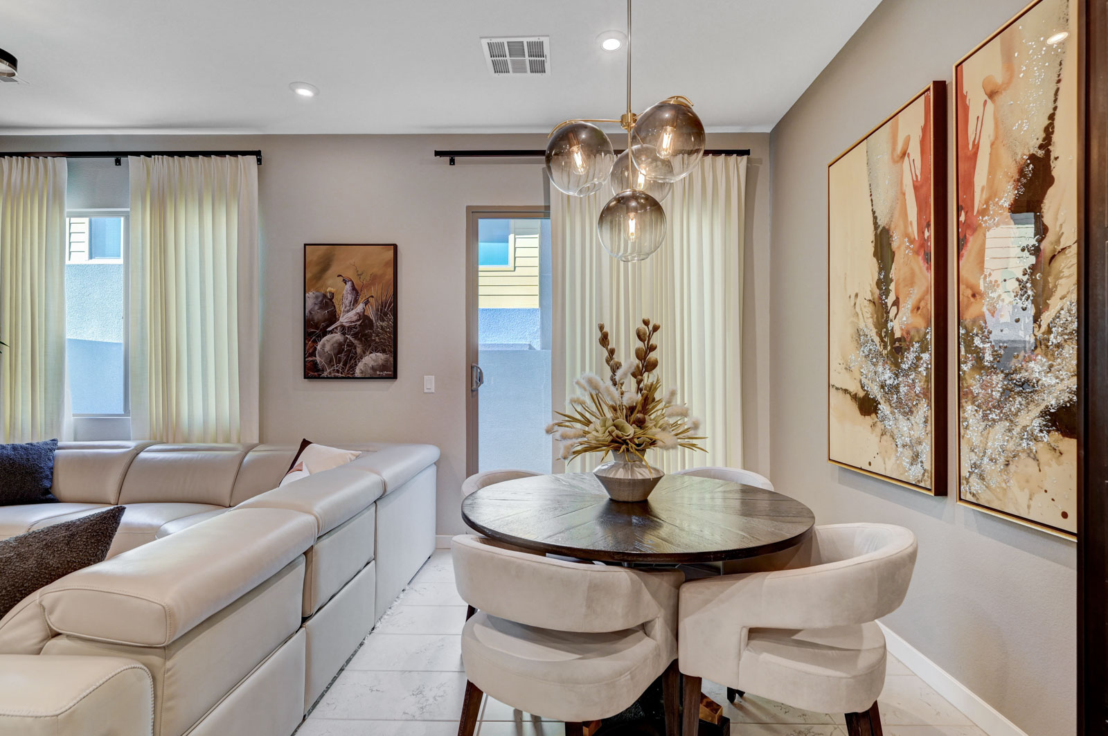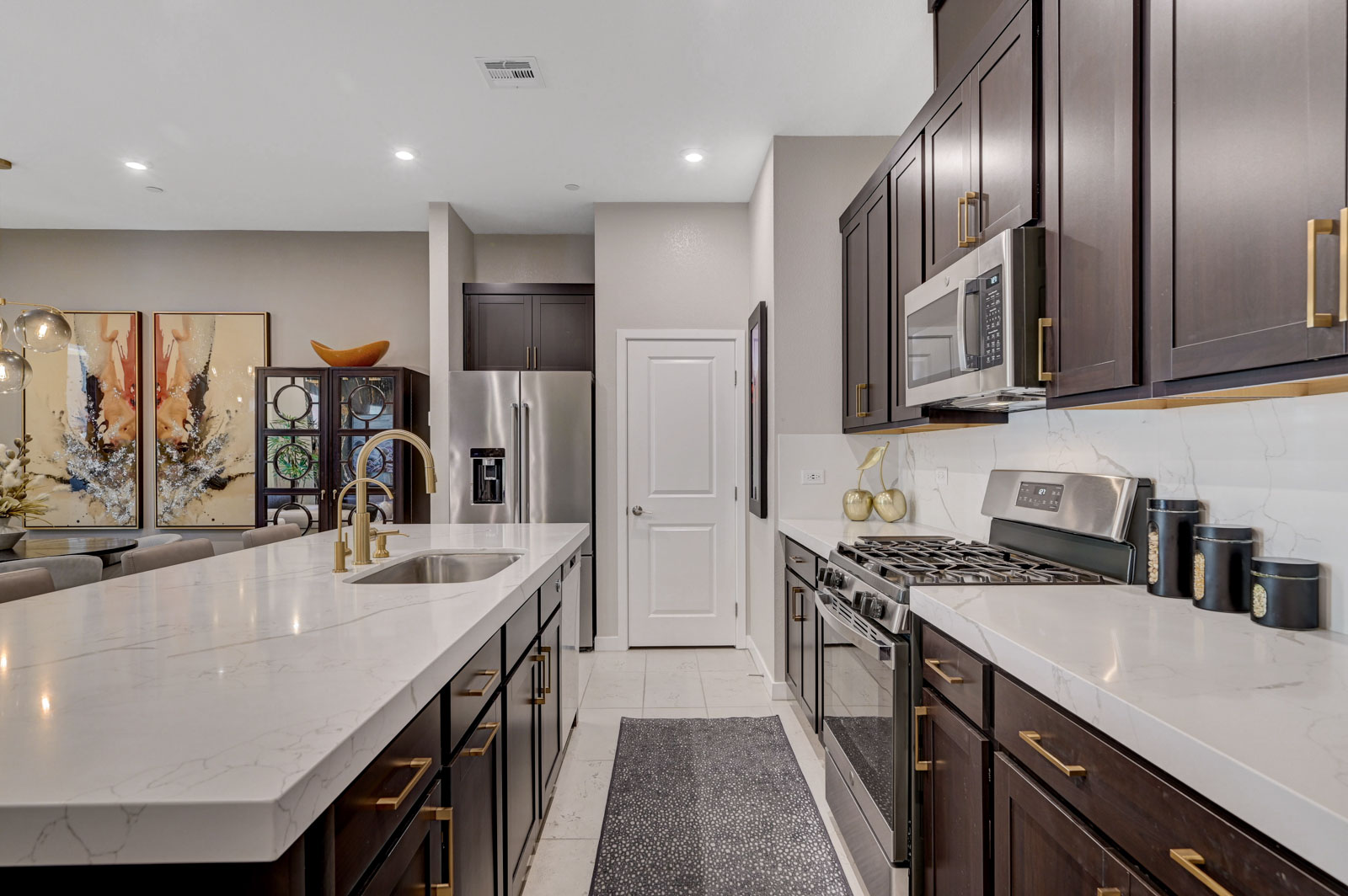 Set within the heart of Inspirada, 3350 Via Strada St offers a refined blend of modern design and everyday comfort. This highly upgraded 2-bedroom, 2.5-bath residence with a 2-car garage is curated with elevated finishes throughout. Designer tile flooring anchors the main level and baths, while quartz countertops, a striking gold kitchen faucet, stainless steel appliances, and custom lighting create a sophisticated culinary space.