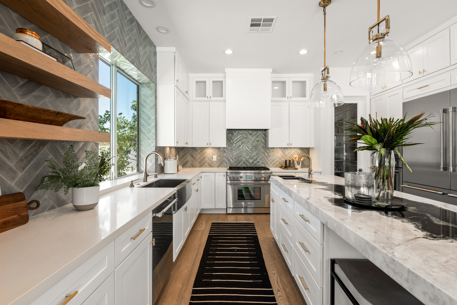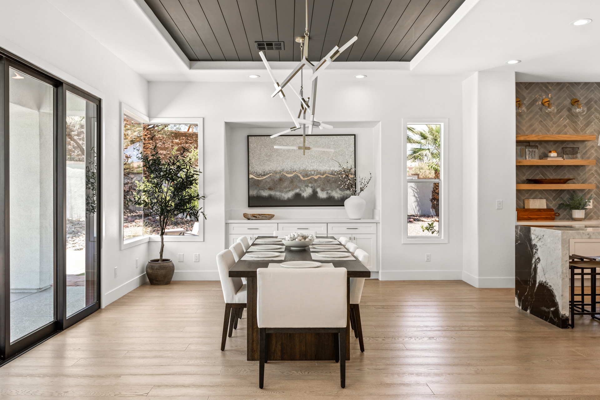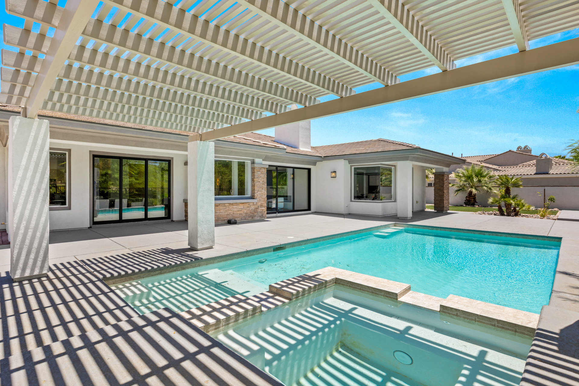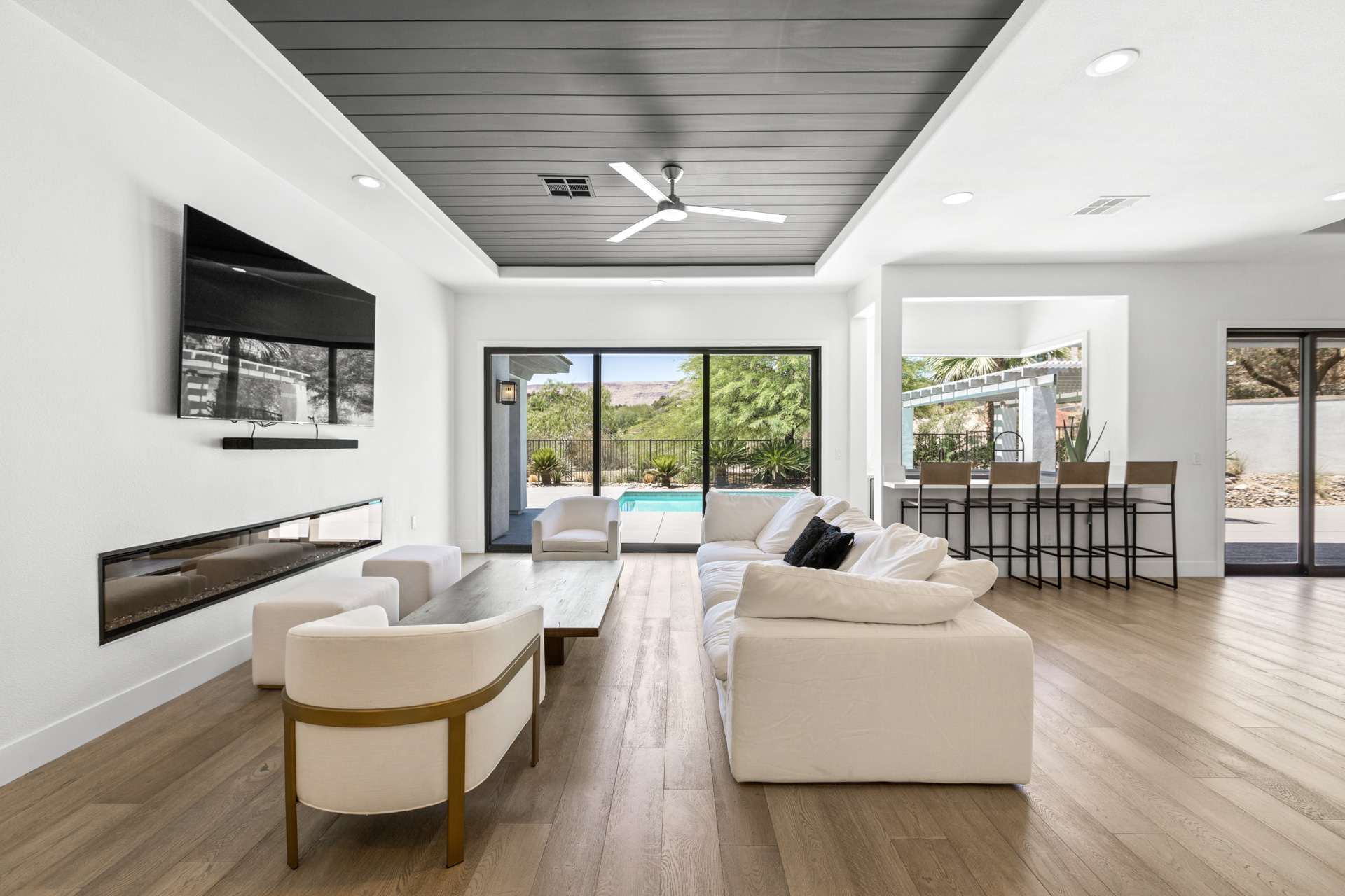 Throughout the home are whitewashed oak floors, and the main great room has a modern fireplace warming up the spacious living area and welcoming views of the golf course through the stackable sliding glass doors to the backyard, steps away from the wet bar with wine fridge into the dining area which also has its set of stackable sliding doors leading to the pool area and backyard. The designer kitchen has a large marble island with a waterfall edge, and custom cabinets stacked to the ceiling, and open shelving. Massive 60" stainless steel refrigerator and appliances. Many more high-end finishes and amazing light fixtures in this home make it a must-see for yourself.