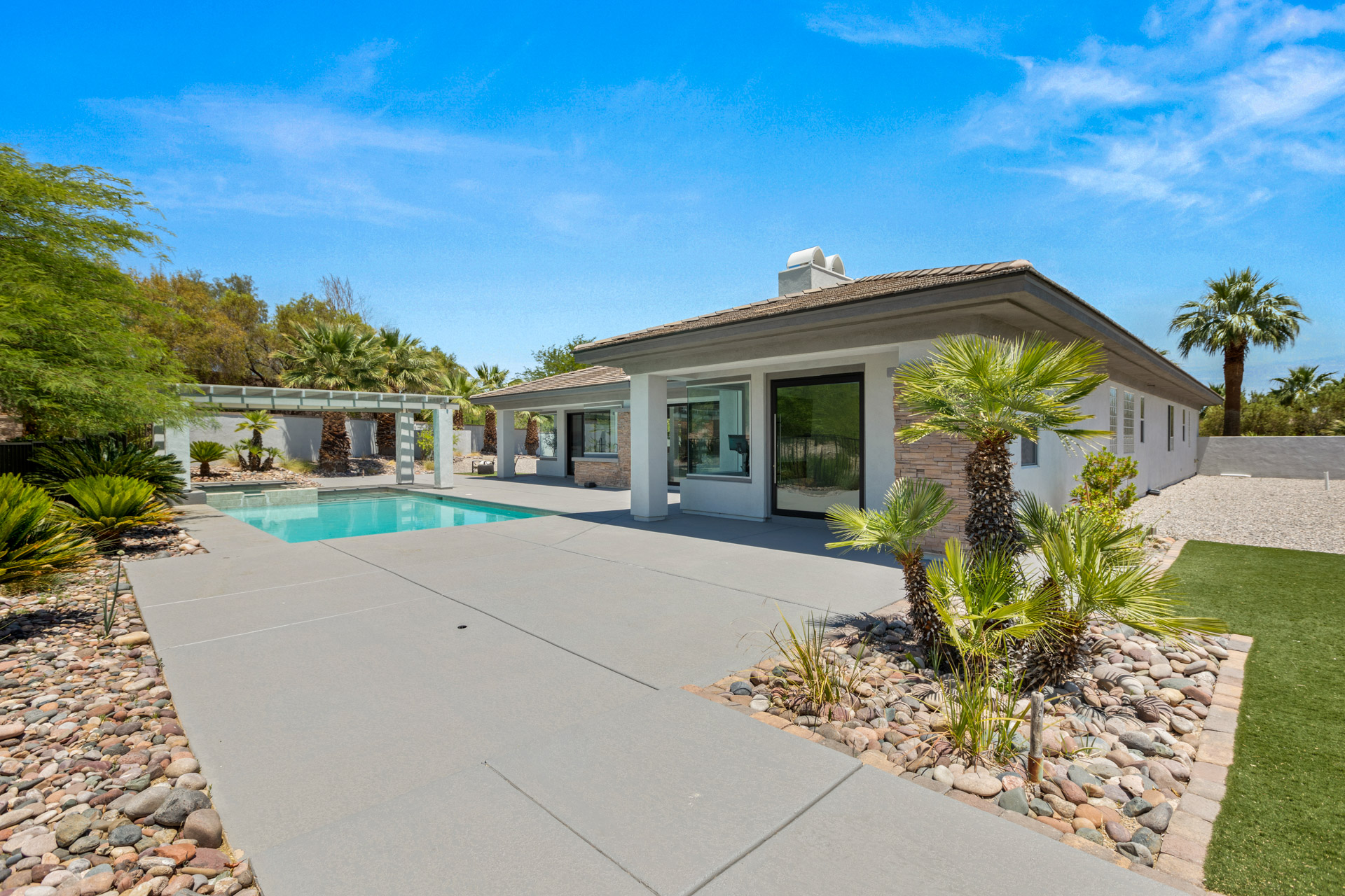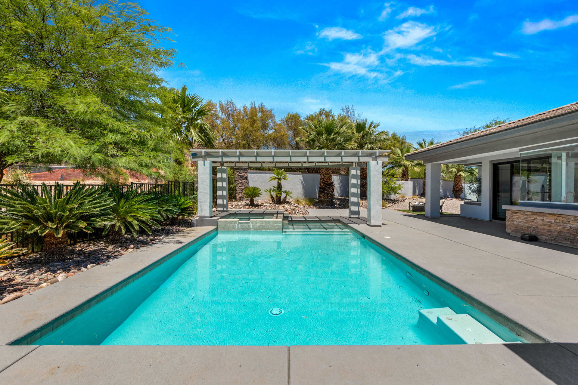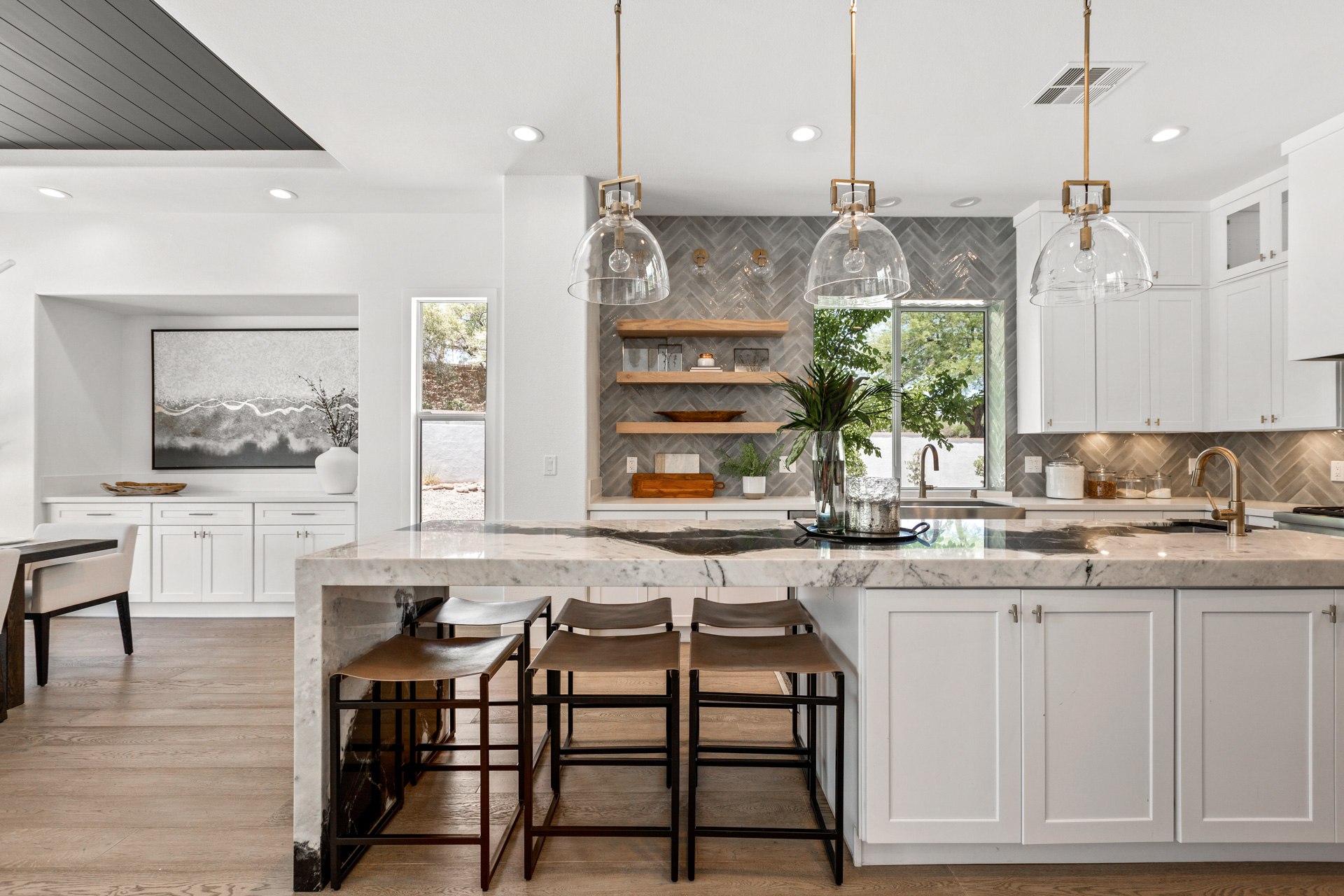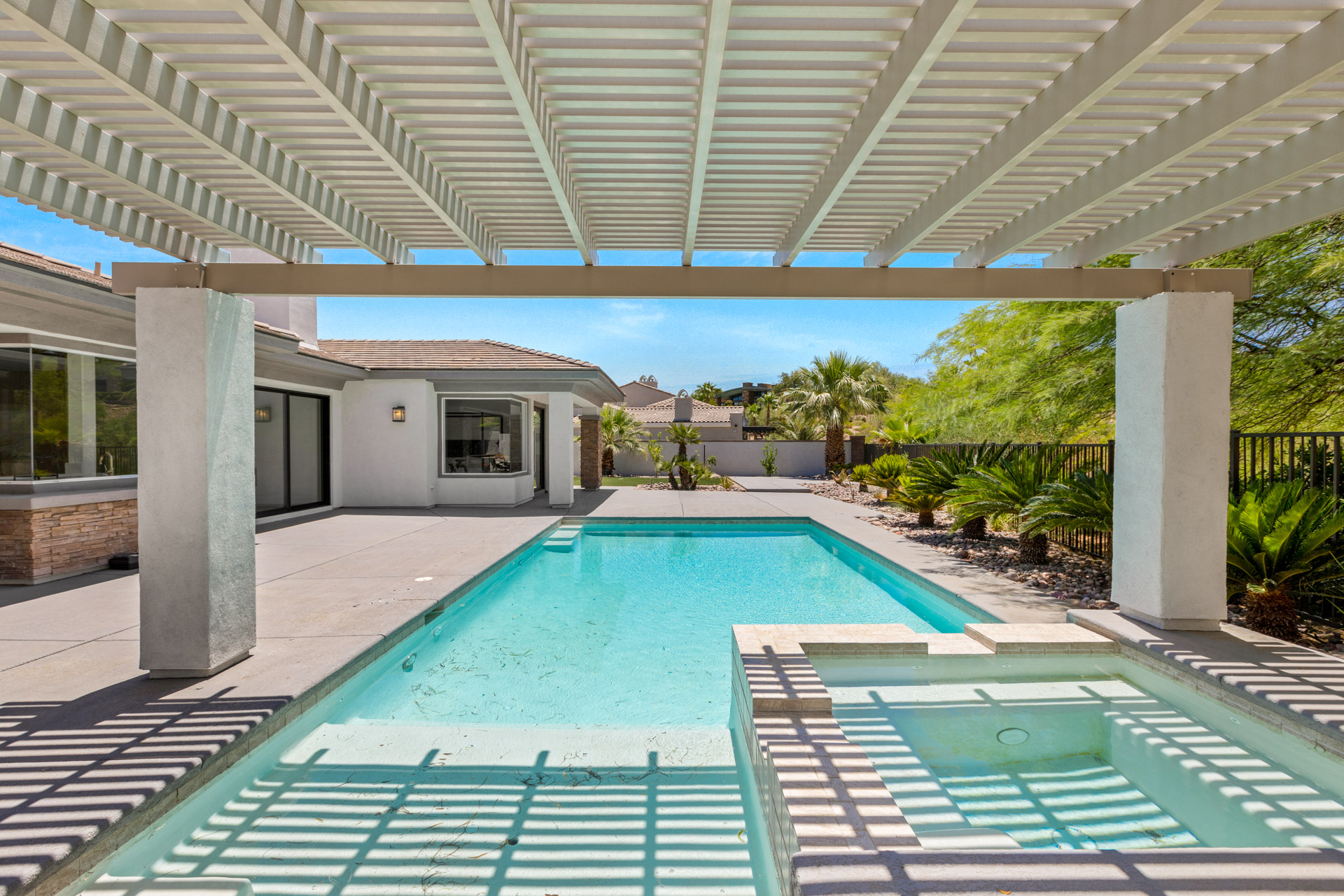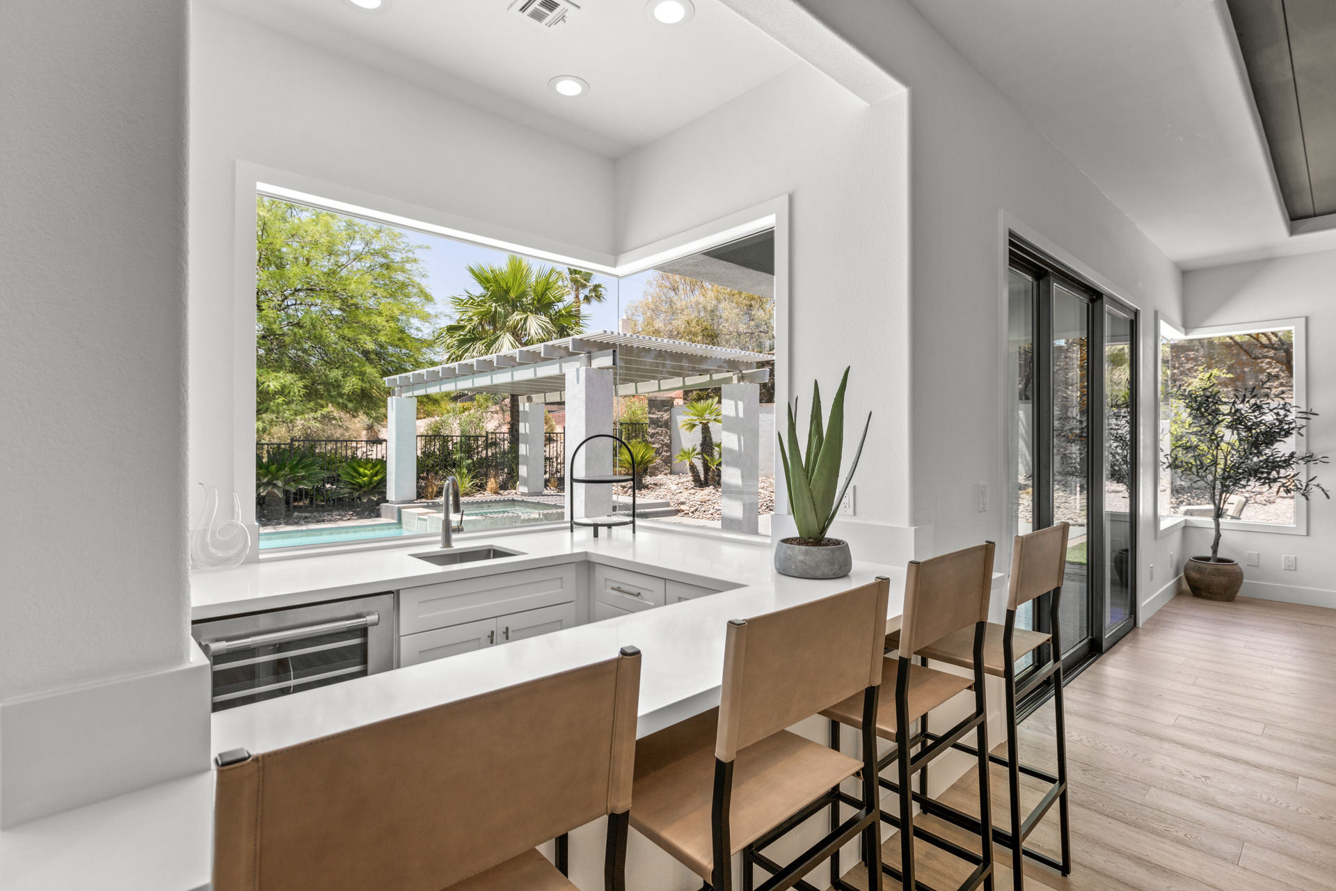 Incredible attention to detail, this remodeled single-story four-bedroom/five-bath home is a renovated Ocotillo model in the west gate of Red Rock Country Club. Once you enter the front gates to the courtyard, you enter the home through a large glass framed front door into the open floorplan.