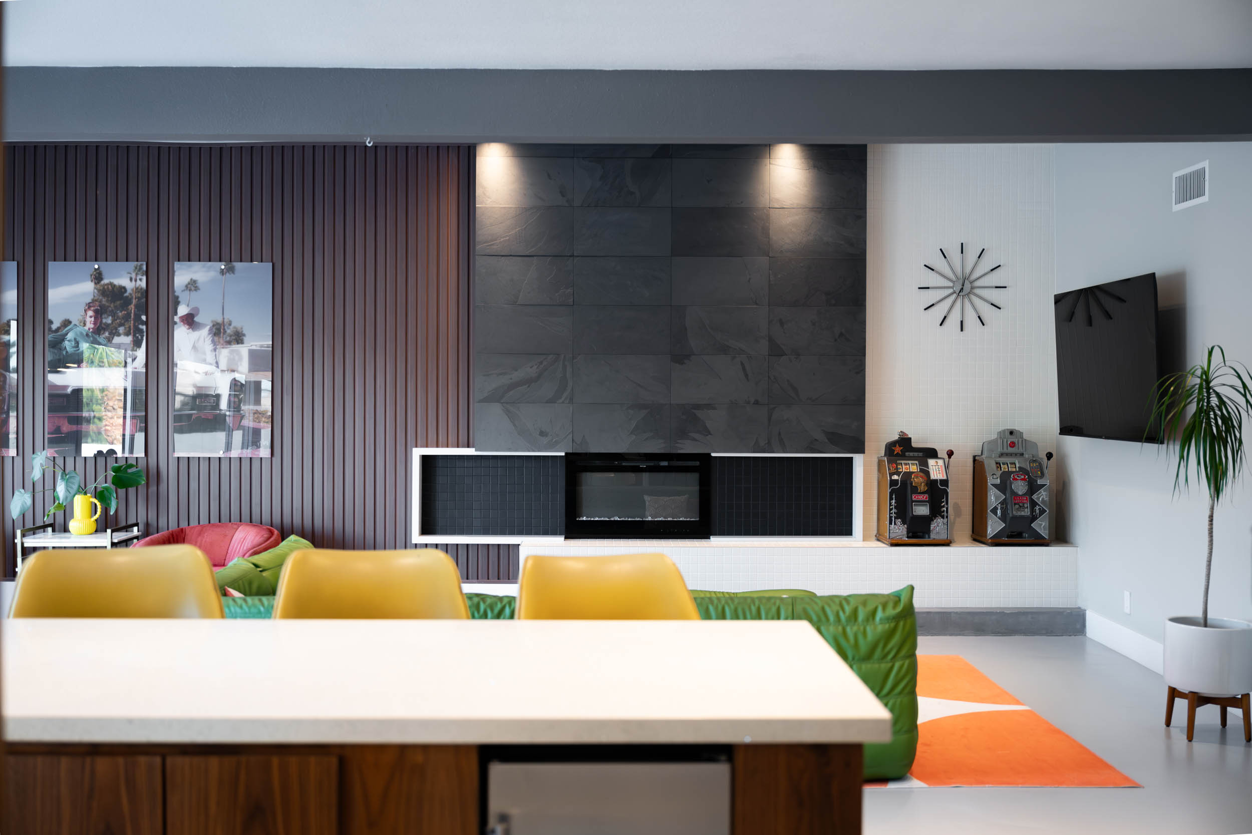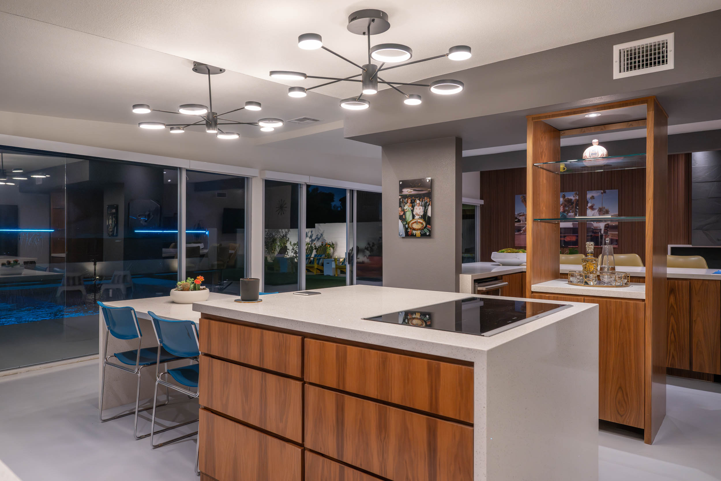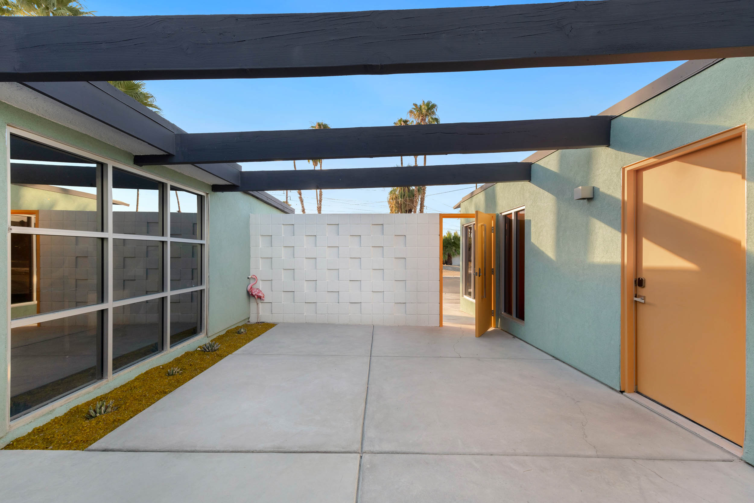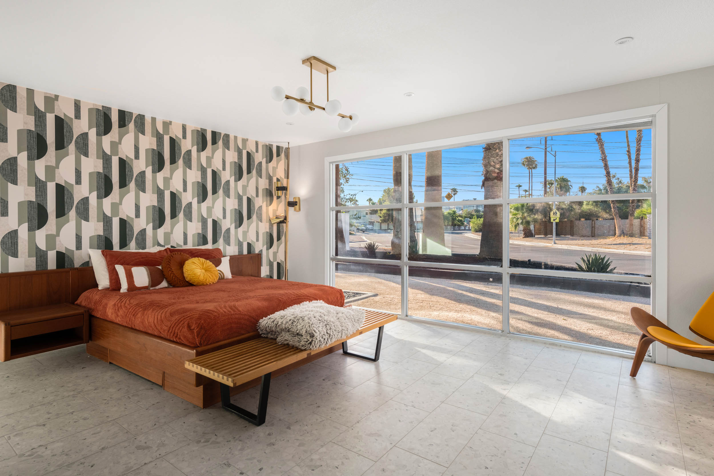 Mid-Century Modern - Historic Paradise Palms featured in Atomic Ranch Magazine Fall 2024! Designed by renowned Architects Palmer and Krisel, boasts an iconic butterfly roof + MCM design. Impeccably restored inside and out, 2,892 sq ft offers 3 spacious bedrooms + 3.5 elegant baths, incl 2 primary suites, w/ en-suite bathrooms and outdoor access. Discover custom walnut cabinets, terrazzo tile, and polished stained concrete throughout.