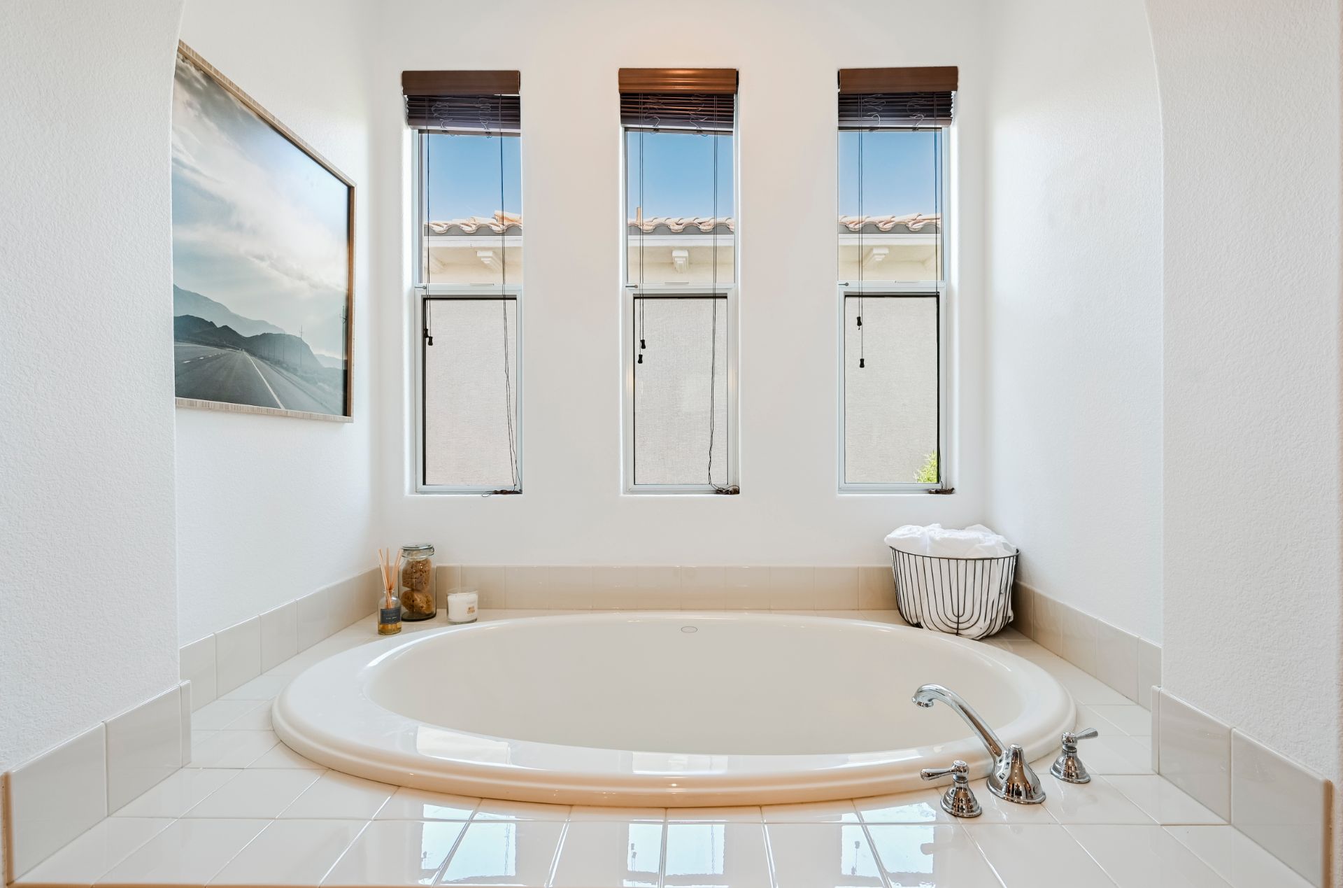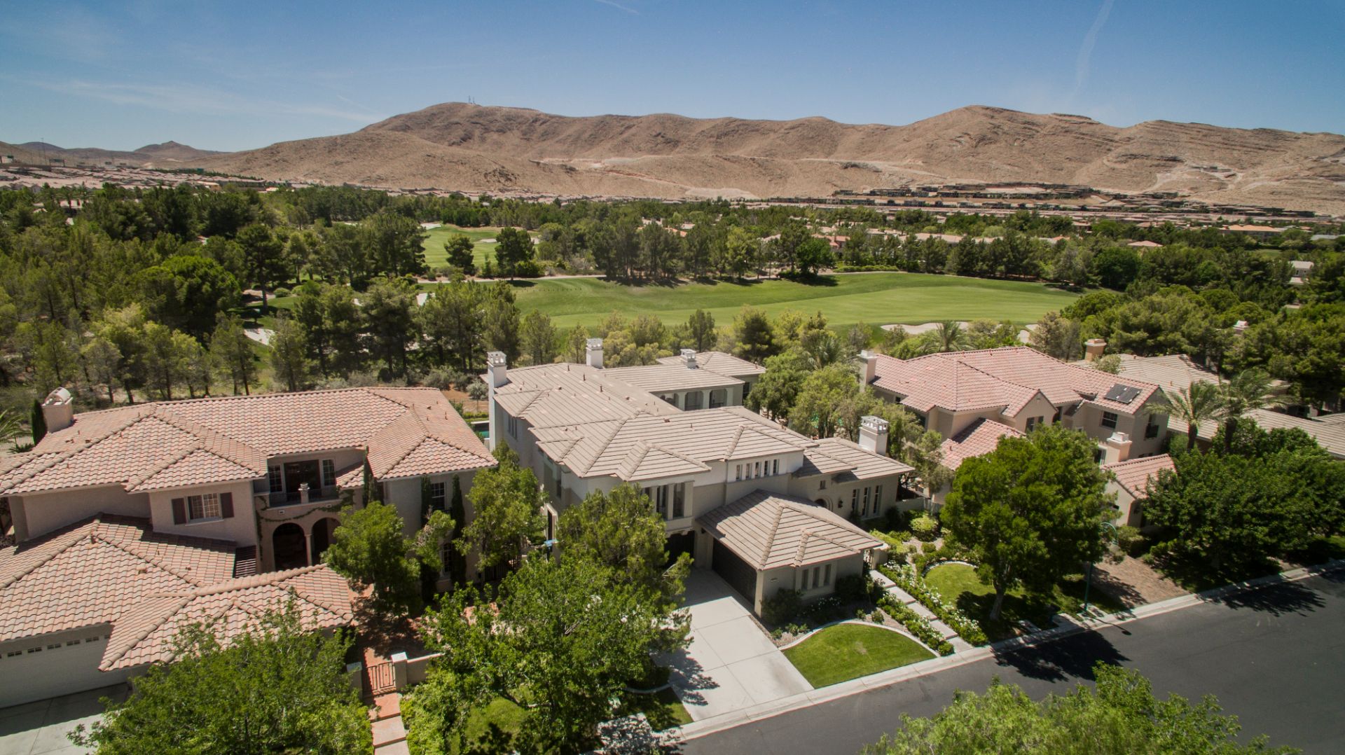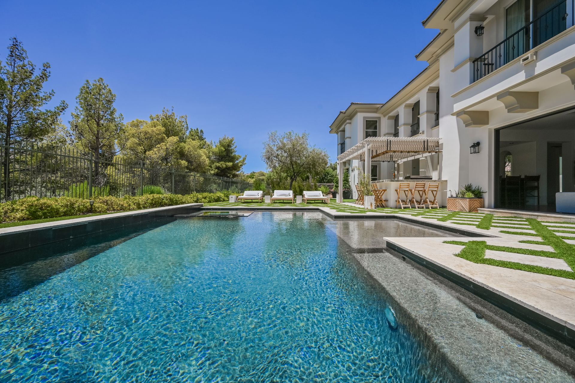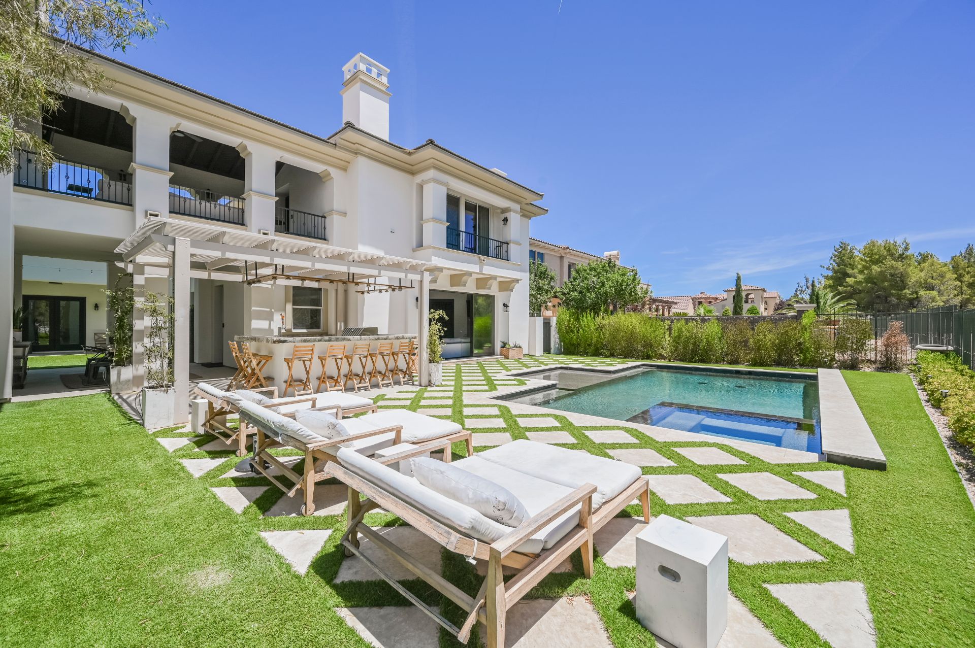 A unique contemporary set on a wonderful golf course lot in Southern Highlands offers interior living space opens to an outdoor courtyard via sliding window walls. This five-bedroom, six-bath home features a completely remodeled pool and patio complex, with a full outdoor kitchen and trendy outdoor fireplace lounging area as well. Impressively styled, but designed for low maintenance, the outdoor living spaces are compact and nicely zoned for various activities.