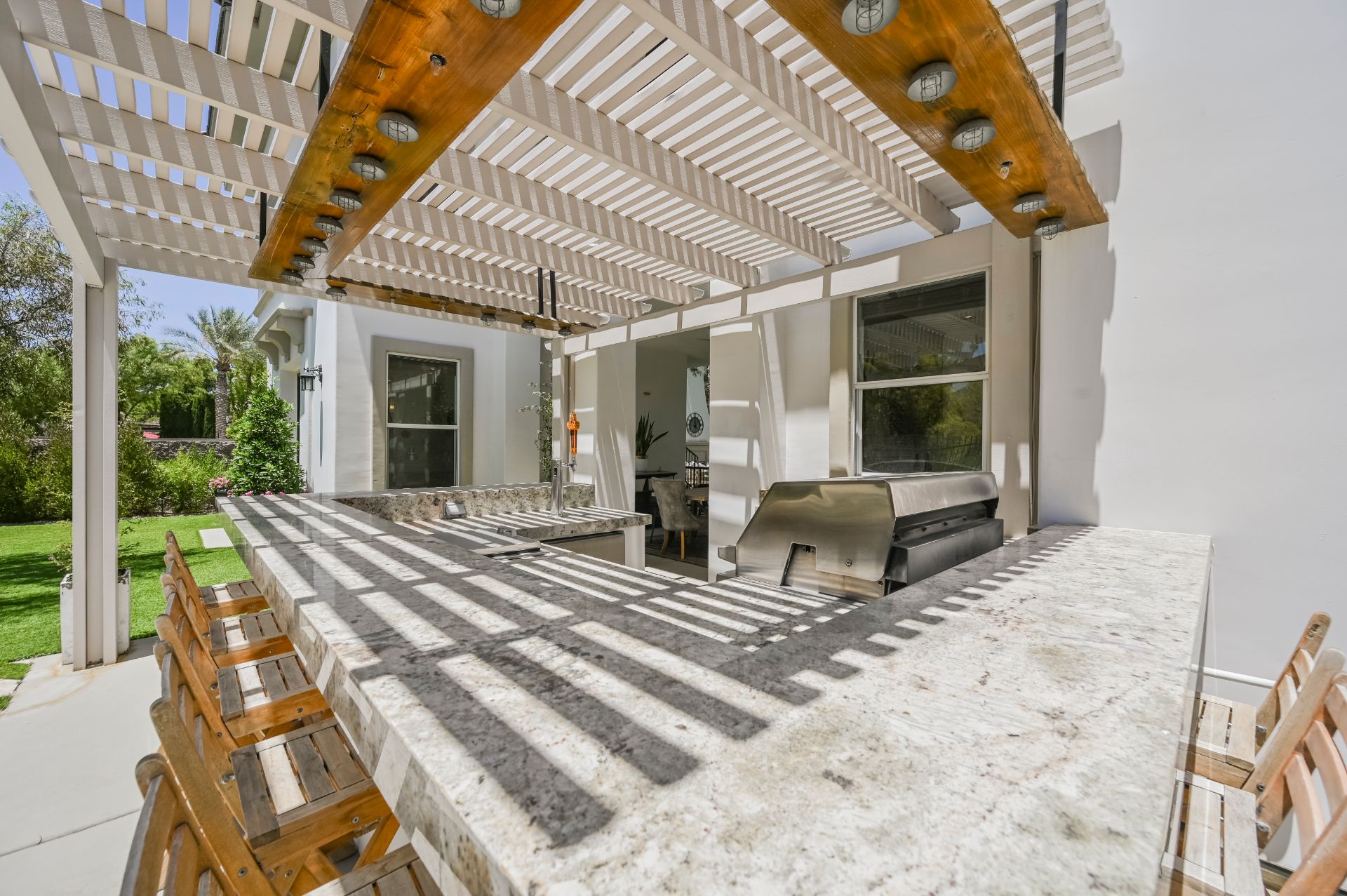 Dark floors and wrought iron stair railings provide a traditional touch, while multiple sets of French doors bring the outside in. Dark cabinets contrast beautifully with white kitchen counters and open shelving, while a wood countertop brings charm to the thoroughly functional bar. The family room with sliding glass doors leads to the beautiful pool and golf views. The outdoor areas are spacious and include a large courtyard with fireplace, a putting green, a fabulous outdoor bar area, plus upstairs find an open veranda off the second-floor master bedroom. Dual casitas. 4-car garage.