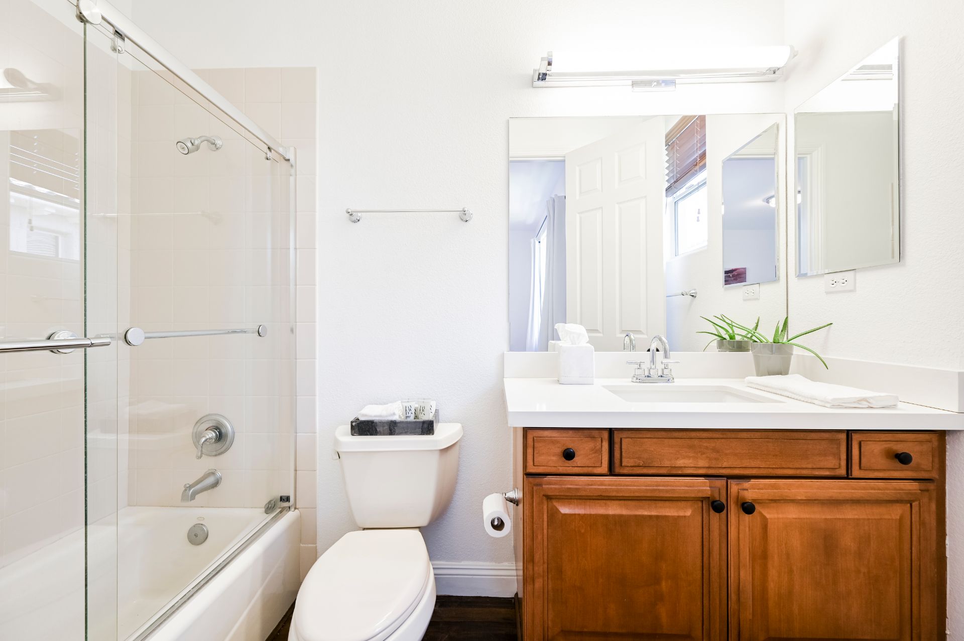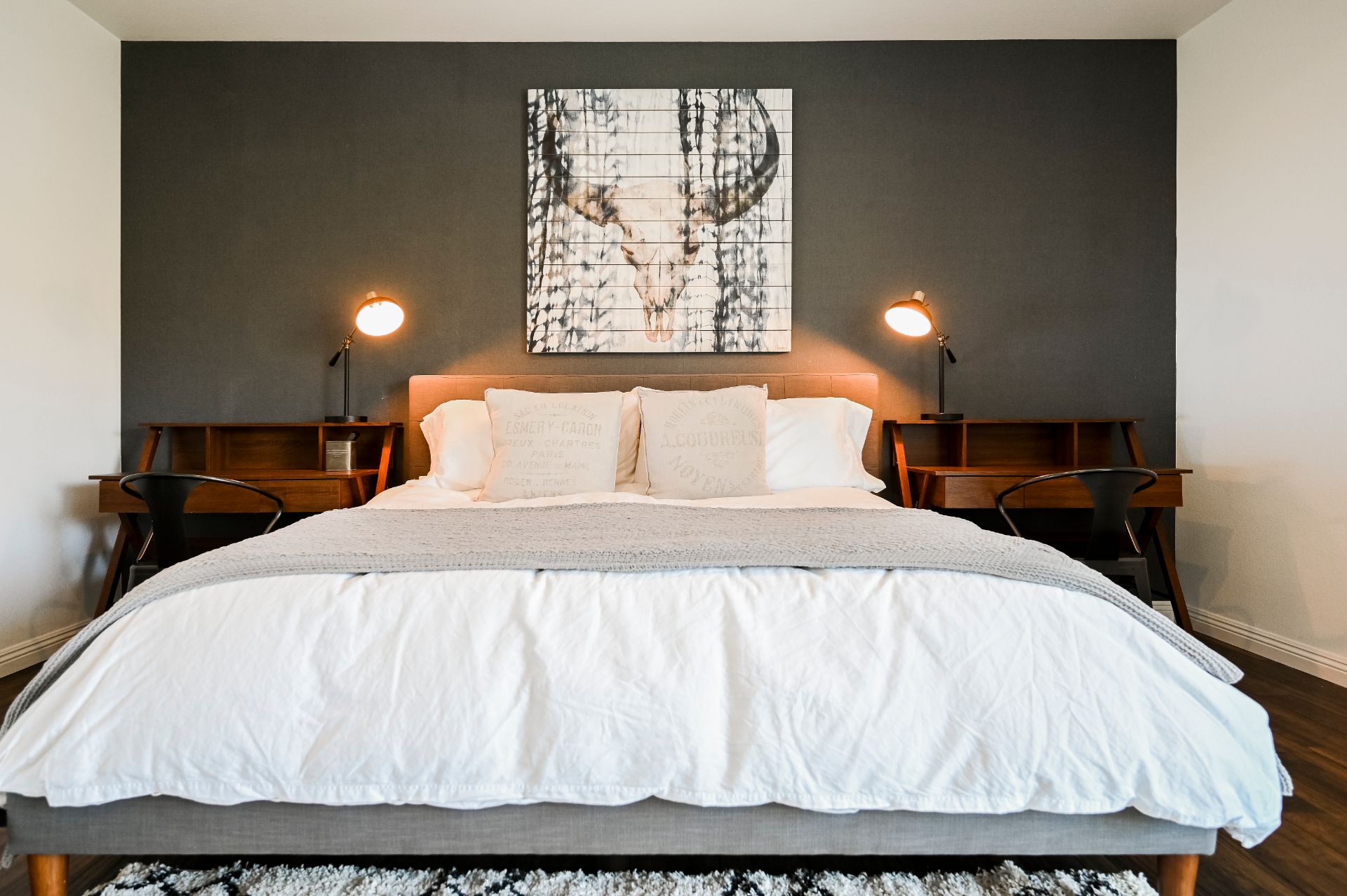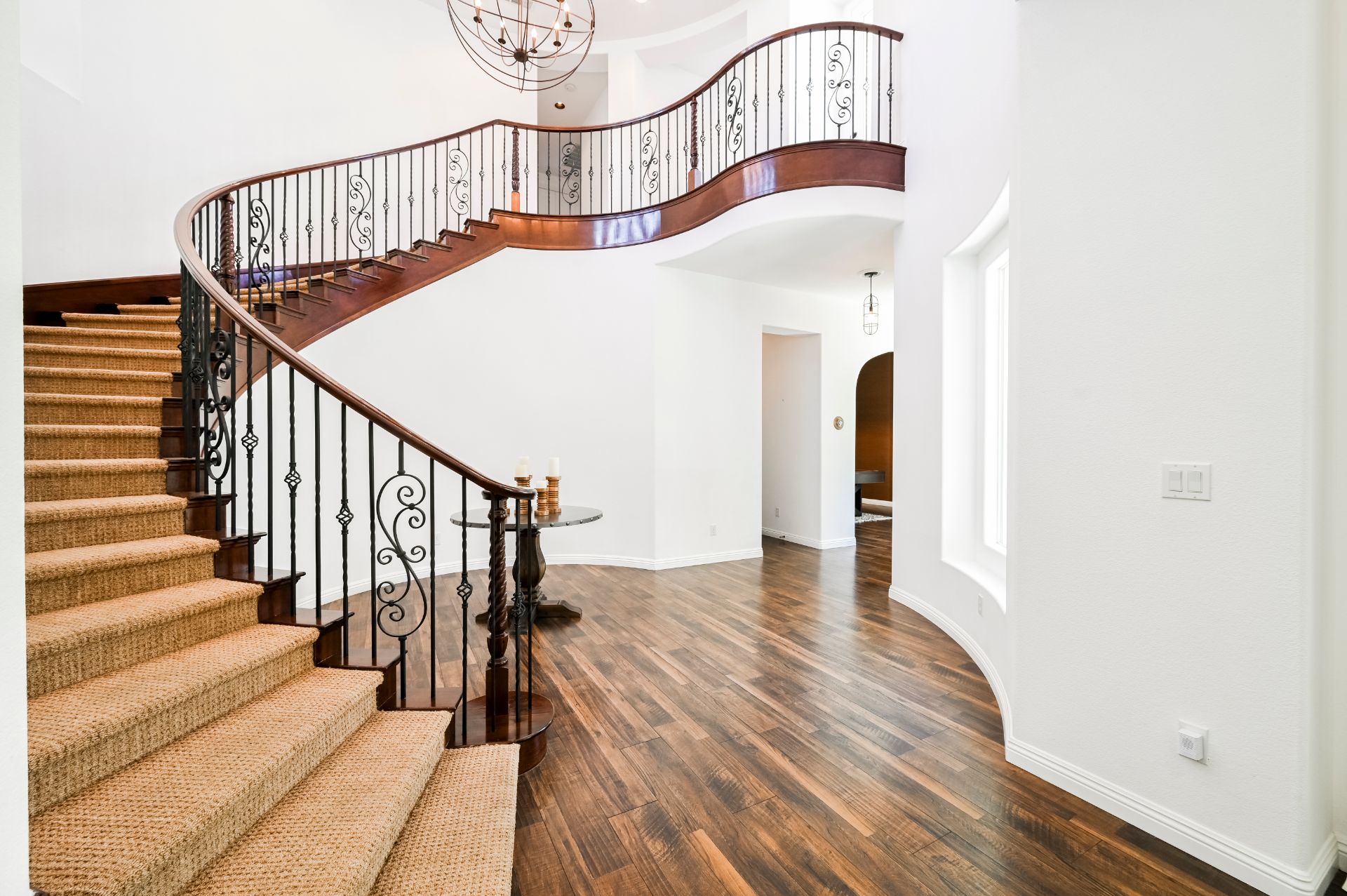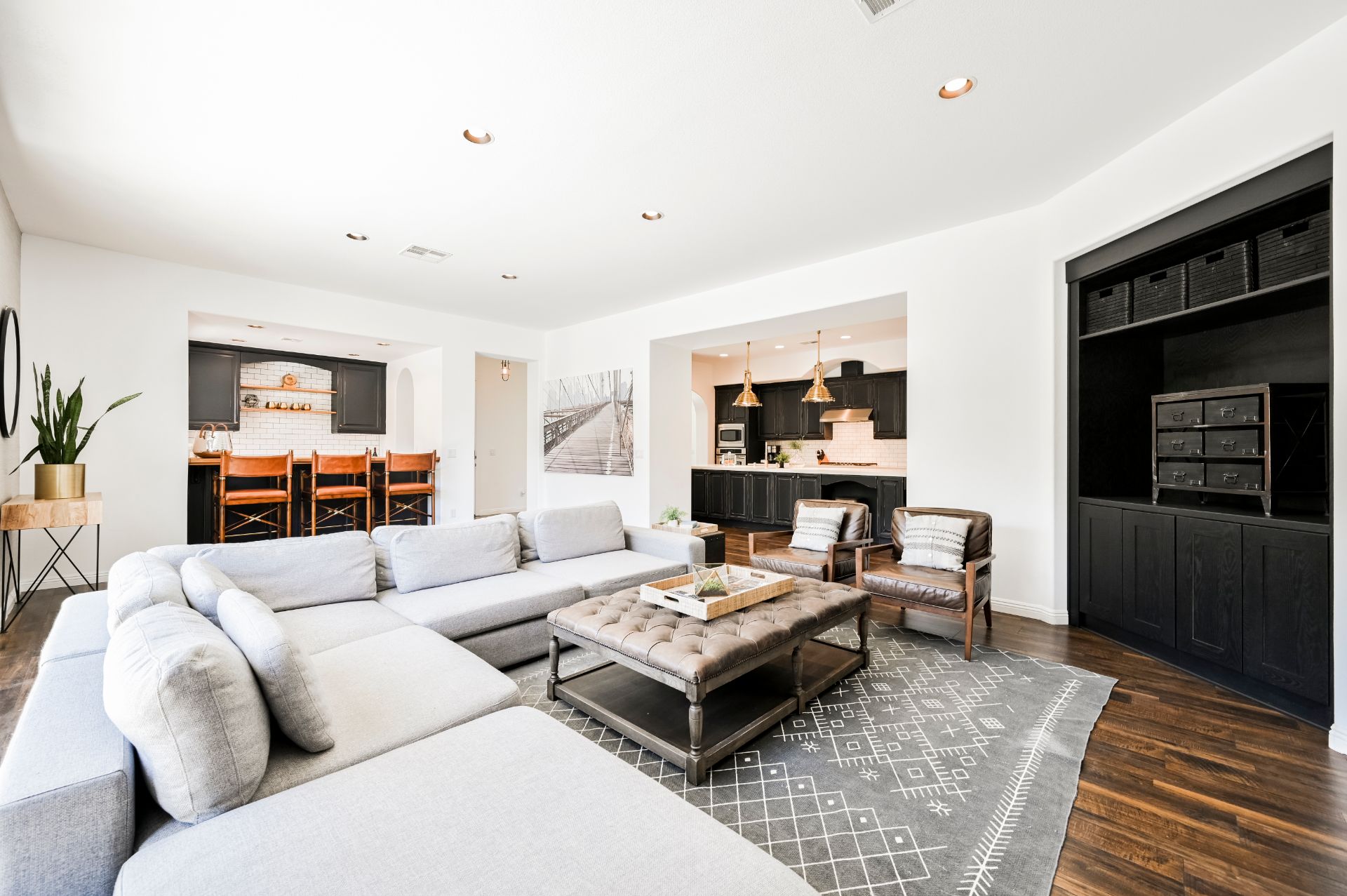 Remodeled in 2016, this nearly 5,100-square-foot home features contrasting materials and colors for dramatic effect. Designer lighting throughout. Dark floors and wrought iron stair railings provide a traditional touch.