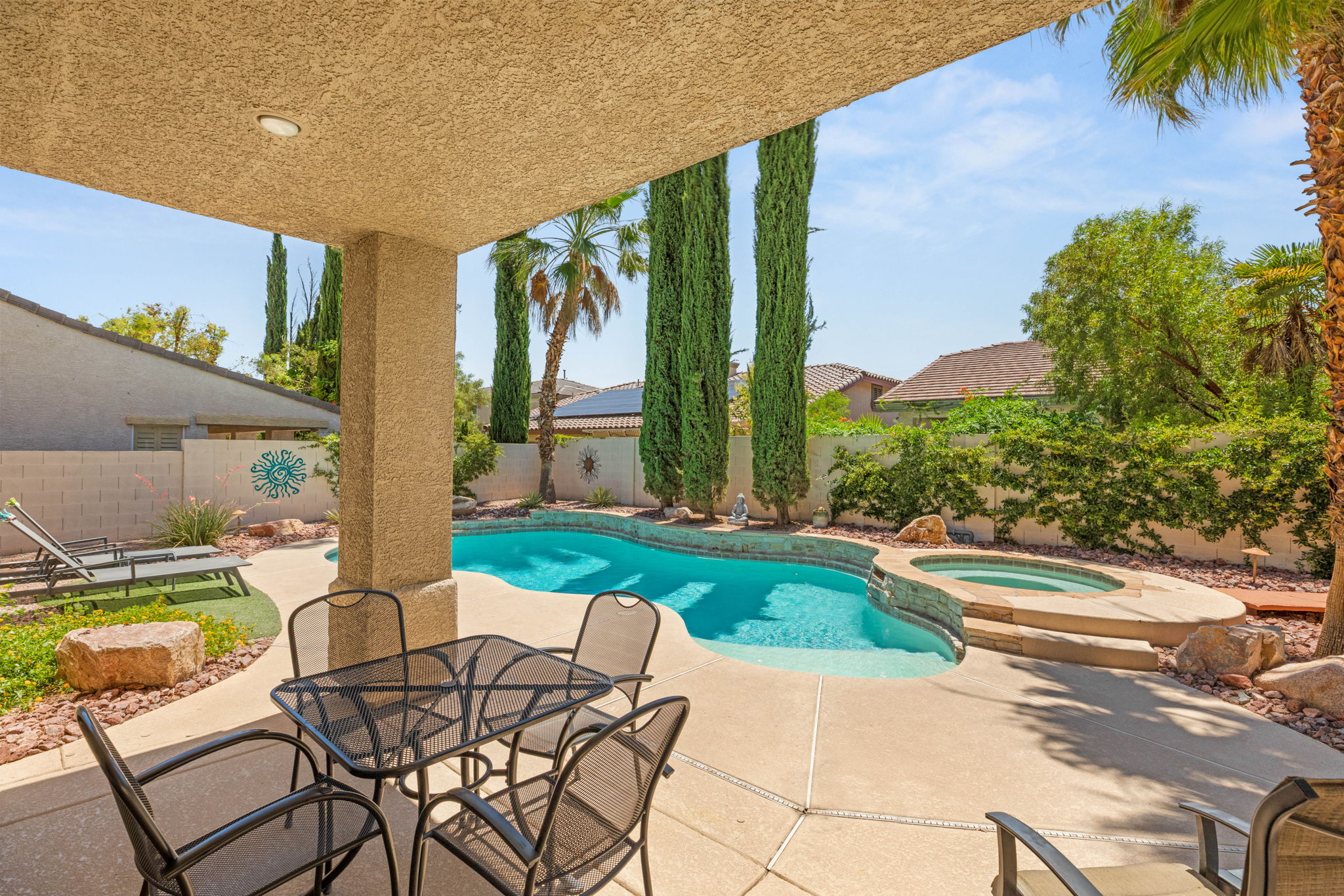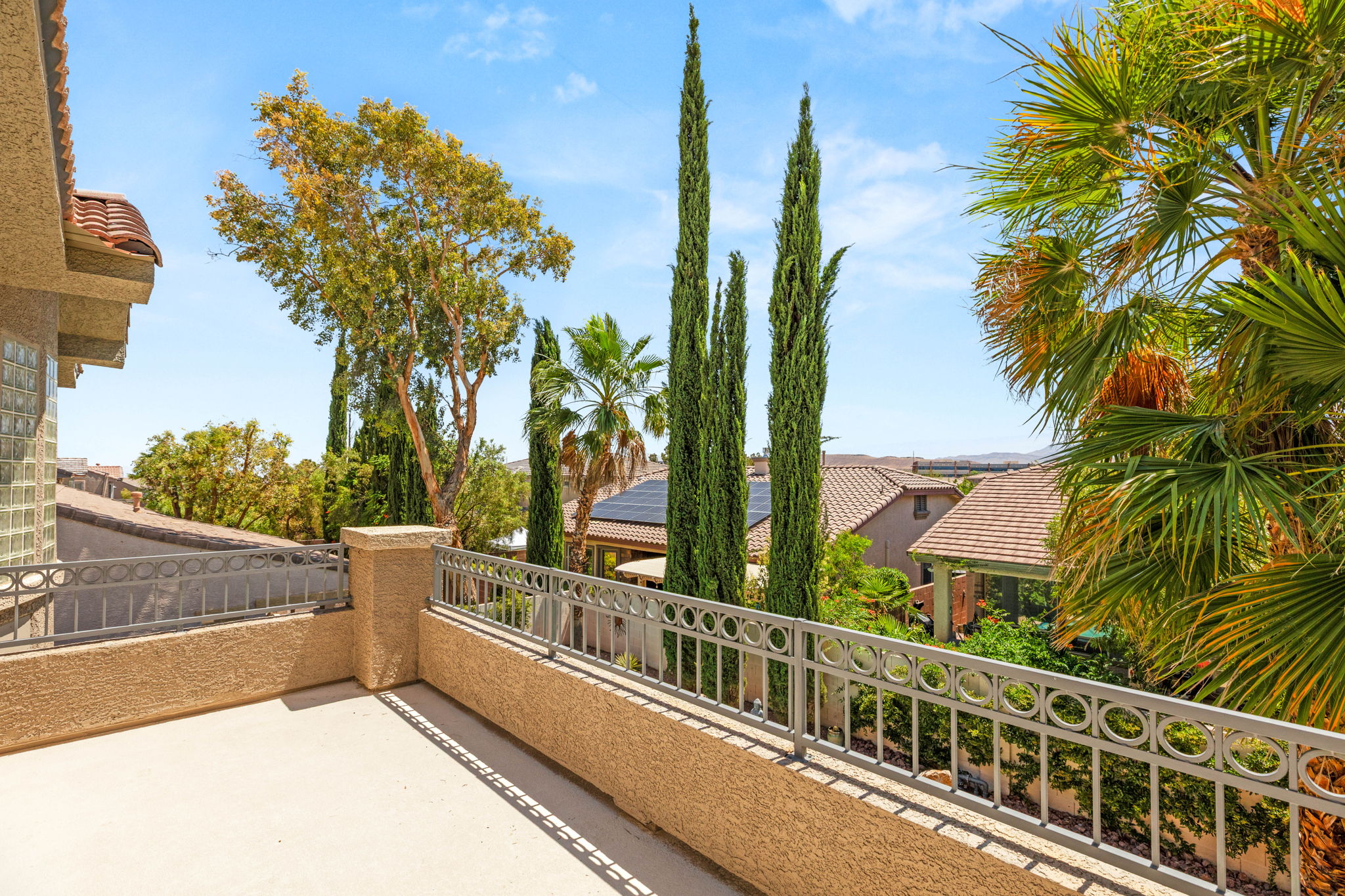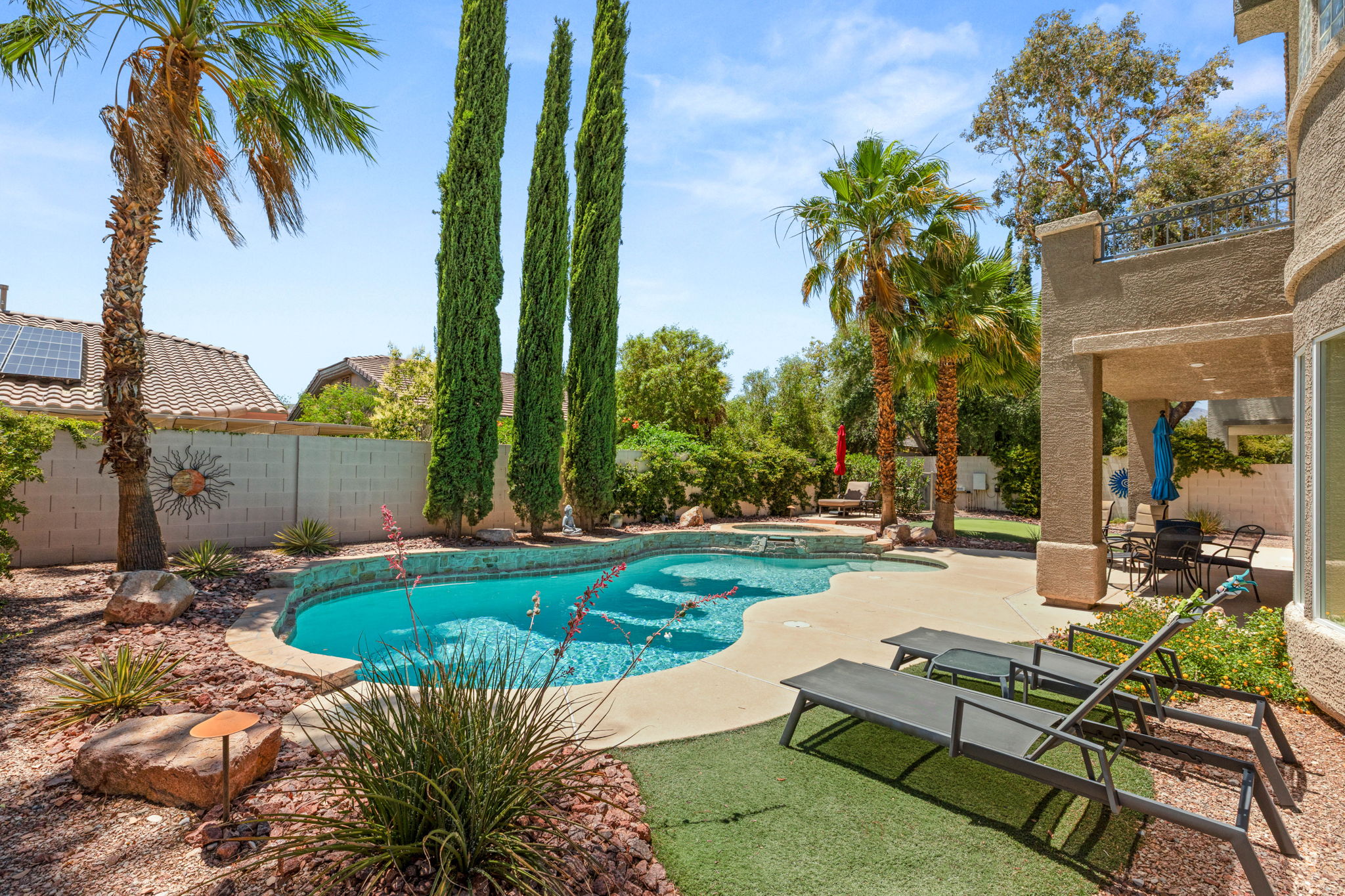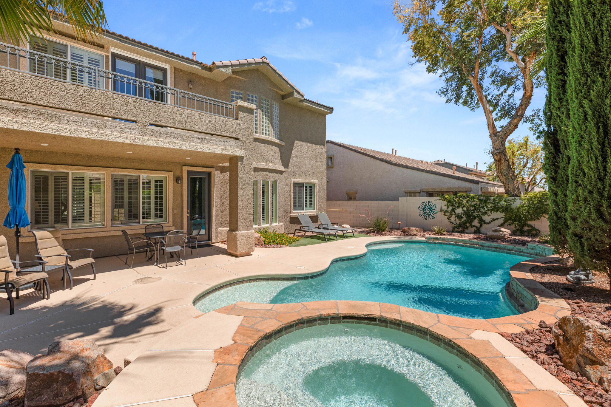 The main living area features a spacious family room anchored by custom built-ins at the media center, perfect for relaxing or entertaining. The adjacent kitchen is a true gathering space, designed with both style and utility in mind. A large island, stainless steel appliances, generous dining area, and separate butlerās pantry with prep space make hosting effortless and everyday living a joy. Upstairs, the primary suite is a tranquil retreat featuring its own private balcony that overlooks the backyard oasis. The luxurious ensuite bathroom includes two separate vanities, a large soaking tub, a walk-in shower, and a custom-built walk-in closet with abundant storage. Each secondary bedroom is generously sized, with easy access to a full bathroom and ample closet space. The home also includes a large laundry room with built-in cabinetry, a 3-car garage for plenty of parking and storage, and additional thoughtful upgrades throughout. The backyard is a true private paradiseālush landscaping wraps around a sparkling pool and spa, with a covered patio for shaded lounging or al fresco dining. A putting green adds a playful touch to this beautifully manicured outdoor space, offering endless entertainment and relaxation options. Set within The Gardens in Summerlin, this home enjoys the best of both lifestyle and location. Known for its tree-lined streets, expansive parks, and tight-knit community feel, The Gardens offers residents access to tennis courts, walking trails, community events, and more. With close proximity to top-rated schools, Downtown Summerlin, and freeway access, the neighborhood combines tranquility with convenience. Homes like 3535 Coventry Gardens Drive rarely come to market. Donāt miss the opportunity to own this thoughtfully upgraded, beautifully maintained home in one of Las Vegasā premier master-planned communities.