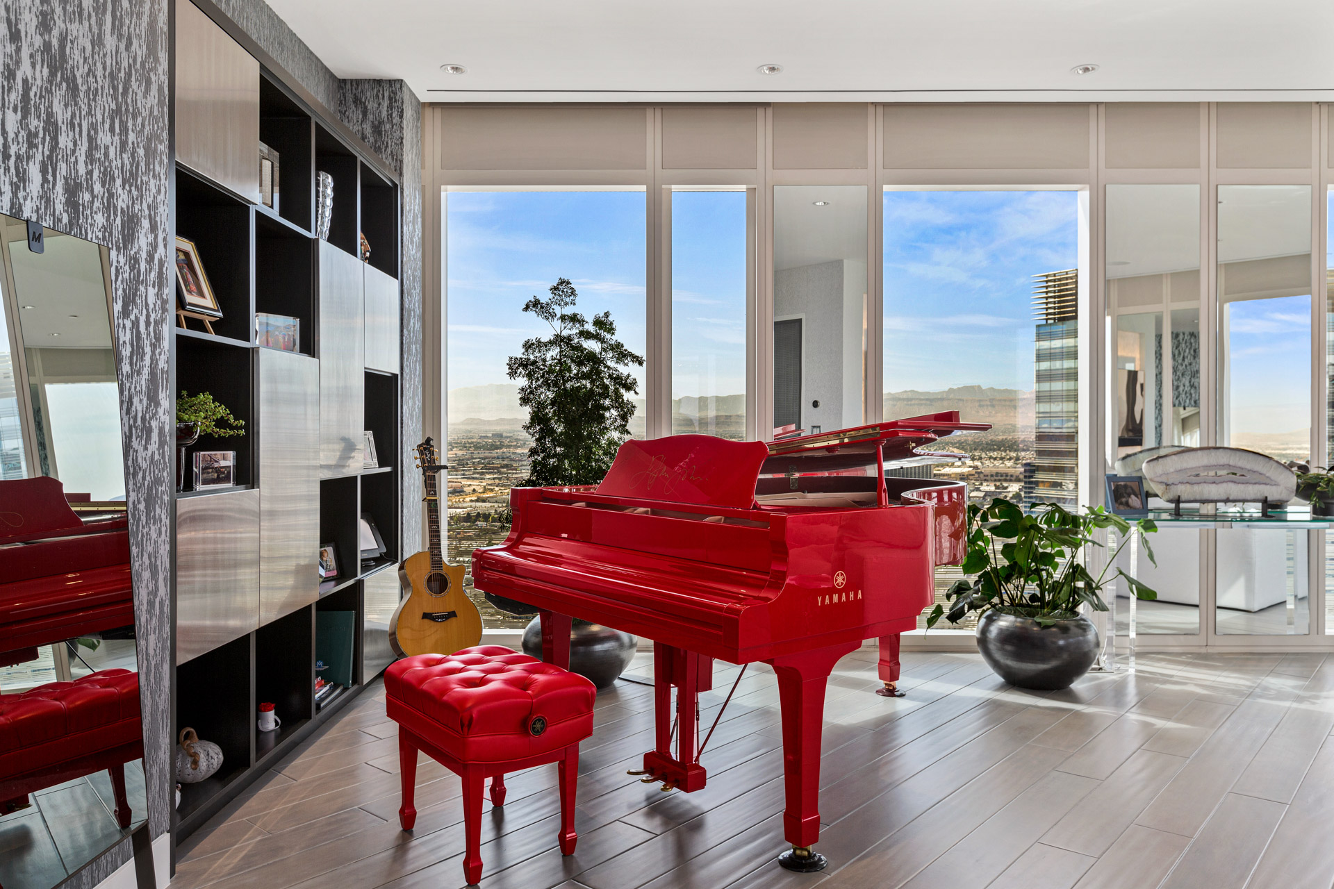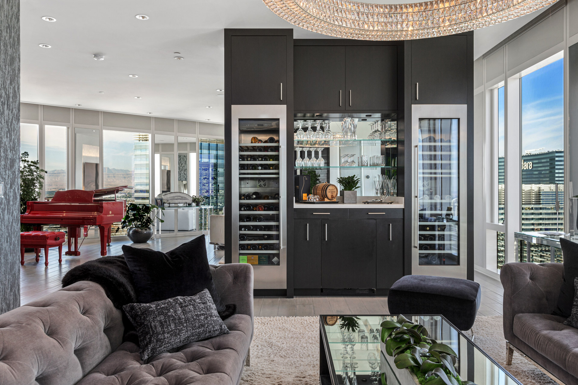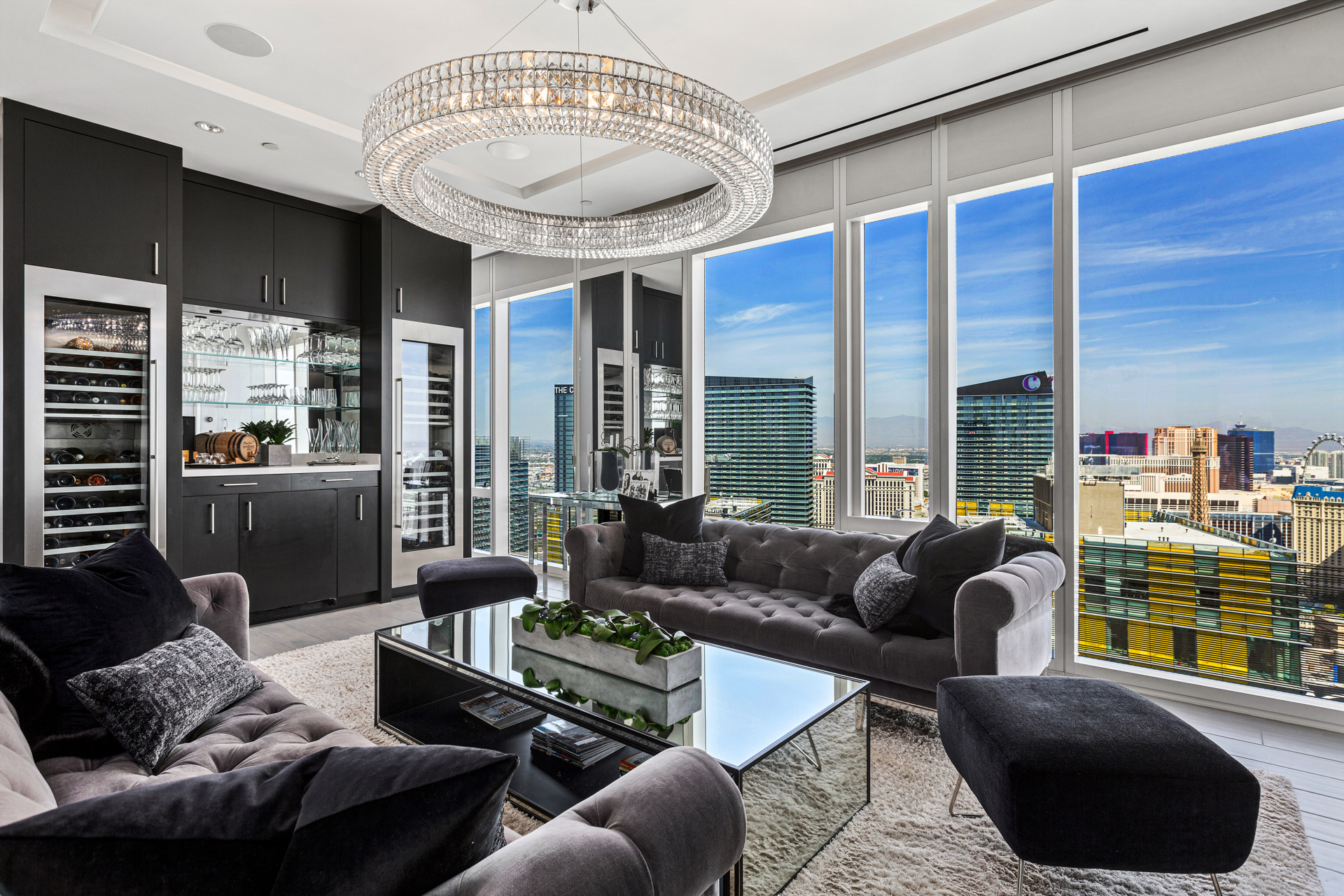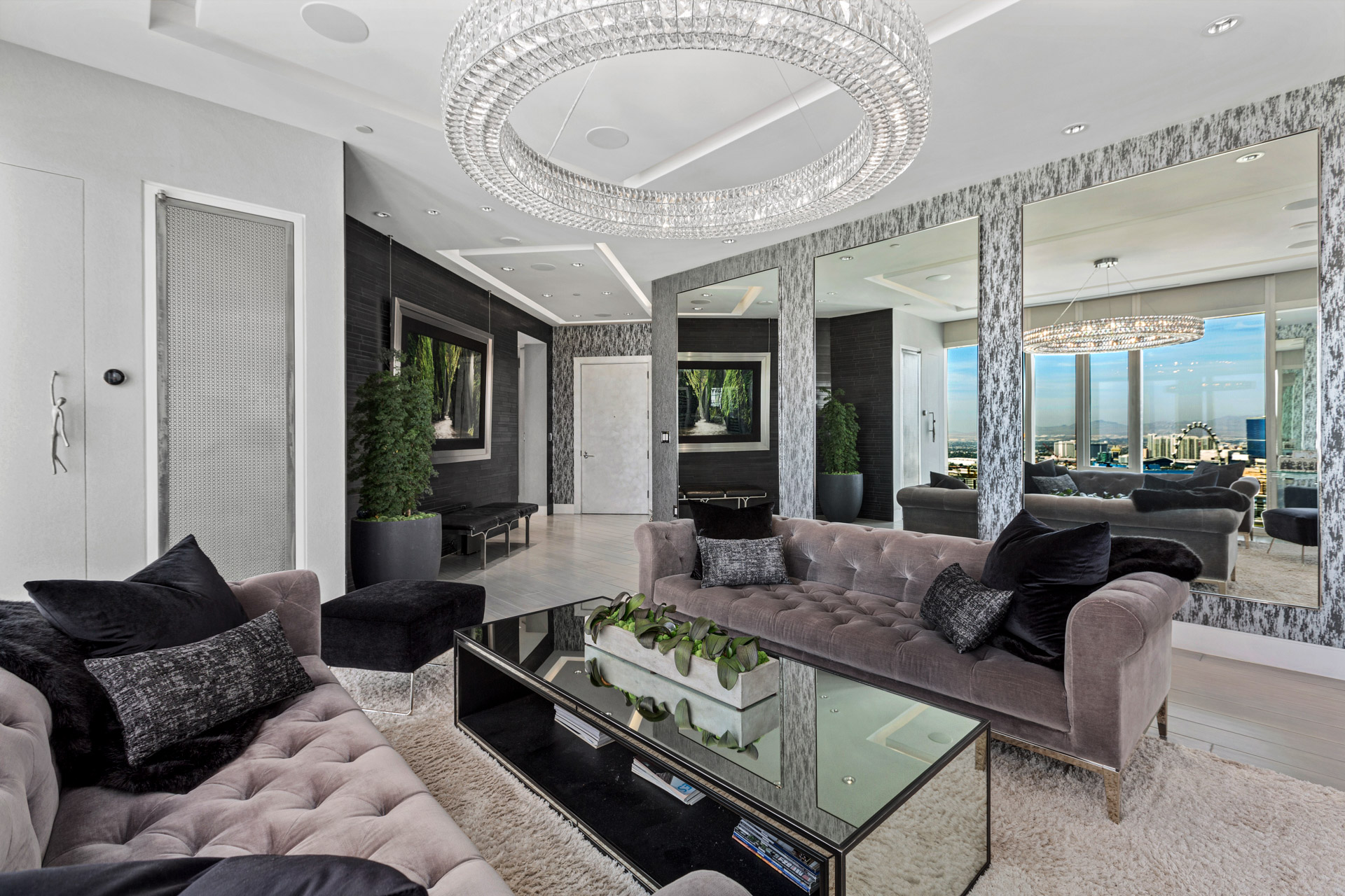 The ultimate in luxury living! This 42nd-floor Waldorf Astoria penthouse offers stunning panoramic views of the Las Vegas Strip, with floor-to-ceiling windows showcasing both ends. With sleek and modern design elements throughout, it's easy to appreciate the beauty of this highly coveted corner unit. The bright and airy spaces are complemented by tile accent walls and textured wallpaper, while built-in shelving and layered ceilings add warmth to every corner.