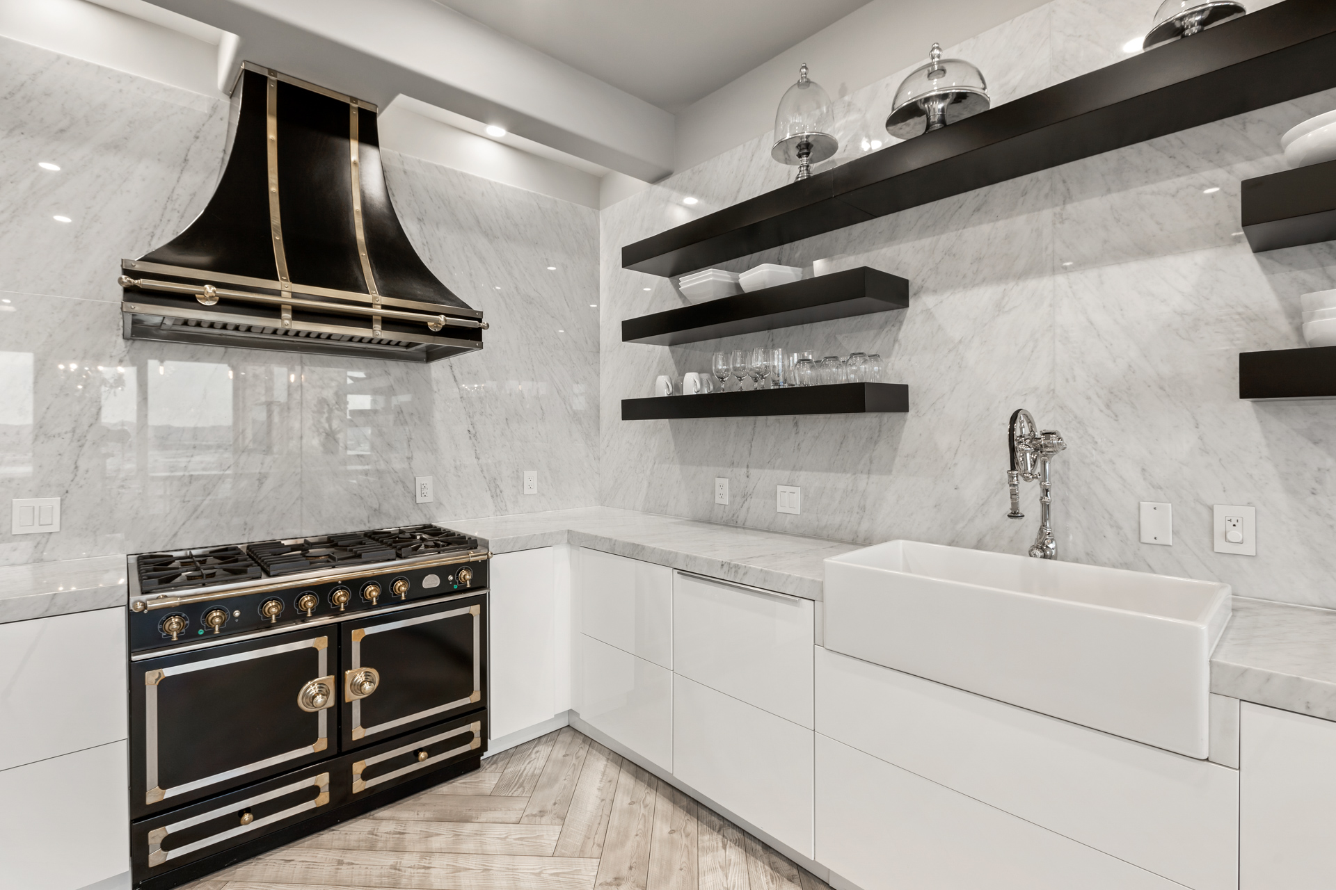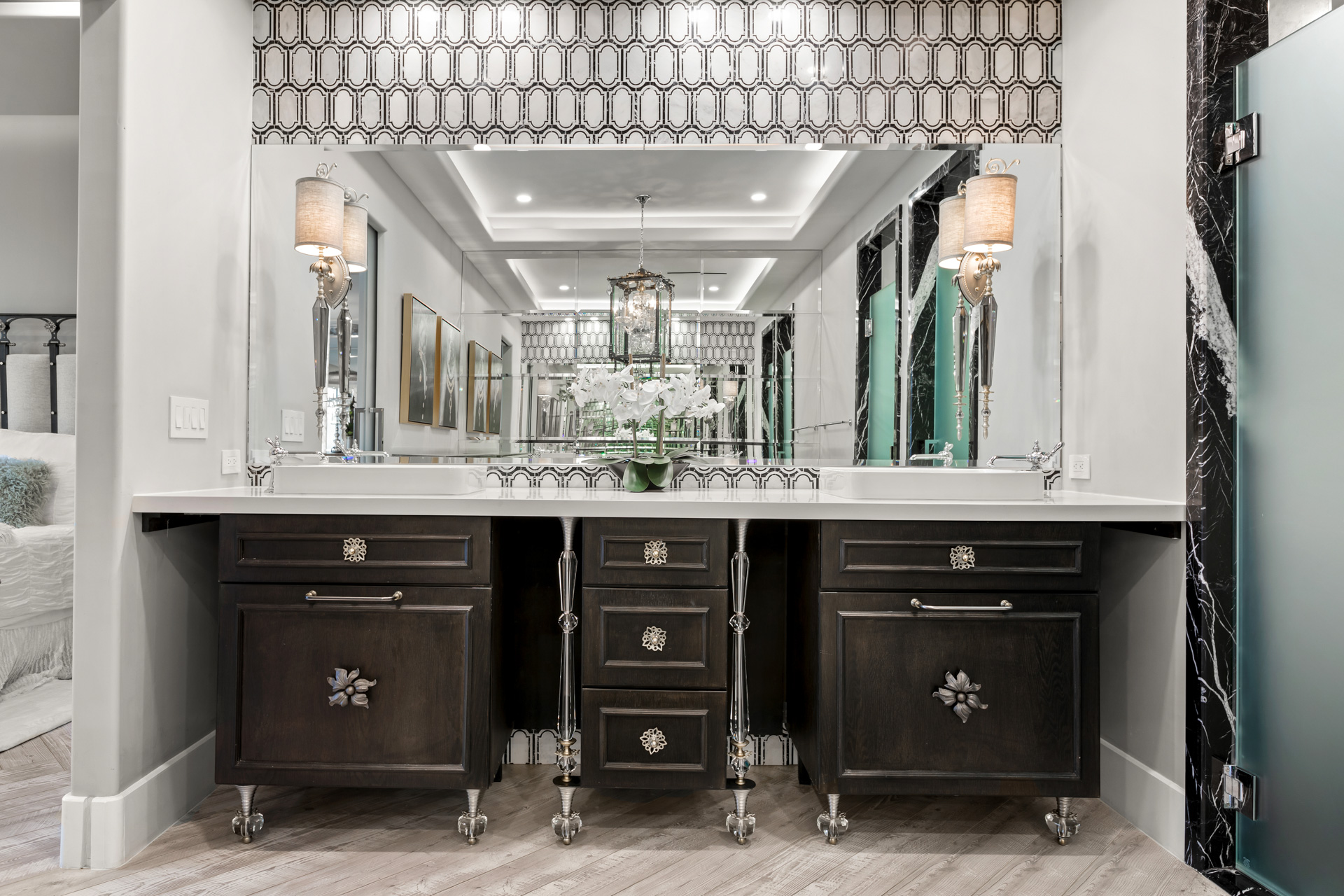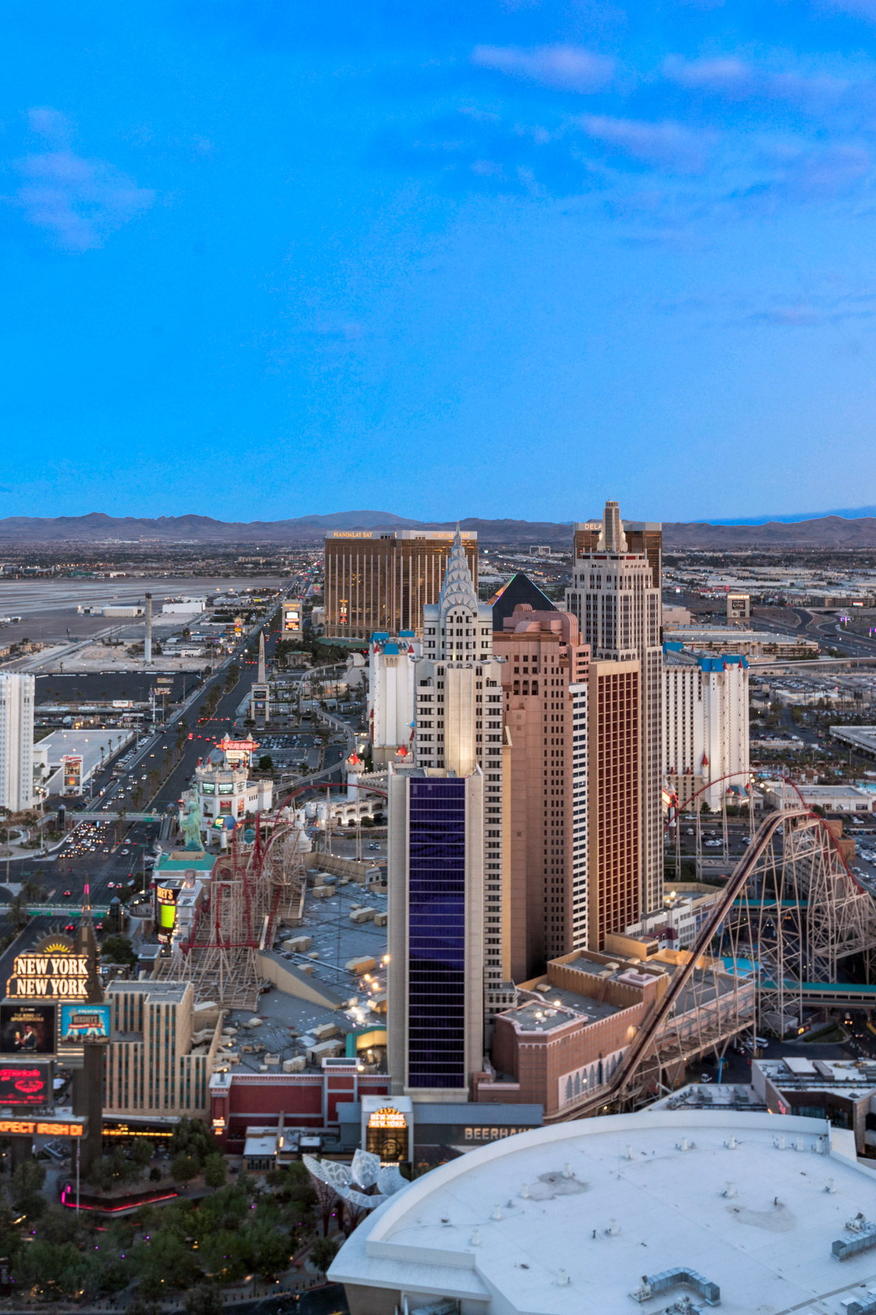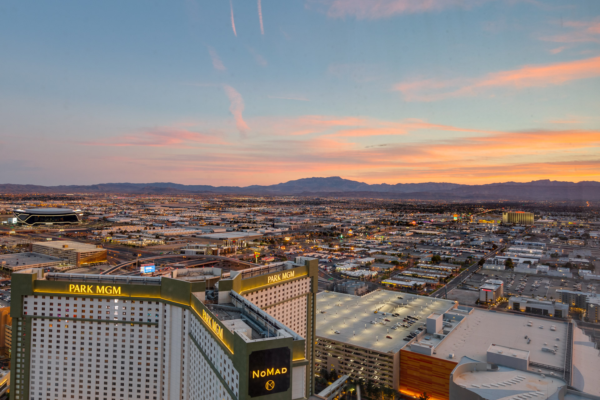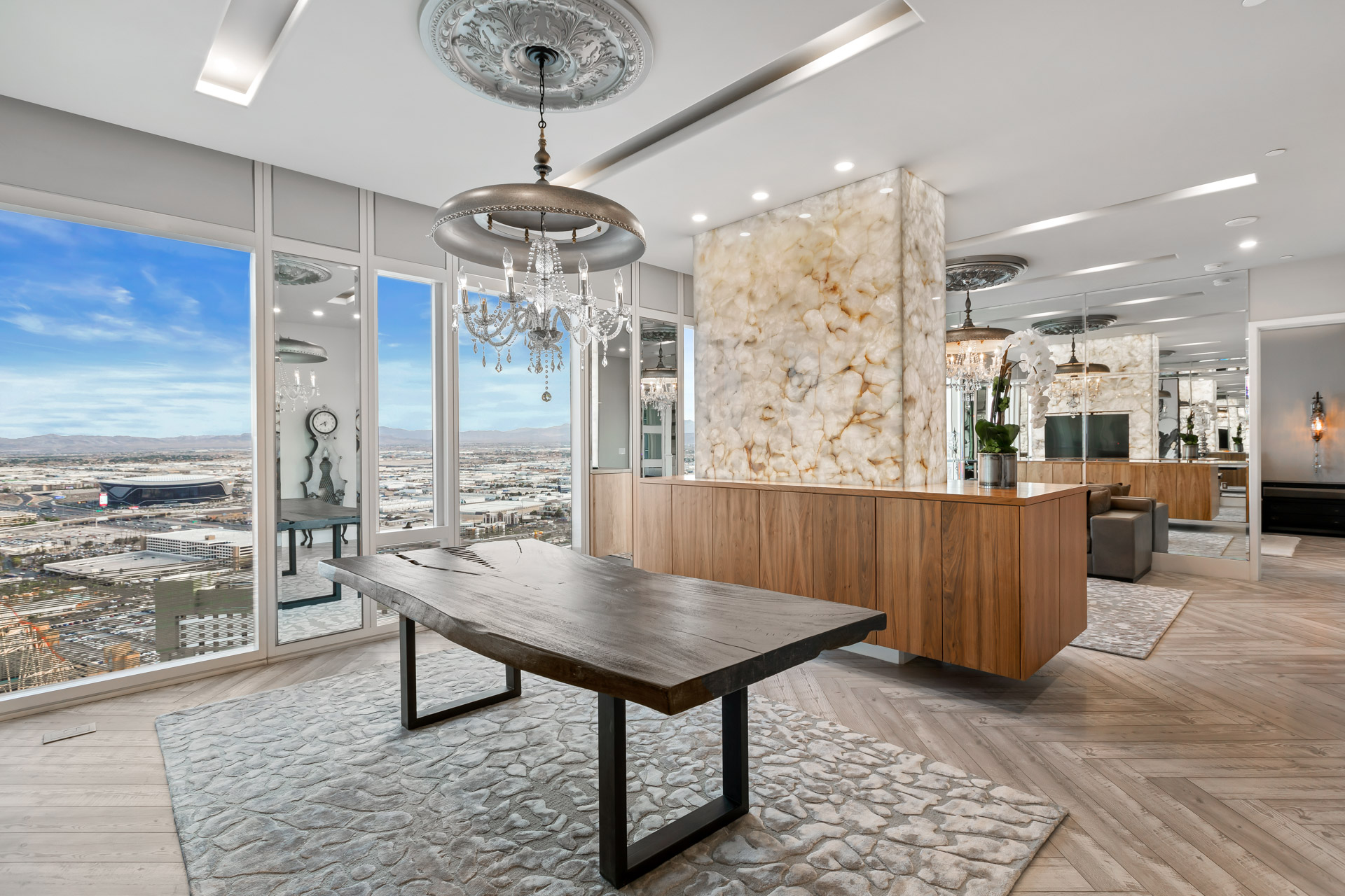 Bedrooms are simple spaces, designed for ultimate personal comfort; one offers built-in high-style bunk beds. Baths provide sybaritic opulence, again with stylistic features that recall a past era of elegance, but are thoroughly modern. Lighting fixtures employ aged metallics and elegant crystal in equal proportion, and next-generation kitchen appliances blend seamlessly into an unadorned wall of sleek white cabinetry. A showstopper black and brass classic-style range and vent hood and an artistic faucet are the unabashed stars of the space, while simple open shelves display dishes and glassware as fine art. An extraordinary life awaits new owners of this elegant unit, in a building that includes concierge and valet parking services, pool and spa, exercise room and fitness center in the heart of a great city. With walls of glass and views that stretch to forever, the building is situated in the heart of the Las Vegas Strip, with dining, shopping and entertainment just steps away, and easy proximity to Raiders Stadium, T-Mobile Arena and McCarran Airport.