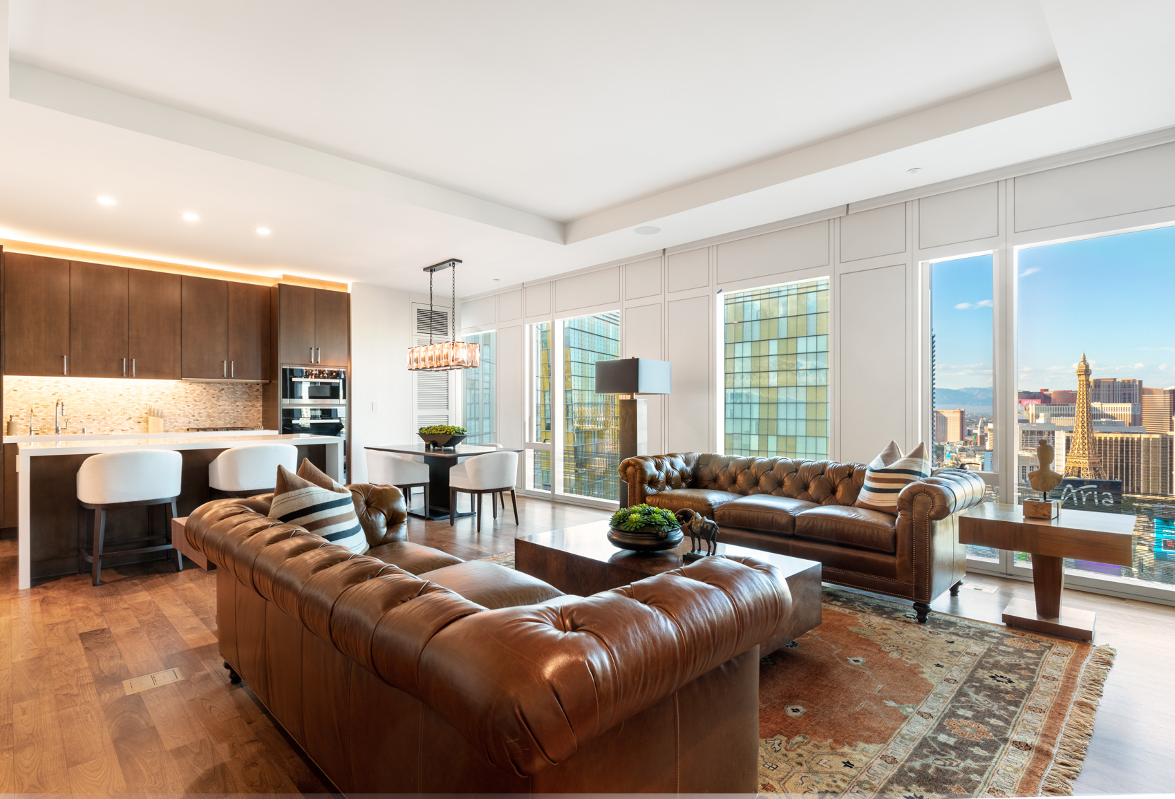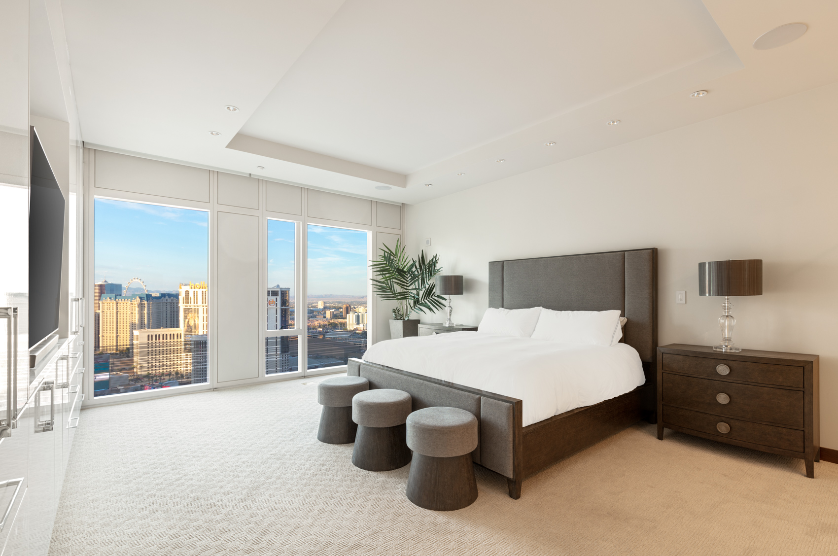 Experience sheer luxury at 3750 Las Vegas Blvd #3006 - a 1-bed, 3-bath condo with extraordinary views of the Strip and mountains. This Waldorf Astoria residence boasts custom cabinets, stone counters, and a full den.