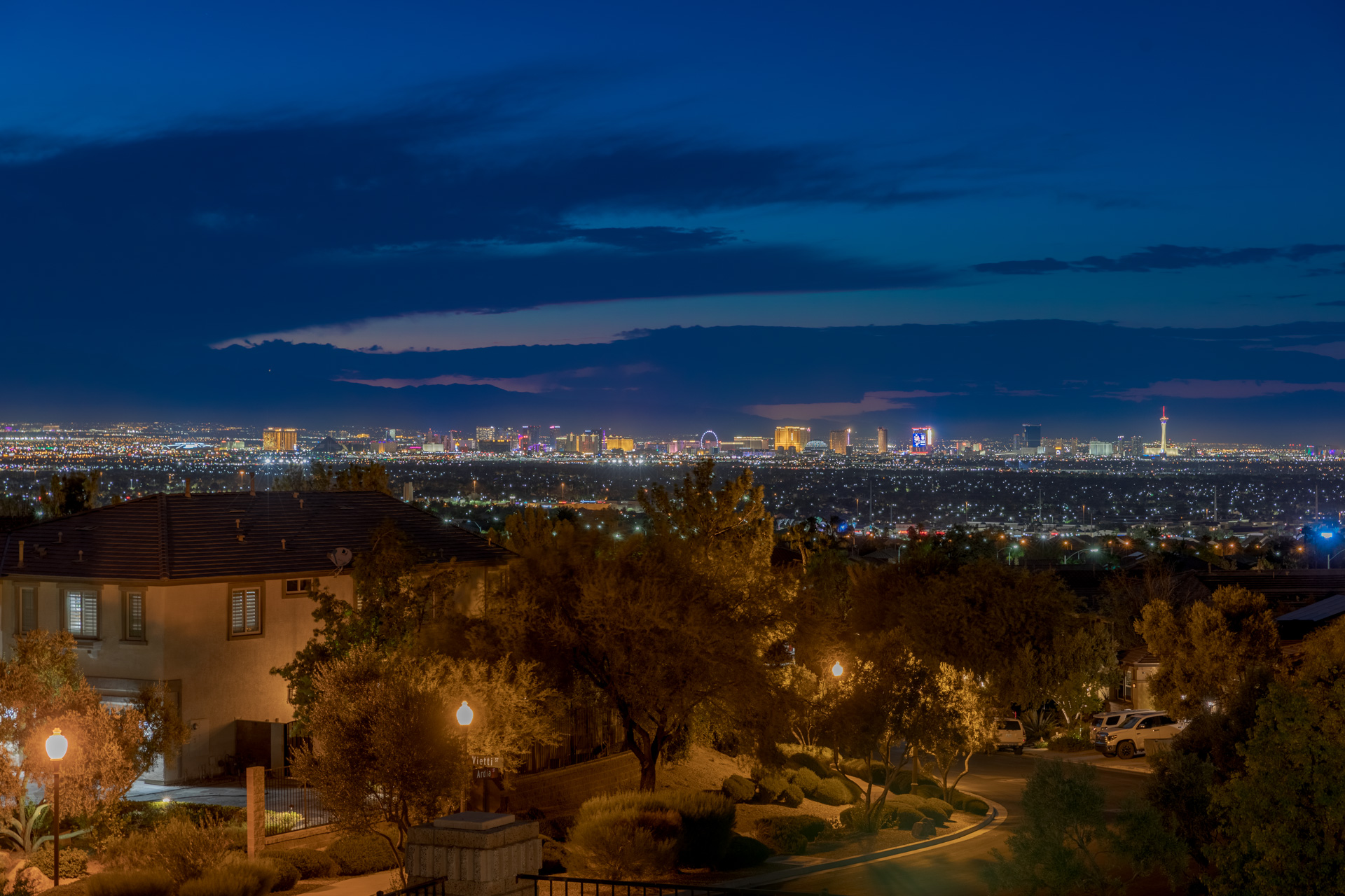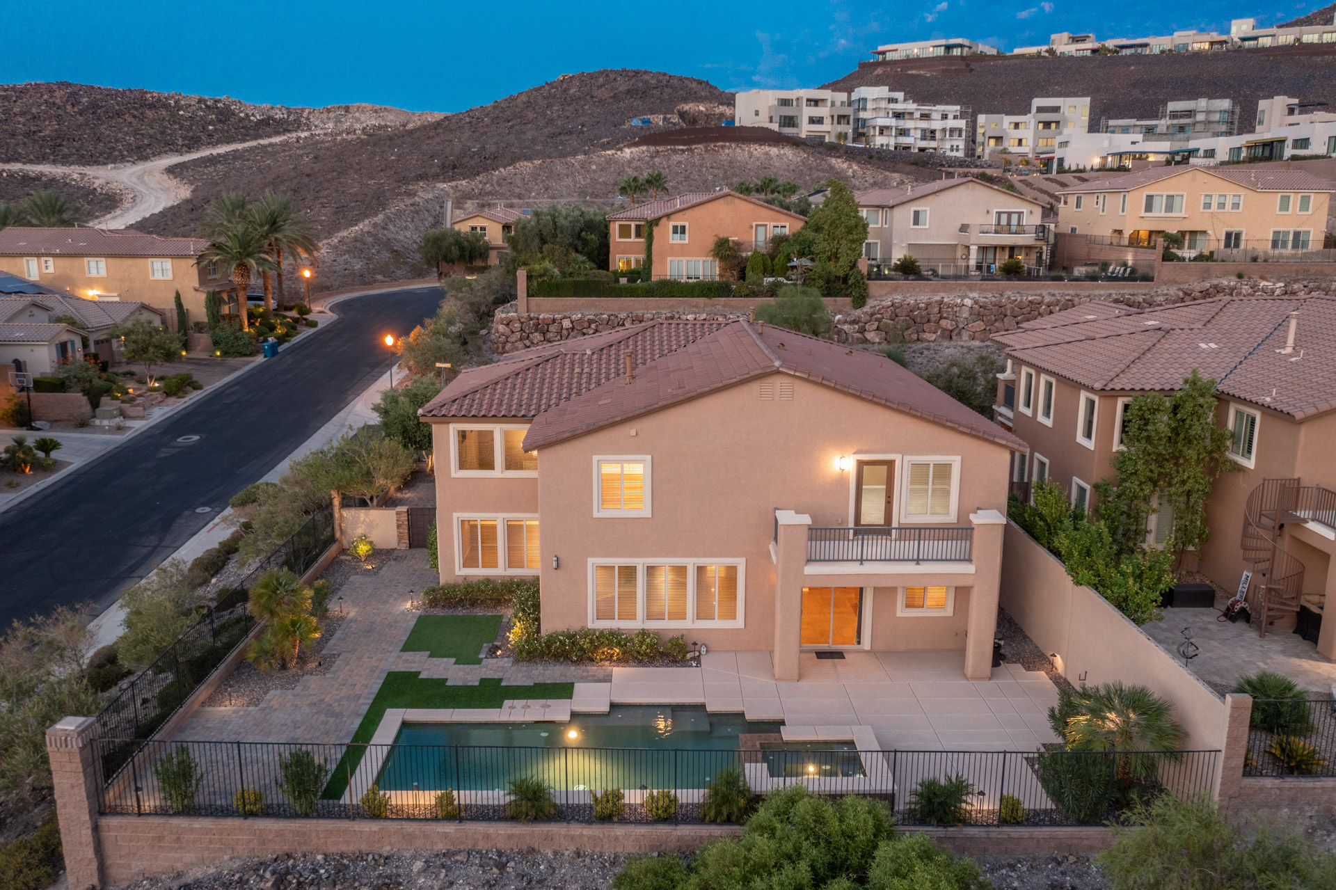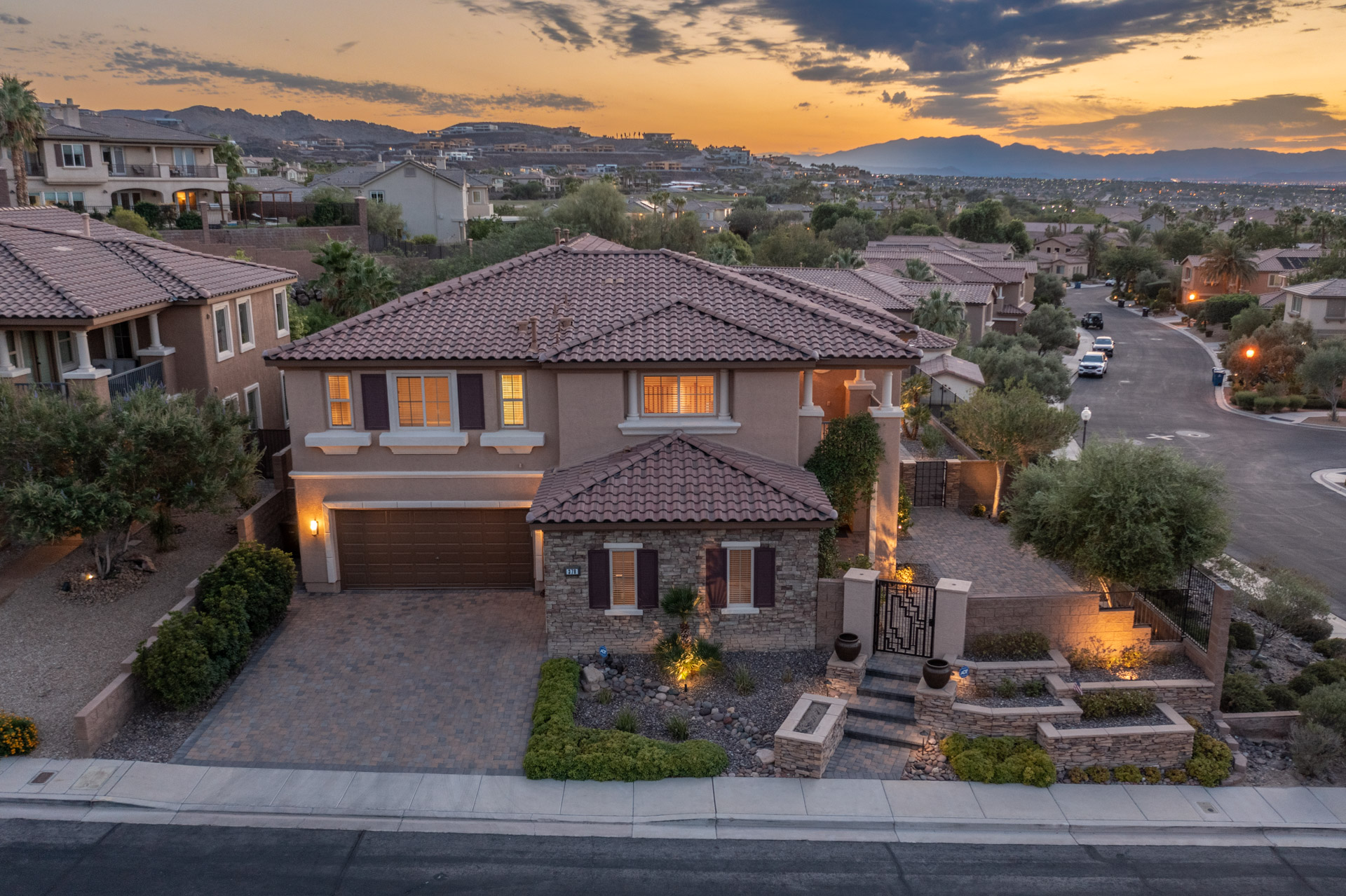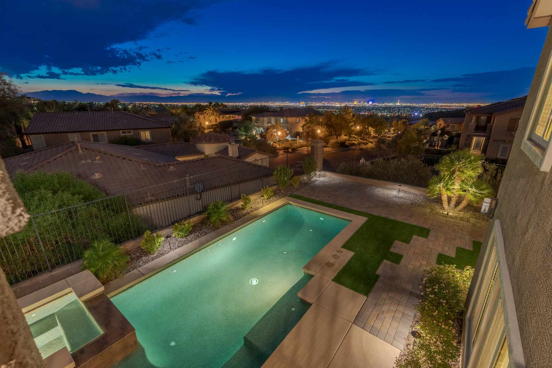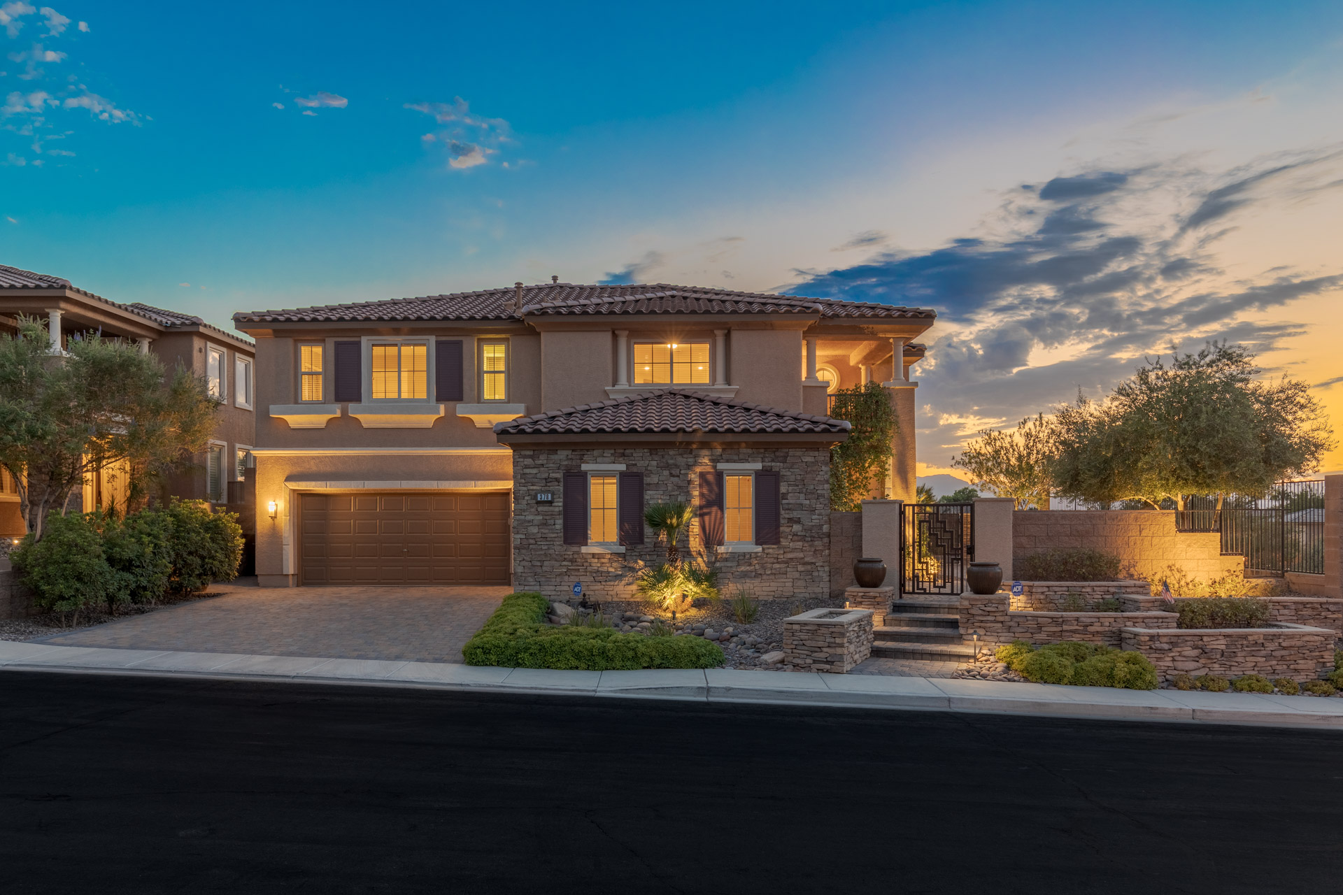 Spectacular panoramic views of the Las Vegas Strip and the Valley, from the backyard, from balconies, and from several rooms. The home perched up on an elevated lot is in a quiet cul-de-sac within the Terrazzo gated community. A private gated courtyard leads inside the bright, open home with high ceilings, custom stone and real hardwood flooring, deluxe carpeting, and designer light fixtures.
