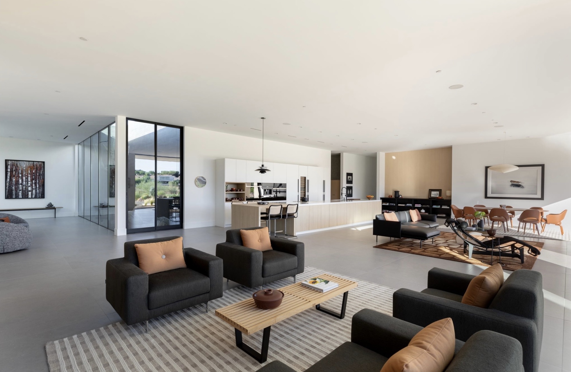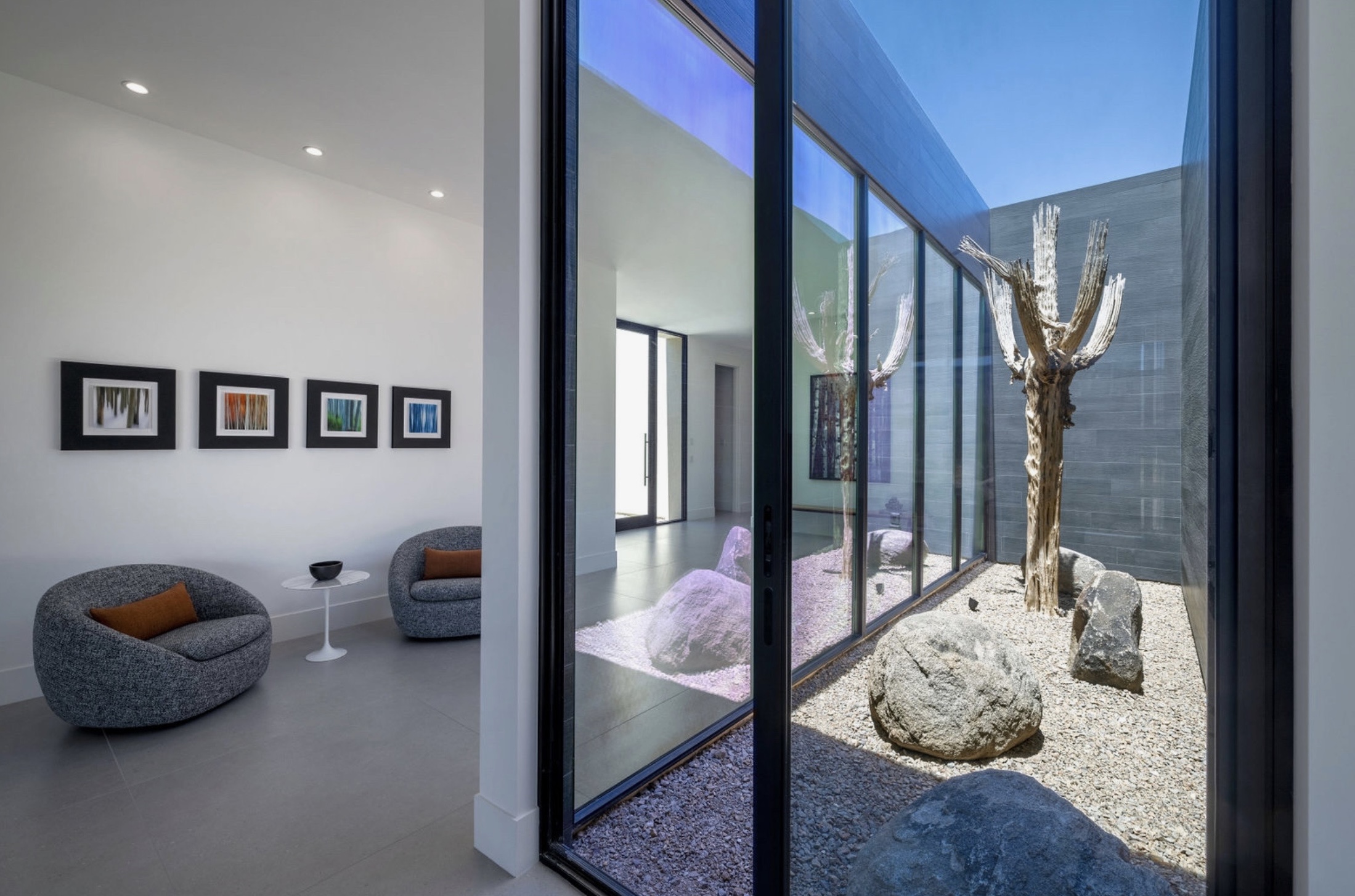 From the moment you approach, the home’s striking presence is undeniable. A private, gated driveway leads to a side-loading 5-car garage, providing both convenience and security. As you step through the front entrance, you're greeted by an expansive, open layout that seamlessly integrates indoor and outdoor living. The home is awash in natural light, thanks to floor-to-ceiling windows that not only frame the breathtaking views but also invite the serene desert landscape Inside.