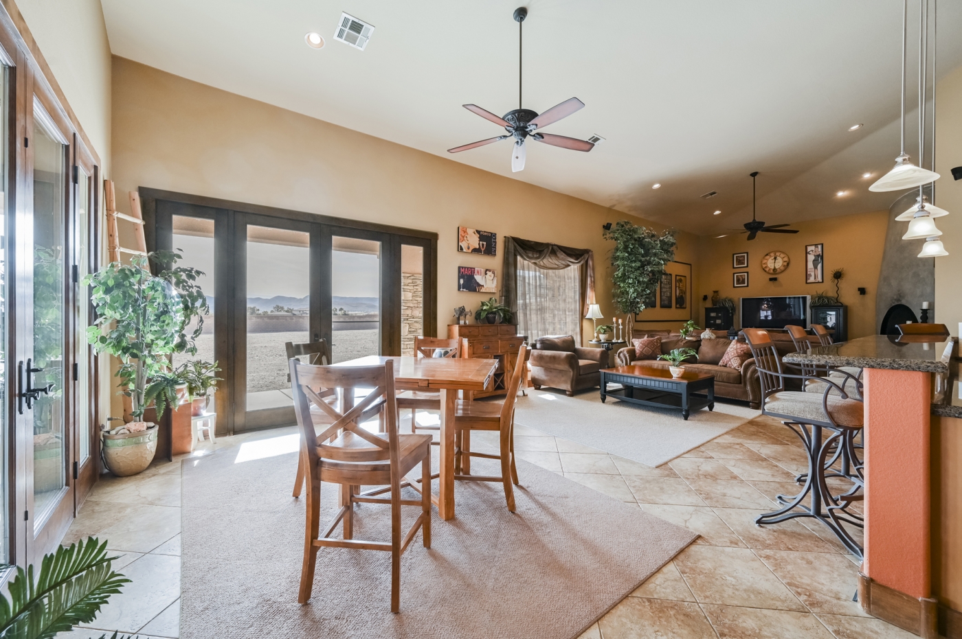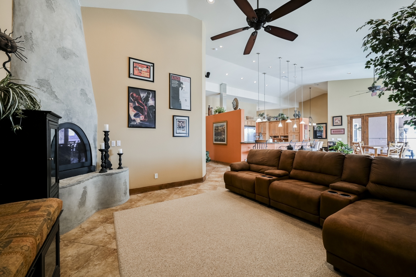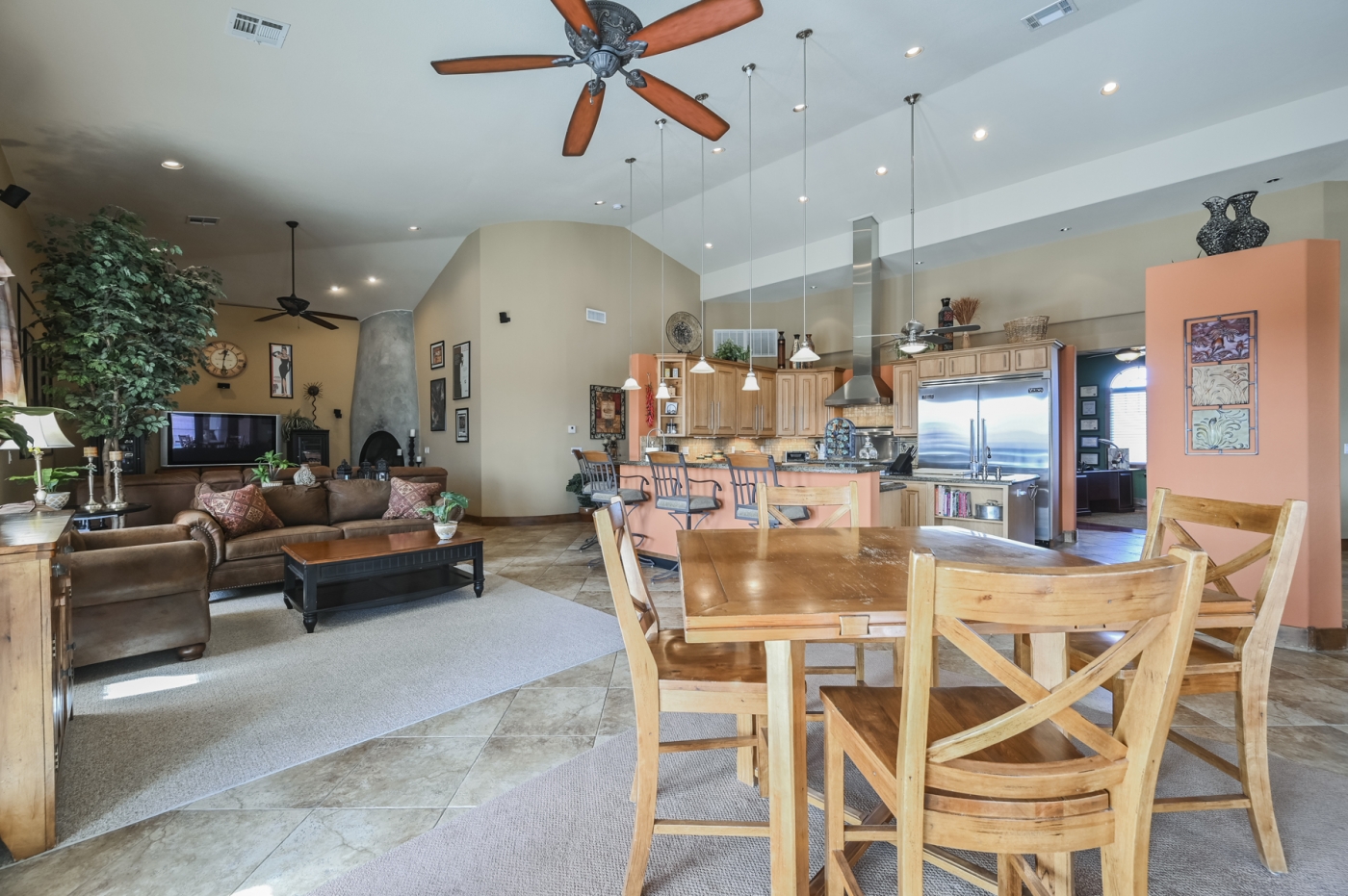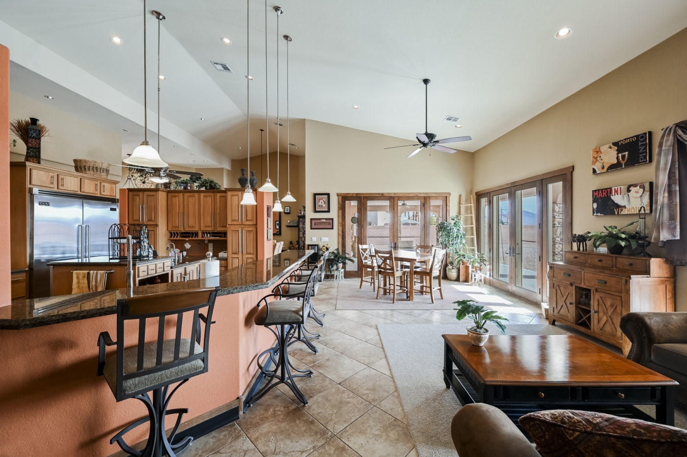 With four bedrooms, three baths, and a four-car garage with workshop space, this single-story home offers a blend of style and comfort with an unpretentious, rustic vibe. The open floor plan encourages togetherness but shows also that privacy and individual activities are valued. It boasts a large great room and a convenient nearby den/media room with a kiva-style fireplace for convivial comfort. There is a spacious kitchen with gleaming top-of-the-line stainless steel appliances, custom cabinetry, and granite countertops to accommodate a family of chefs. The kitchen also features an eating bar with pull-up space for a crowd!