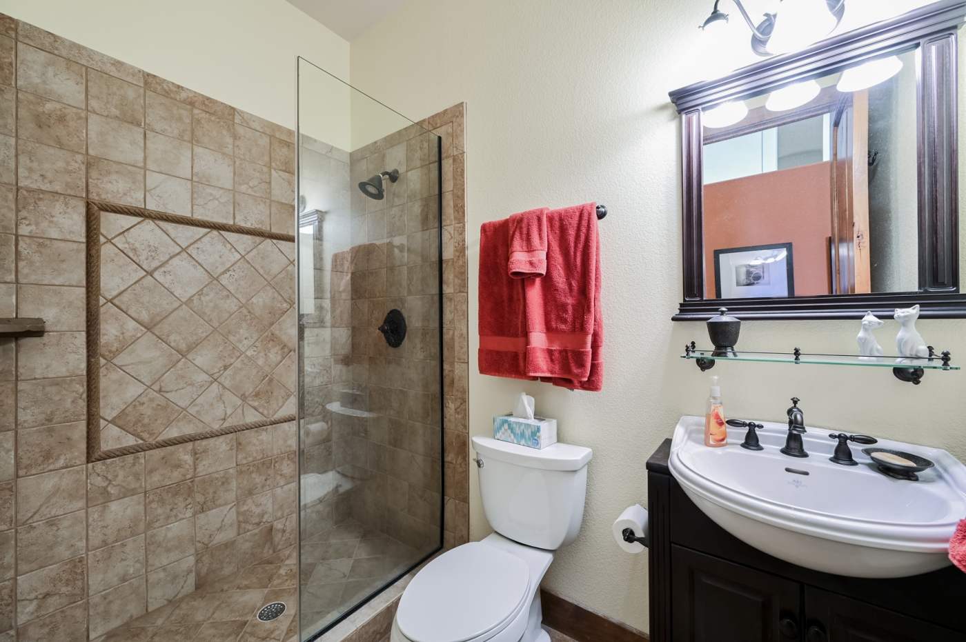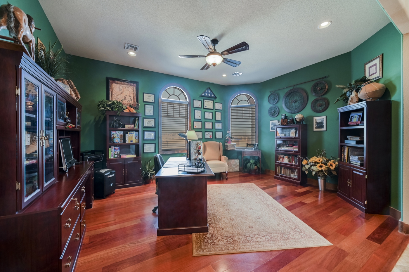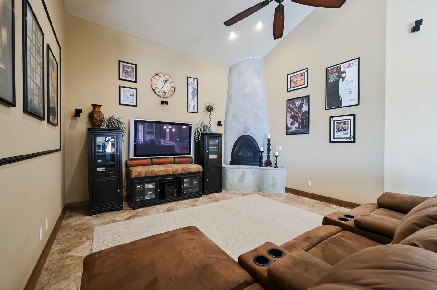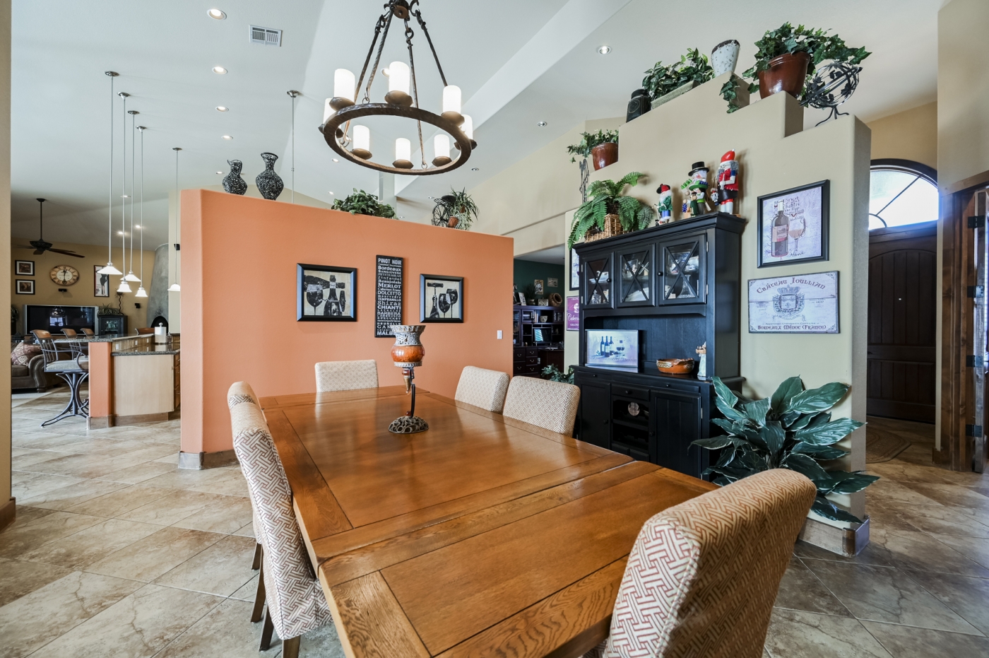 With four bedrooms, three baths, and a four-car garage with workshop space, this single-story home offers a blend of style and comfort with an unpretentious, rustic vibe. The open floor plan encourages togetherness but shows also that privacy and individual activities are valued. It boasts a large great room and a convenient nearby den/media room with a kiva-style fireplace for convivial comfort. There is a spacious kitchen with gleaming top-of-the-line stainless steel appliances, custom cabinetry, and granite countertops to accommodate a family of chefs. The kitchen also features an eating bar with pull-up space for a crowd!