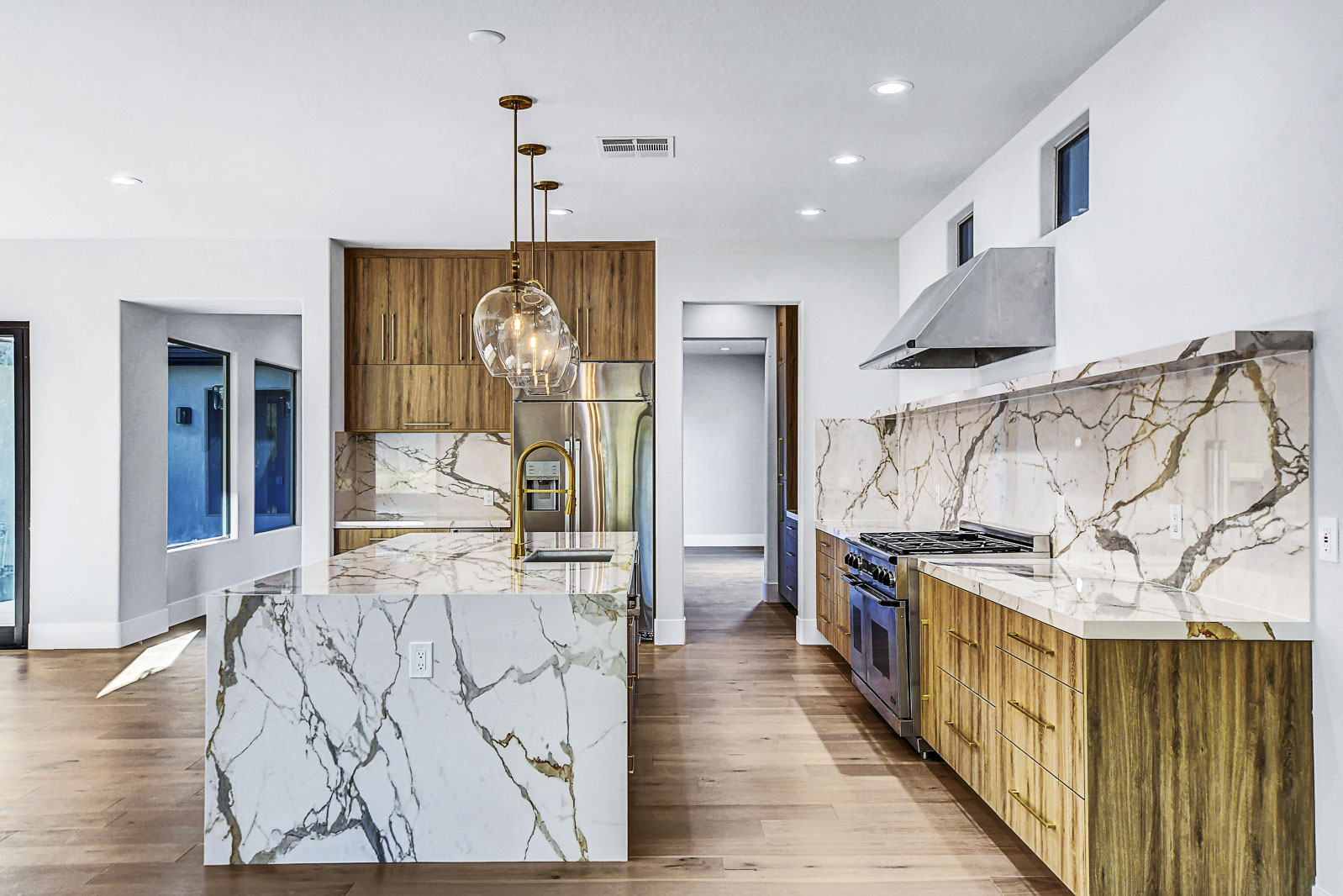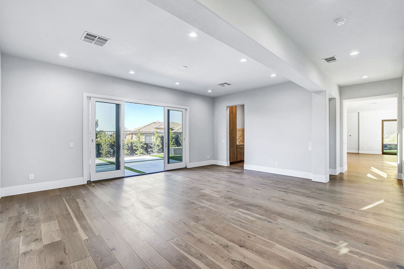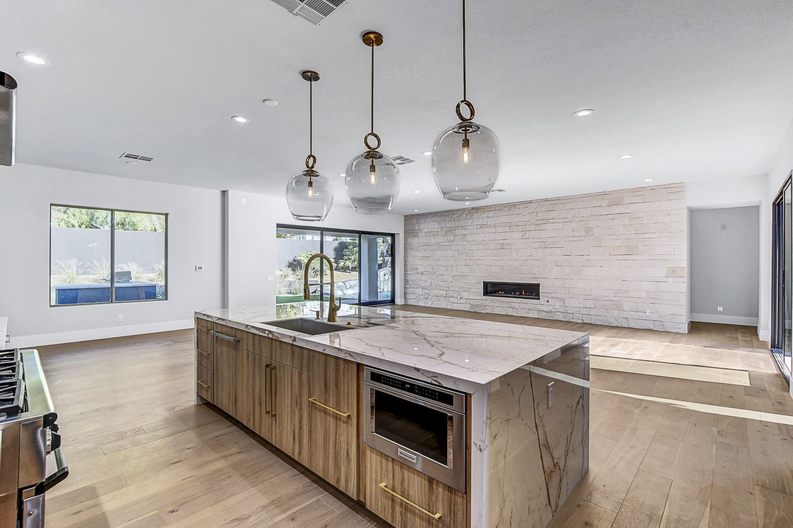 Large glass windows and white oak flooring provide breathtaking views and a majestic feel to the home. A 60-inch gas fireplace is eye-catching, as is the Sanoma white limestone brick on the entire fireplace wall. 15-ft glass sliders open the room up to the backyard, and also provide plenty of natural light for you to enjoy all year round. The open concept layout nicely merges the living room and kitchen, making entertaining easy and convenient.
