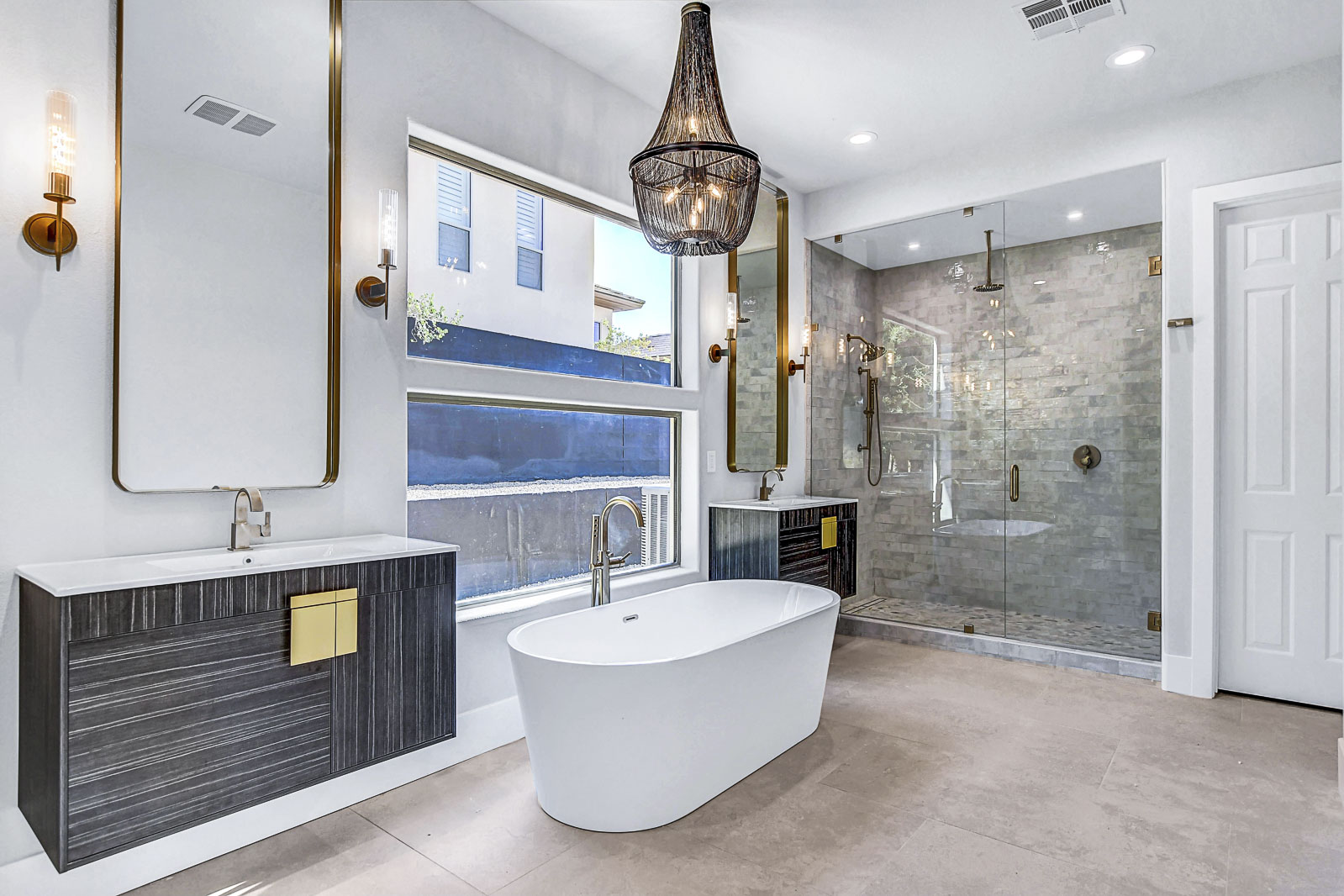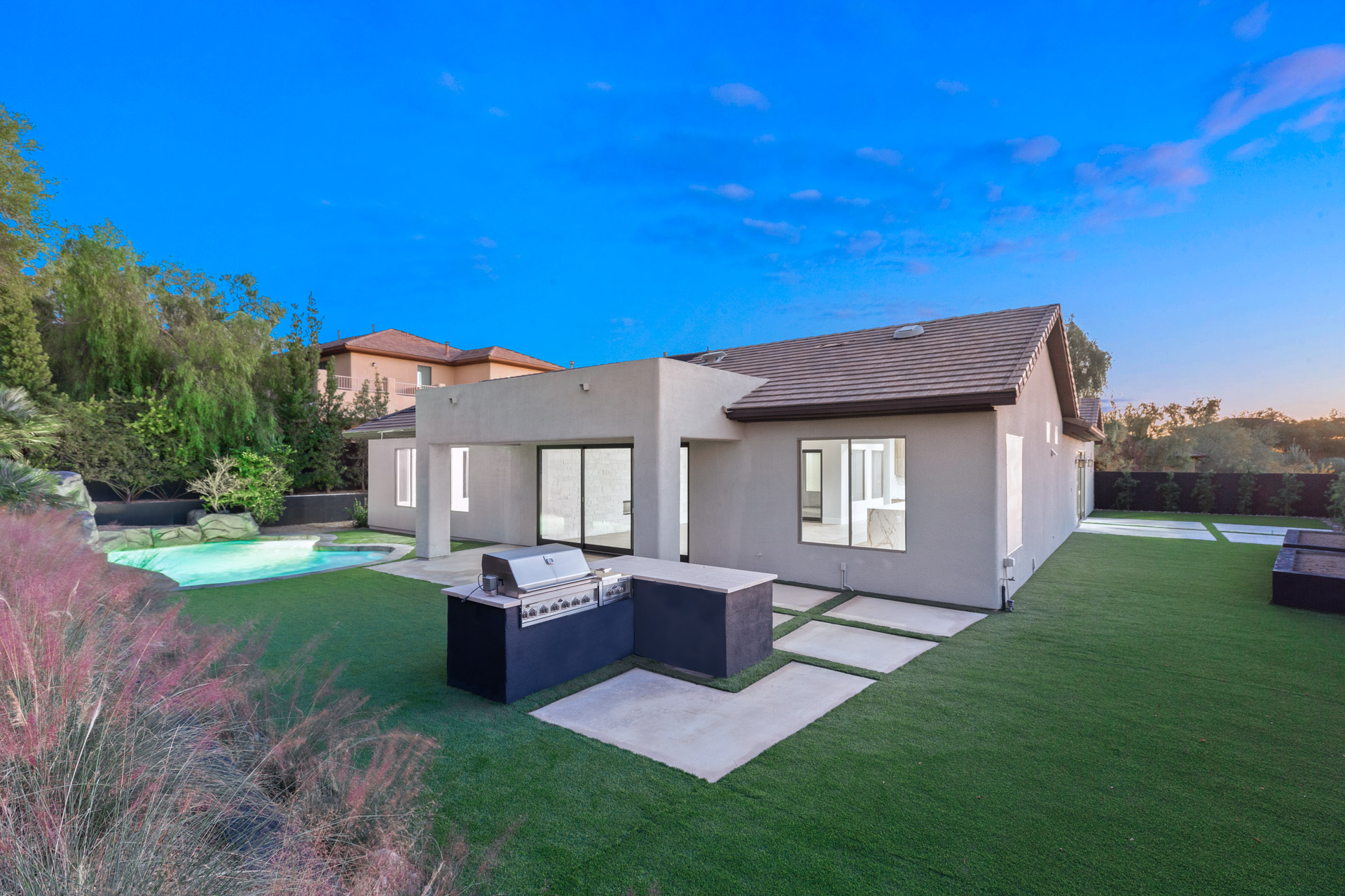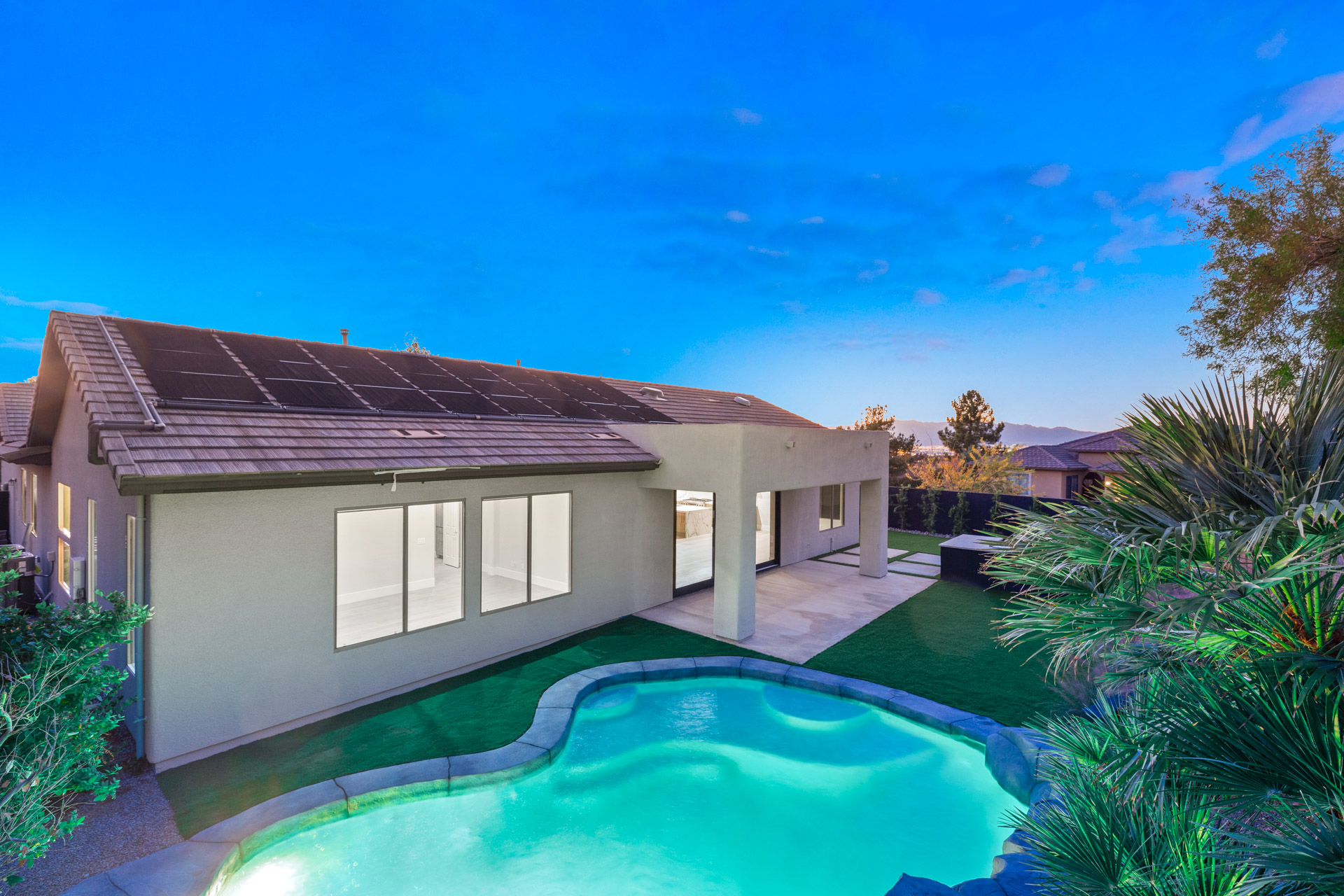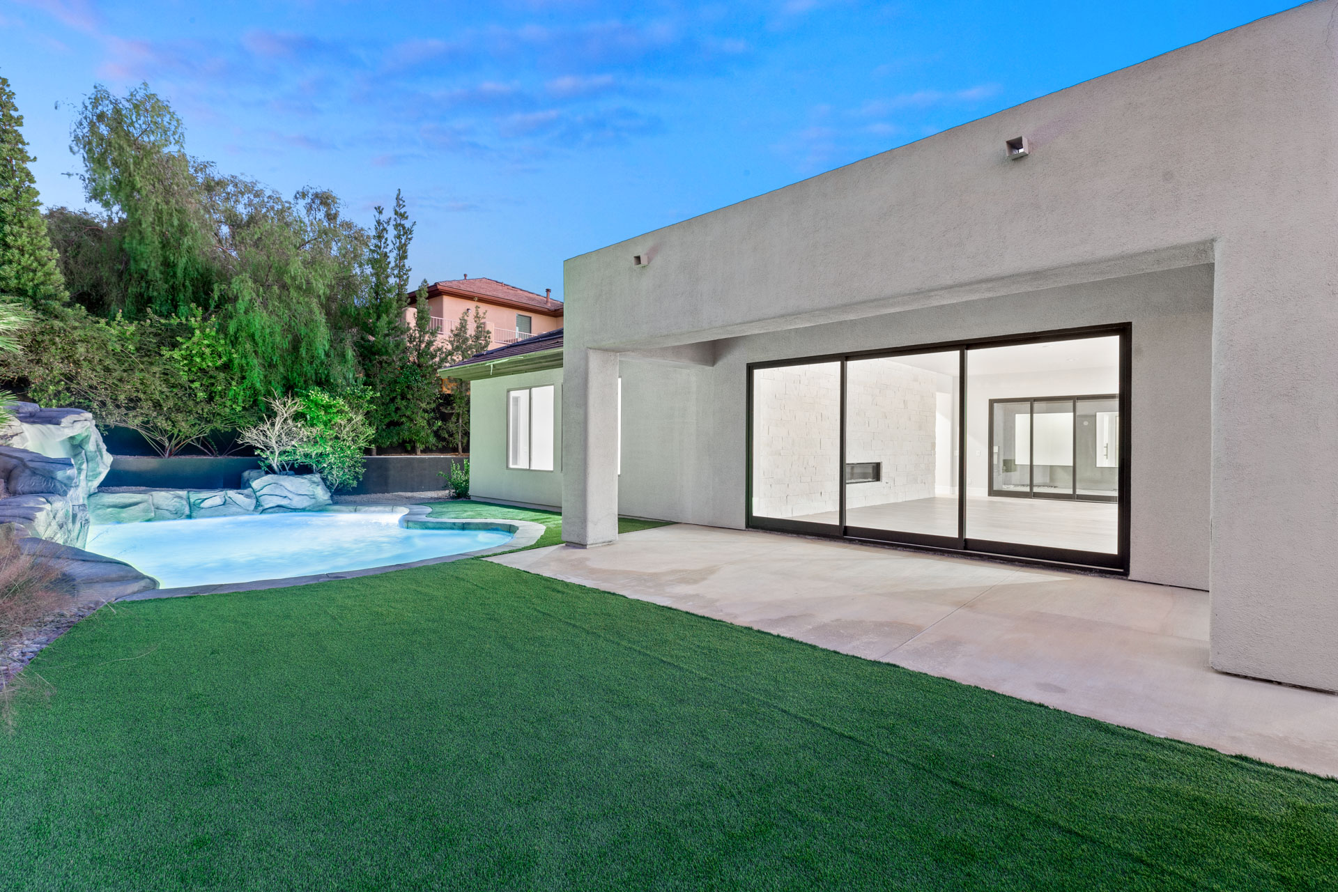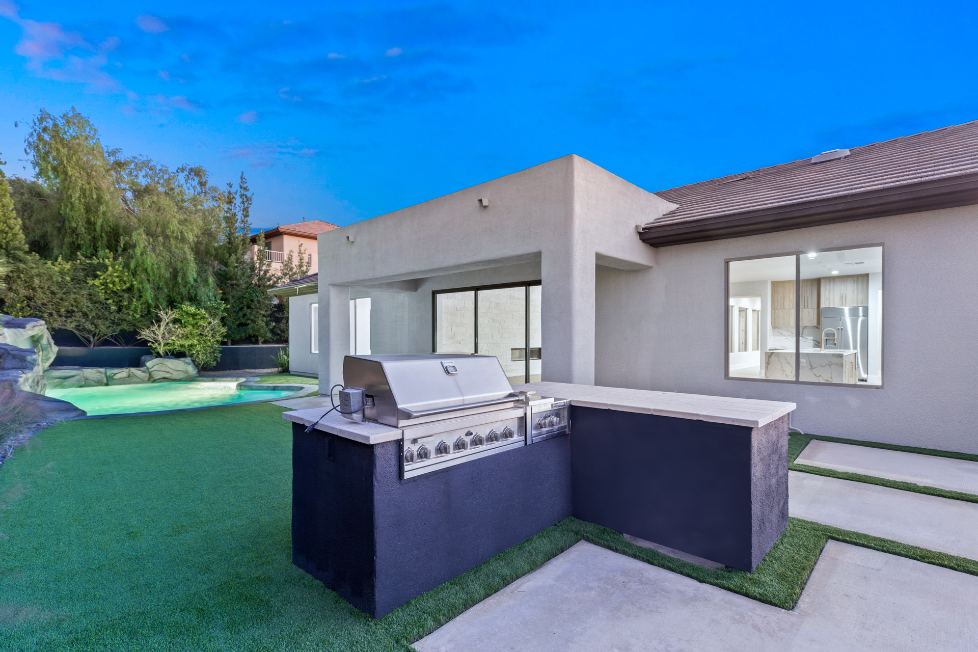 A spacious formal dining area offers access to outdoor entertaining and a fire pit, along with sweeping views of the surrounding area. The kitchen offers porcelain countertops, custom cabinetry, a hidden dishwasher, and a wine refrigerator. Guest bedrooms have been updated, and the primary suite offers spacious windows, plenty of privacy, and an ensuite with a separate tub and shower, dual vanities, and custom closet access. Outside, you'll find the pool with built-in jets and waterfall feature, a stationary swim spa with dedicated pump and solar power, and new plaster and rocks. The landscaping is also brand new, with synthetic grass, a built-in BBQ, and a seating area with gas lines for a fire pit. With rising material costs and good labor that is difficult to find, a fully renovated home in one of the best neighborhoods in Vegas forĀ $1,595,000 or $450/square foot, is tough to beat!