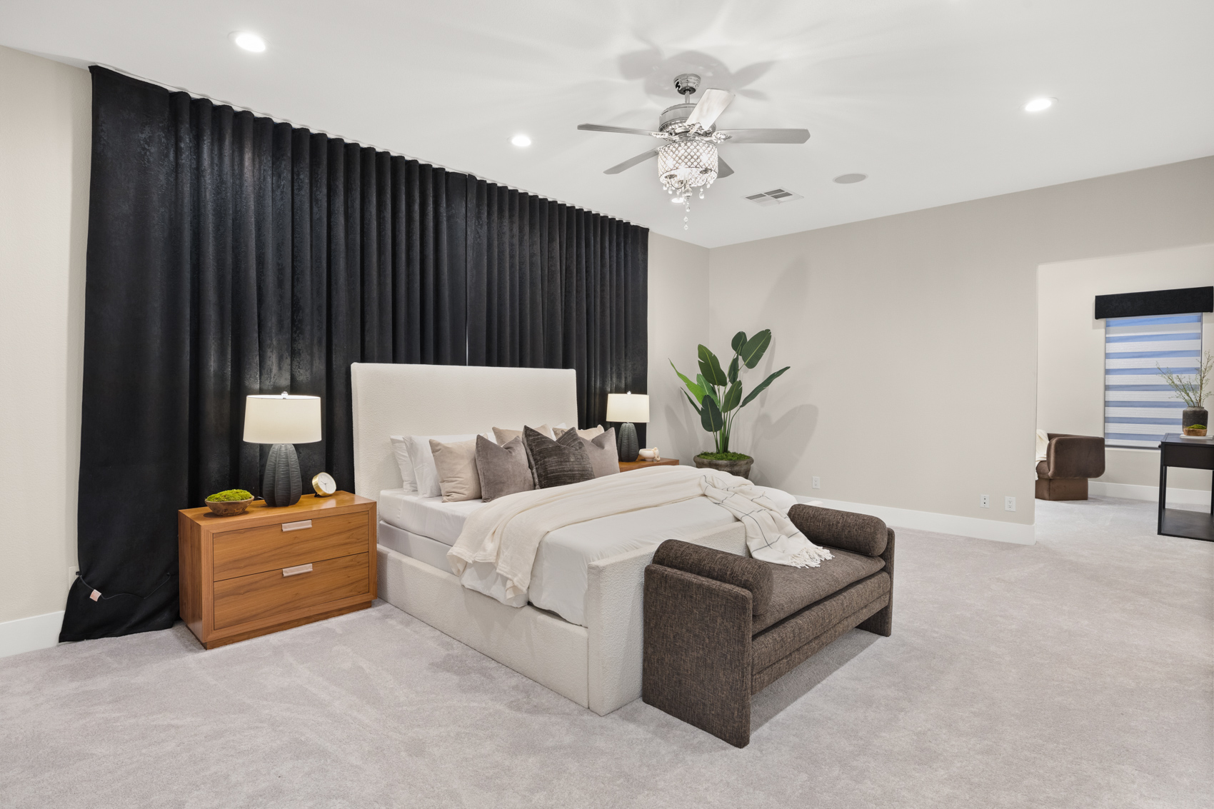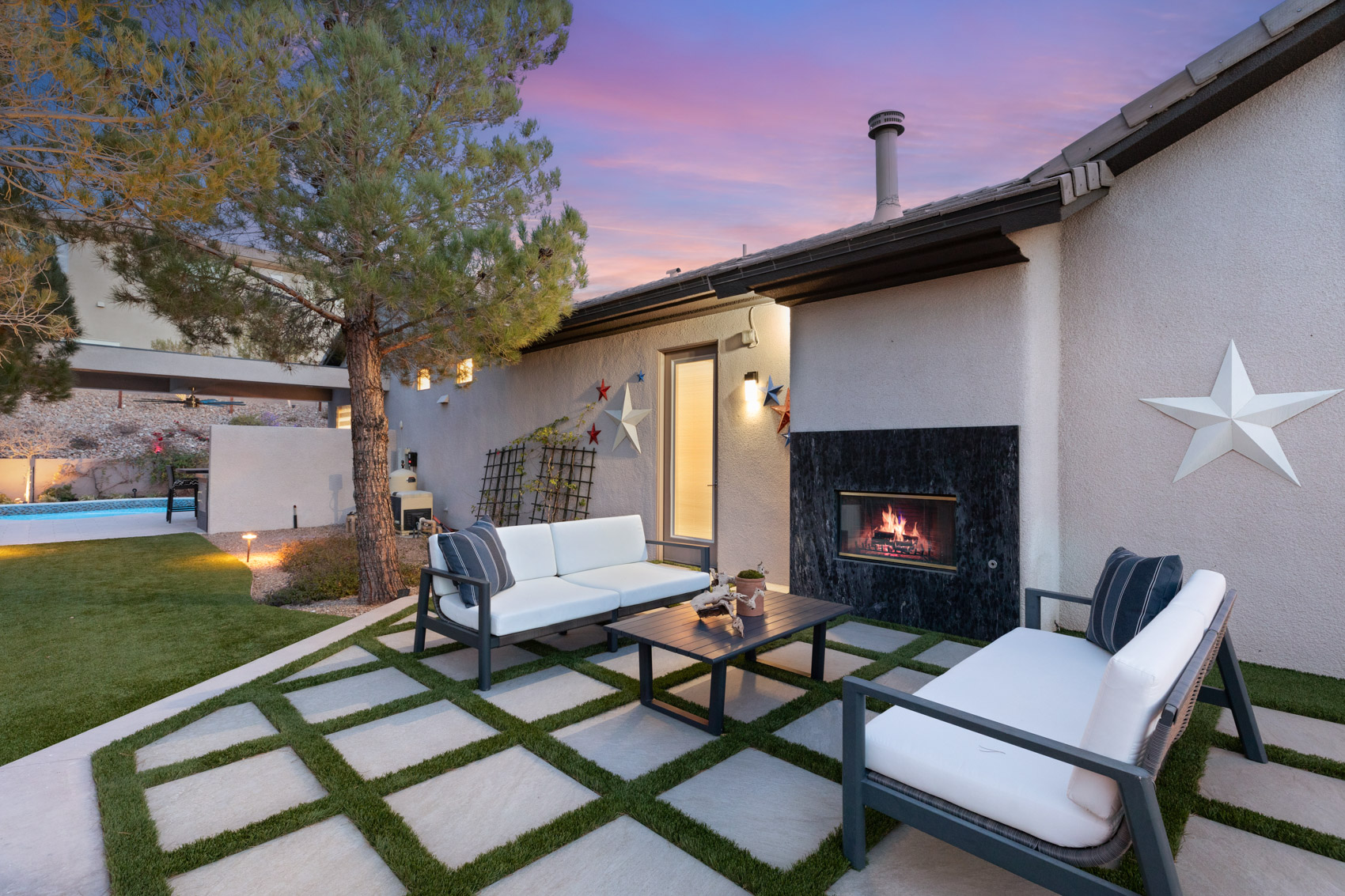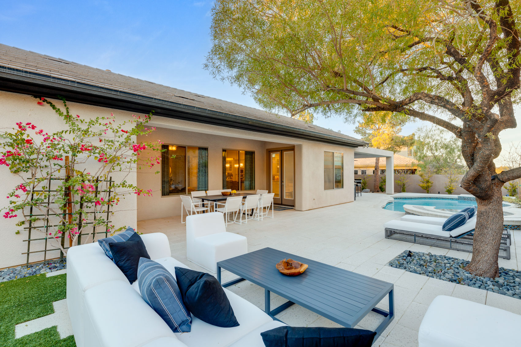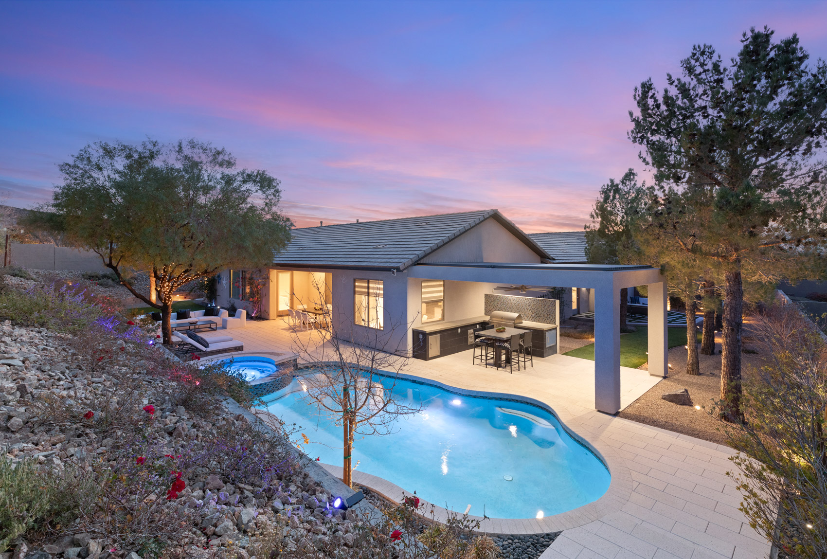 Two spacious secondary bedrooms with custom-designed closets provide generous comfort. They share a luxurious bathroom with a sizable walk-in shower highlighted by unique stone and tile finishes. The backyard is a private oasis with multiple sitting areas, covered patios featuring a fireplace and water fountain, an outdoor kitchen, and a heated pool and spa. This home offers a perfect balance of sophistication, comfort, and style. Living in Anthem Country Club offers an unparalleled lifestyle with world-class amenities, including a championship golf course, tennis and pickleball courts, a state-of-the-art gym, and a community pool featuring dedicated swimming lanes. The magnificent clubhouse and exceptional dining options create the perfect setting for grand social gatherings and cherished memories. Surrounded by breathtaking views of the strip and lush, manicured landscapes, this extraordinary community makes every day like a retreat.