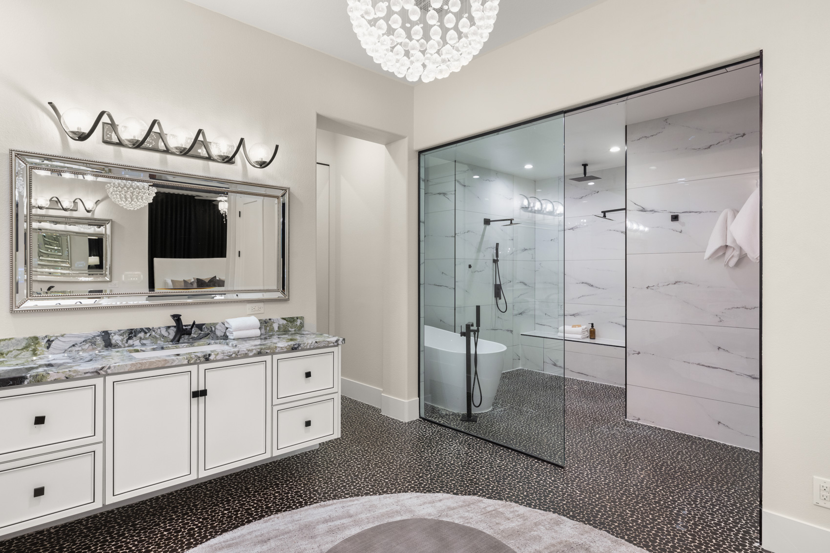 The expansive kitchen features a sleek stone island with additional seating, a casual dining area, and a butlerās pantry. Modern custom cabinetry, top-of-the-line stainless steel appliances, beverage coolers, an ice maker, three ovens, and a warming drawer make this space as functional as it is stylish. The elegant primary suite has a cozy sitting room and can be privatized with a chic barn door. French door leads to the outdoor heated jacuzzi, creating the perfect retreat. The spa-like bathroom includes a freestanding tub inside a spacious walk-in shower with multiple shower heads, dual vanities, a makeup station, and two large custom walk-in closets.