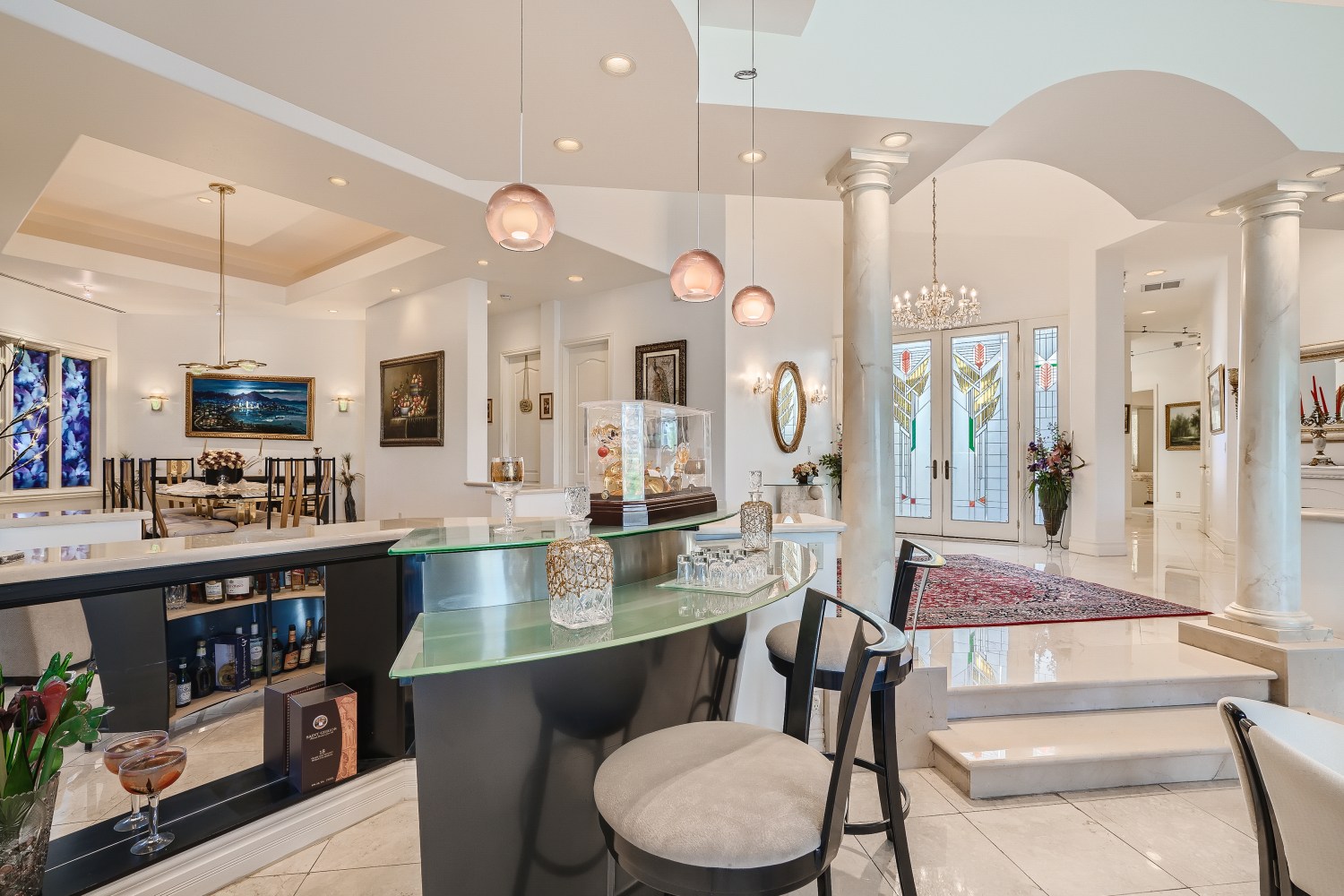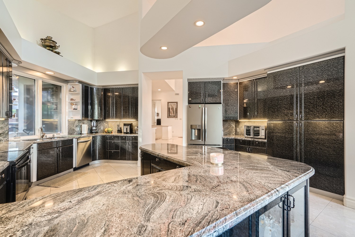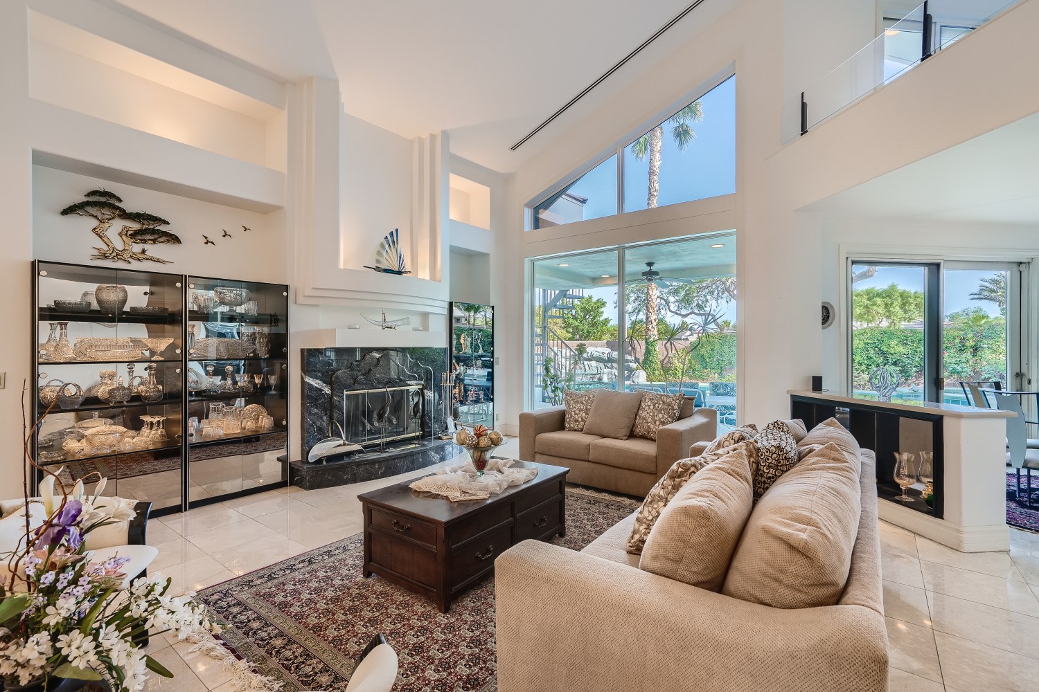 Custom single story home in the beautiful and exclusive guard gated community of Canyon Fairways, ideally located in the heart of Summerlin. Large courtyard entrance, wide open floor plan with abundant natural light, tall ceilings, and walls of glass overlooking the pool, spa, and massive waterfall.