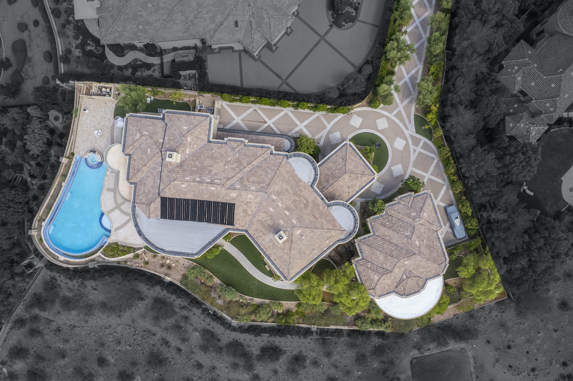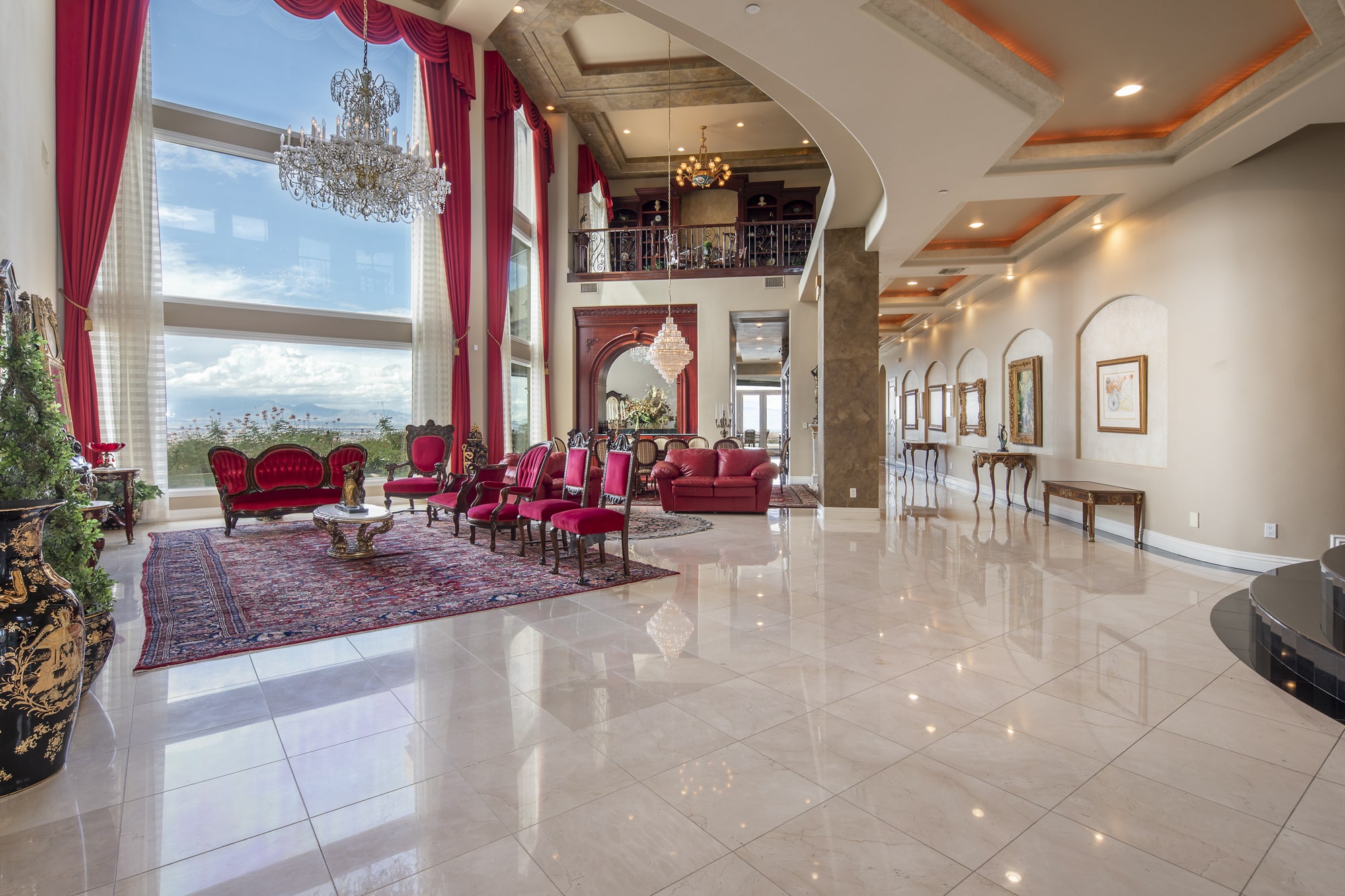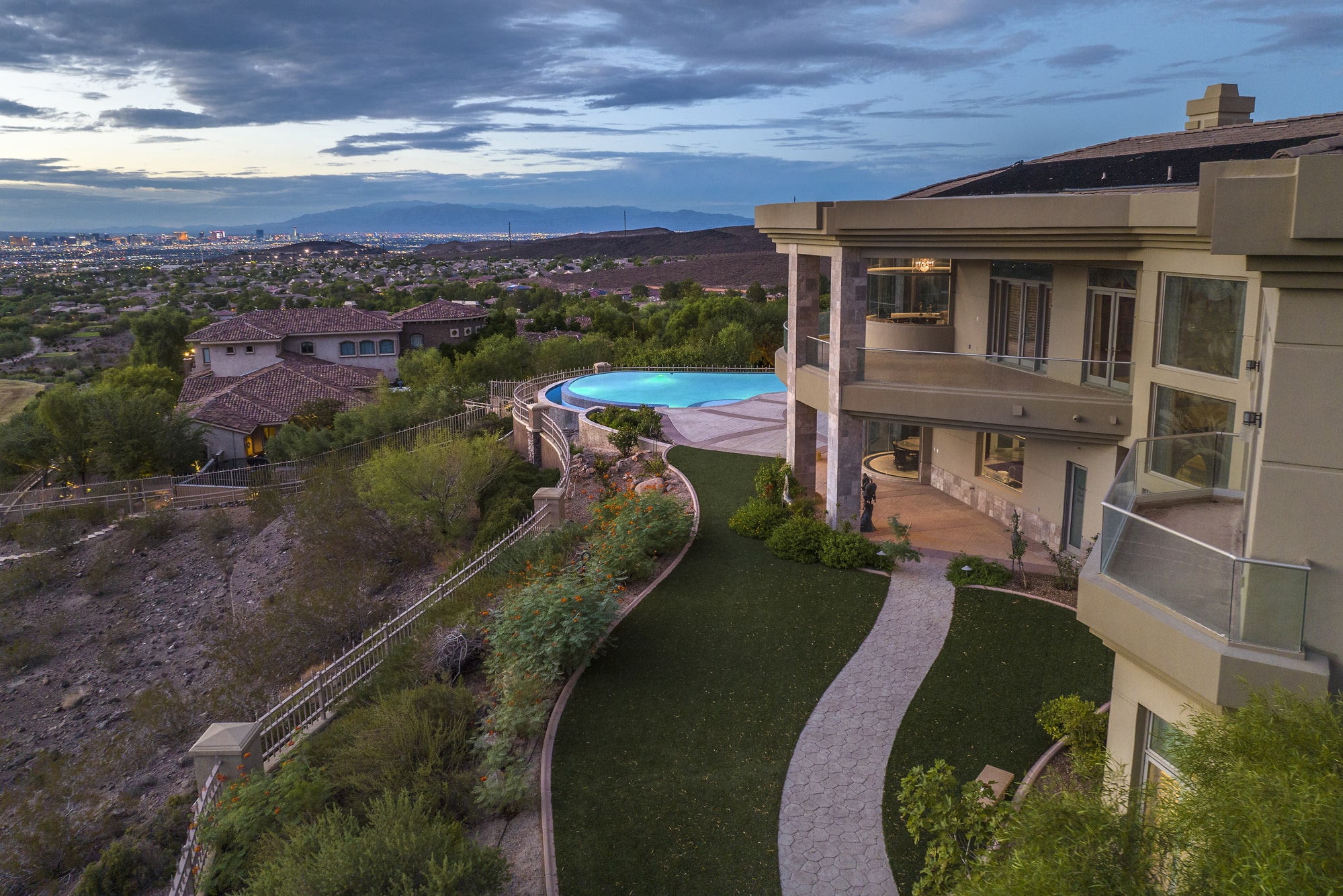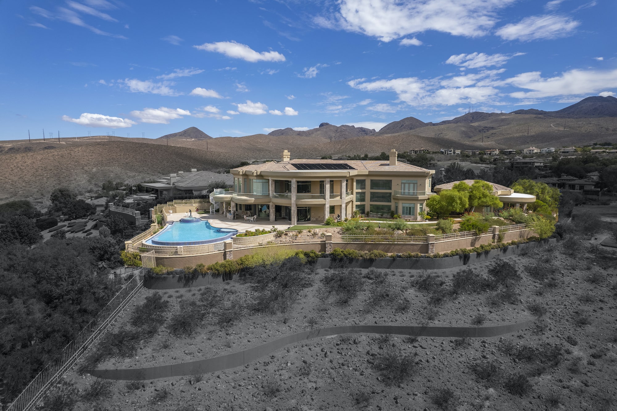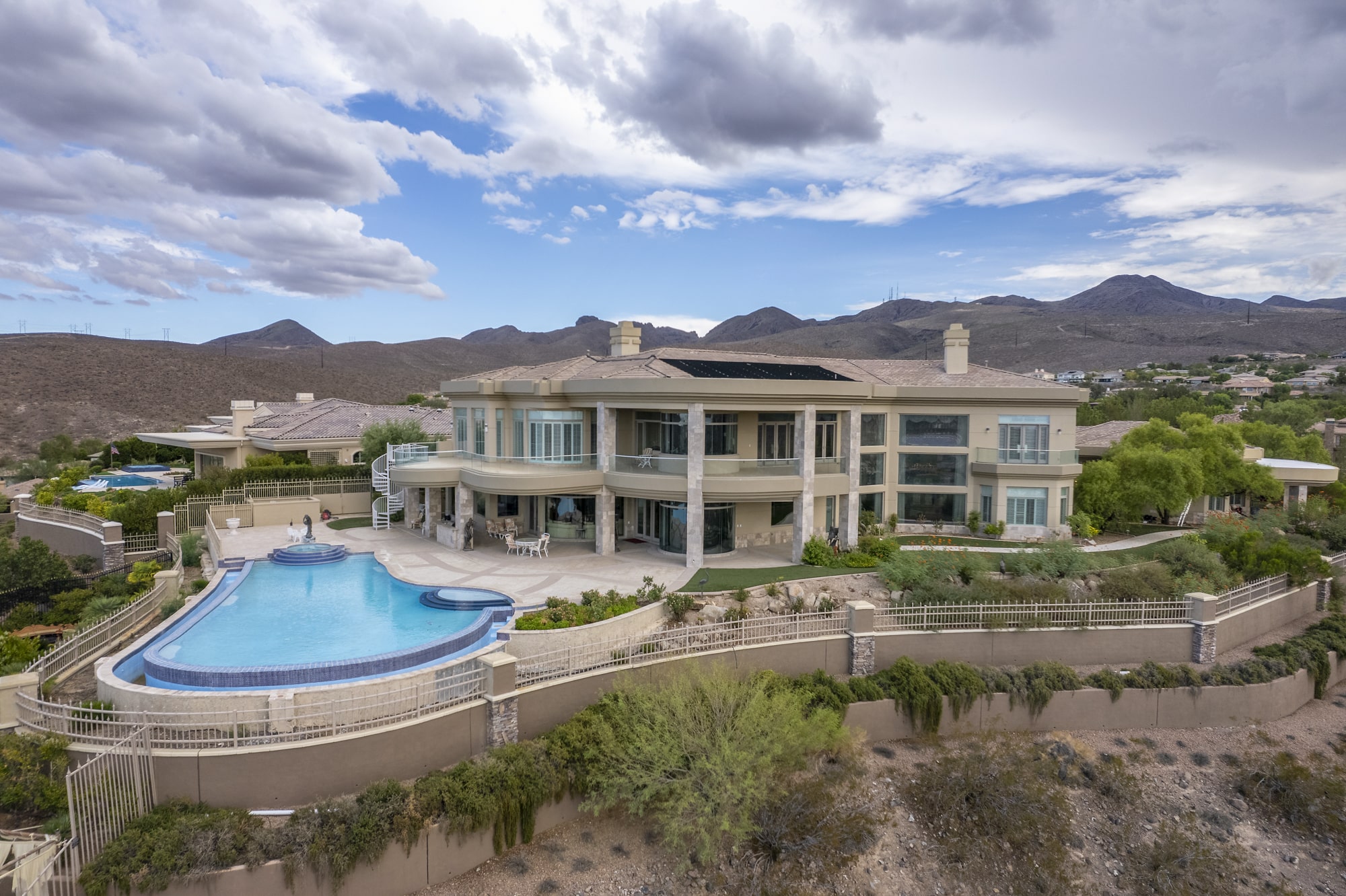 Inside the 9,655 sq. ft. main home be swept away by the custom inlaid tile, floor to second story ceiling windows highlighting your strip and mountain views, vaulted ceilings, spiraling staircase, custom cherry and travertine finishes, and second-level balcony overlooks. Outside, the covered patios, with outdoor kitchen and dining areas, lead to the custom tiled pool deck and large, disappearing edge pool affording views of the entire Las Vegas valley and surrounding mountains.