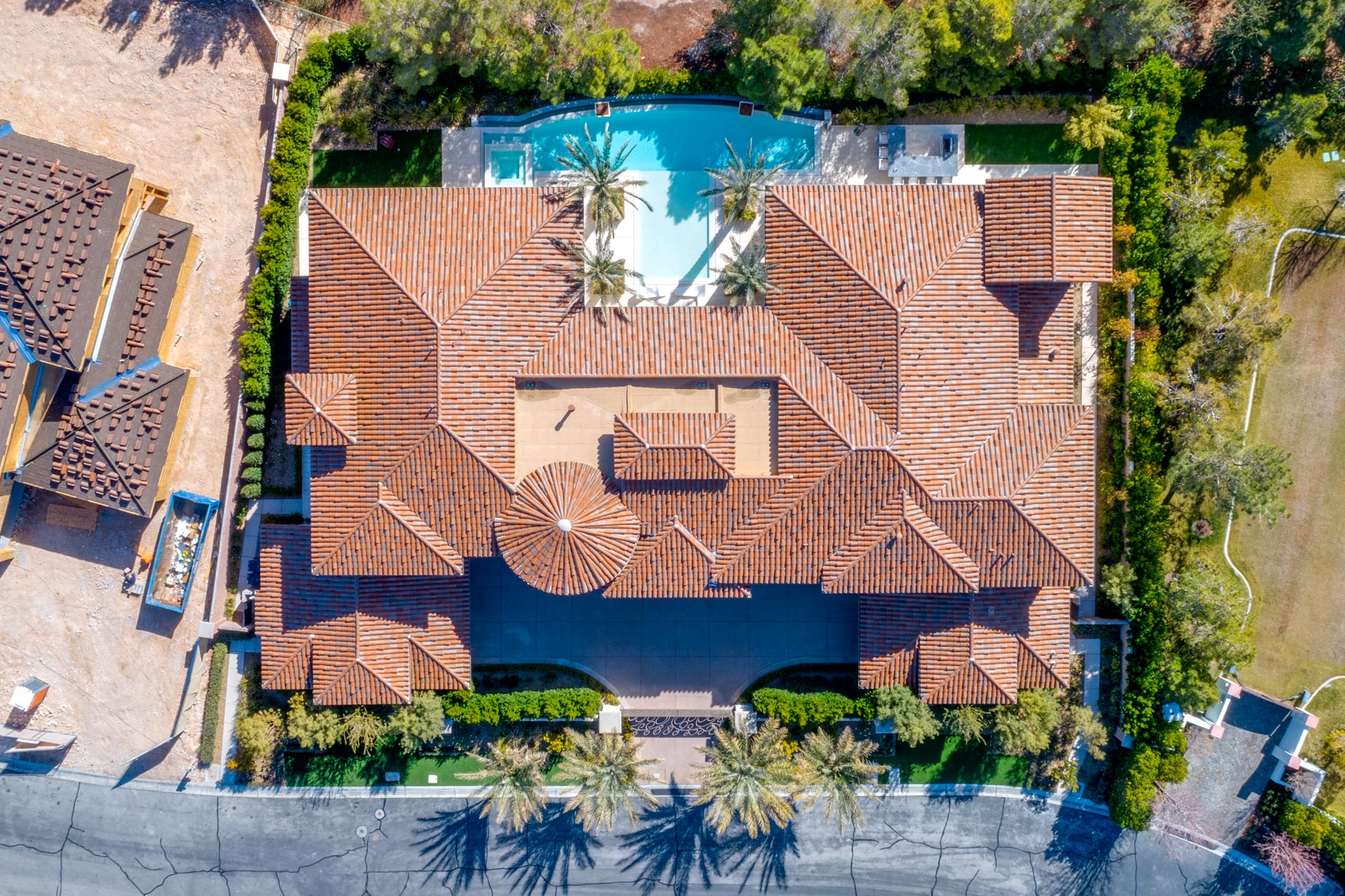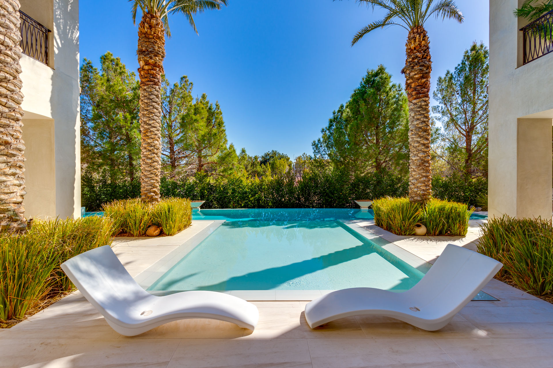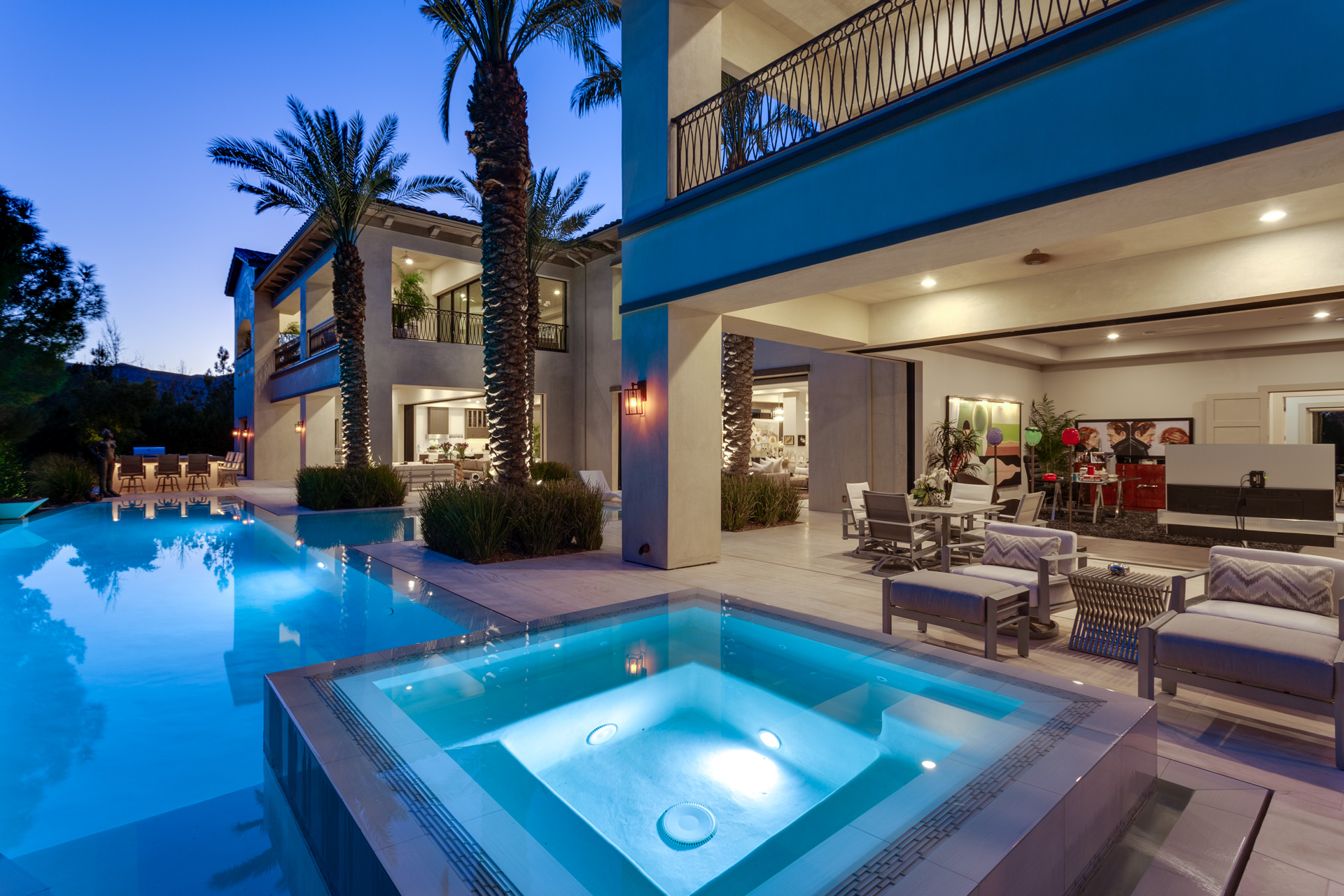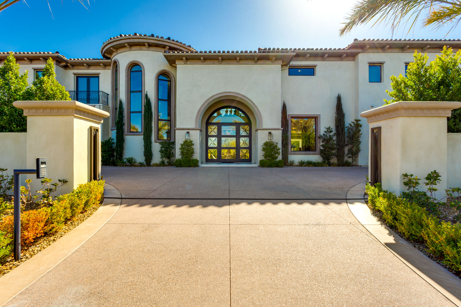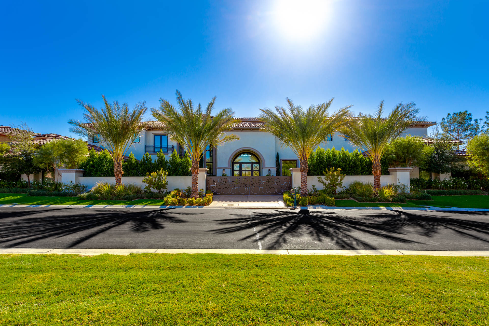 The main level opens to a "T-shaped" pool and spa complex with an expansive covered patio. There are multiple seating and dining areas and a fully equipped outdoor kitchen. Second-story balconies overlook the rear yard, and the views extend beyond golf greens to the distant mountains. The emphasis throughout is on style and comfort, sophistication and flair. The home has four bedrooms, five full baths plus a half bath, a total of more than 13,700 square feet on two levels, and an additional 1,700 square feet of garage space.