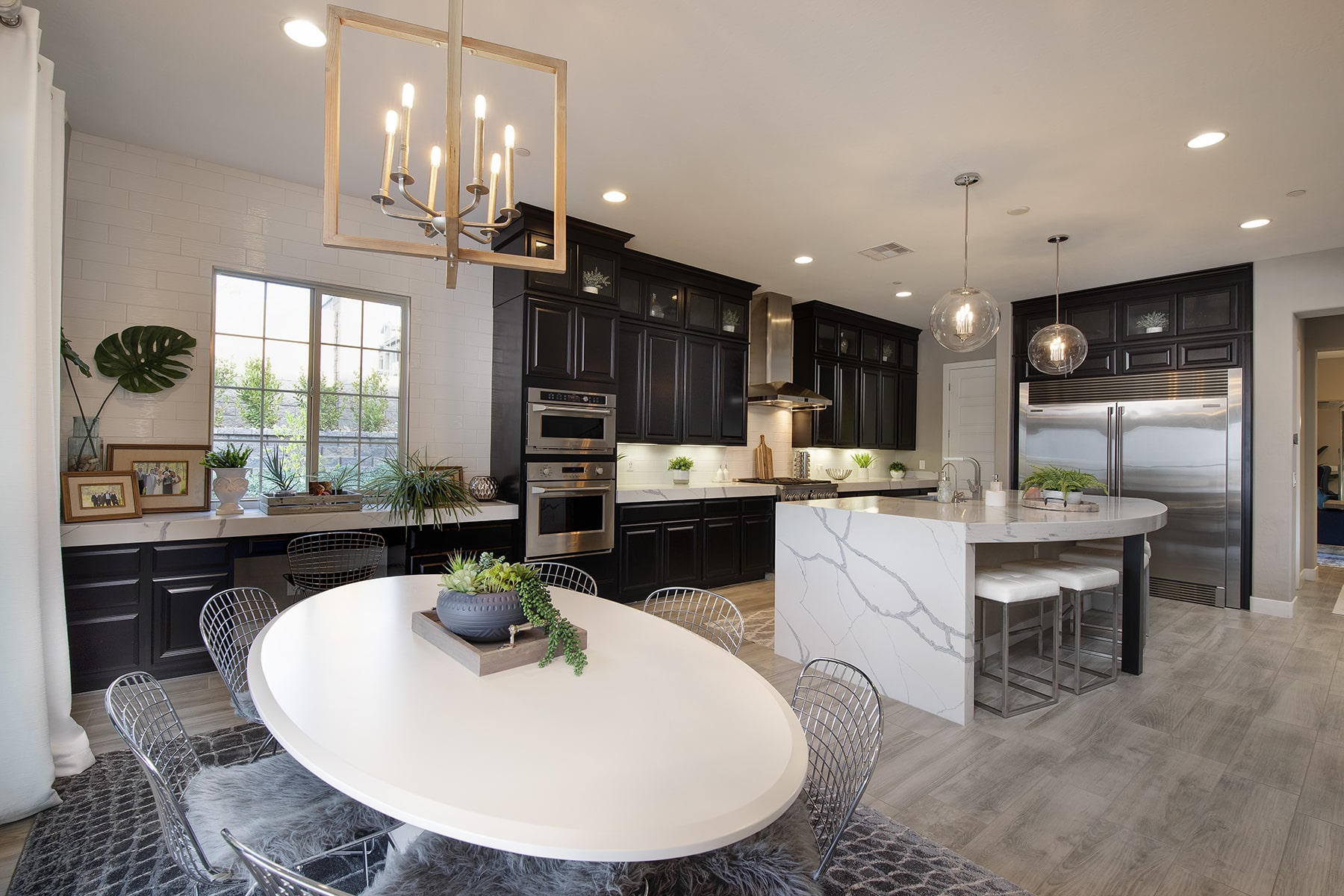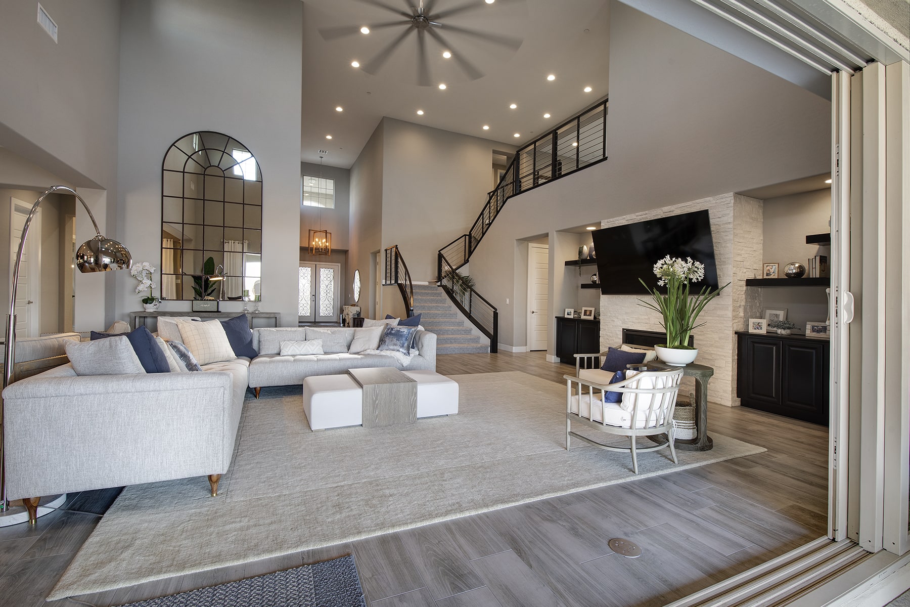 This Modern Mediterranean with High Vaulted Ceilings, Expansive Strip Views starting at Entry Offers a Entertaining Great Room with Built-ins/Floating Shelves, Stacked Stone Fireplace Surround, Modern 96" Ceiling Fan, Gourmet Kitchen w/Quartz Waterfall Island, Custom Cabinetry and Lighting, High End Stainless Steel Appliances(side by side Ref. and Freezer, Microwave, Convection Oven, 6-Burner Stove & Oven, 2 Dishwashers, Beverage Ref. and Ice Maker)