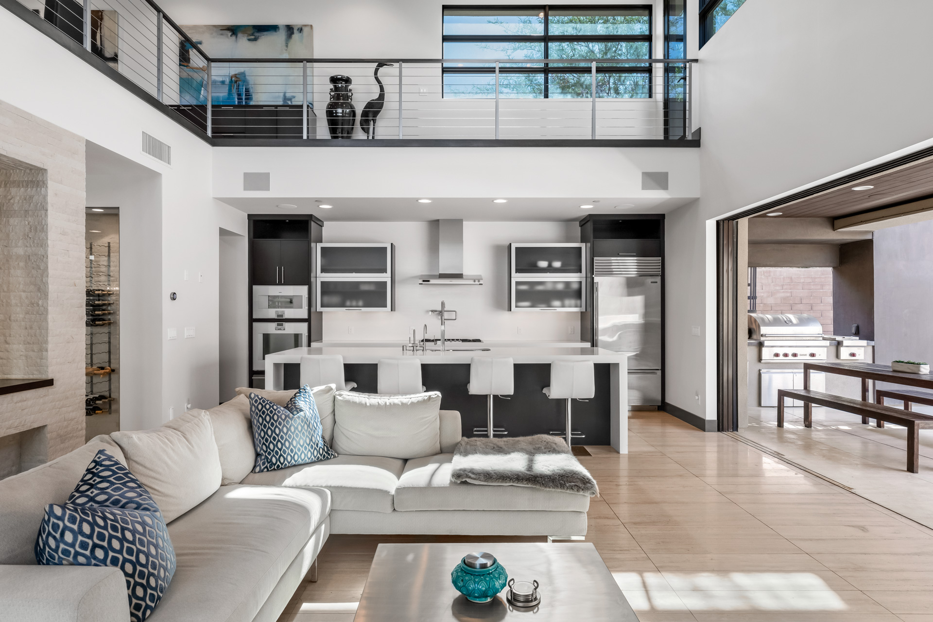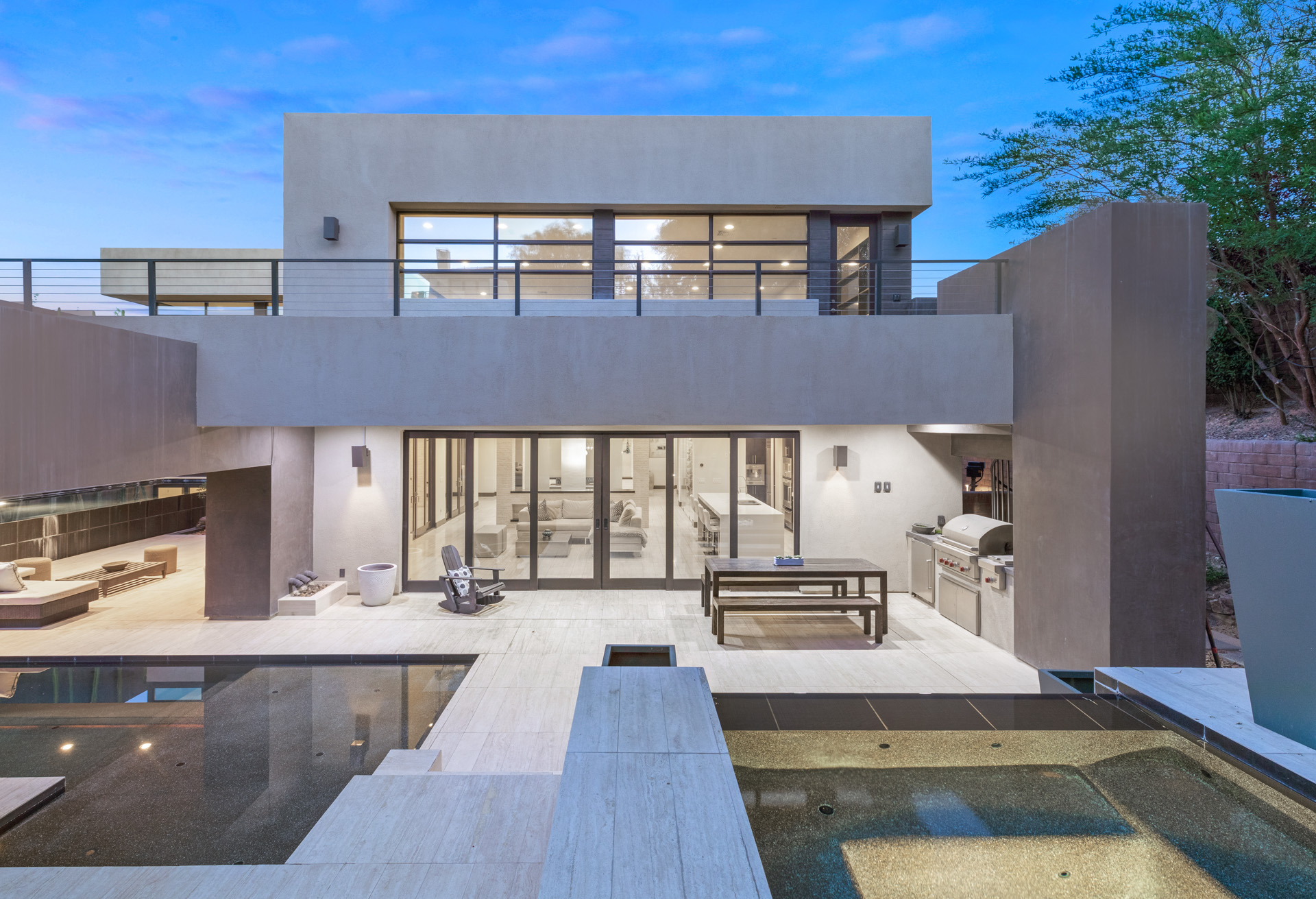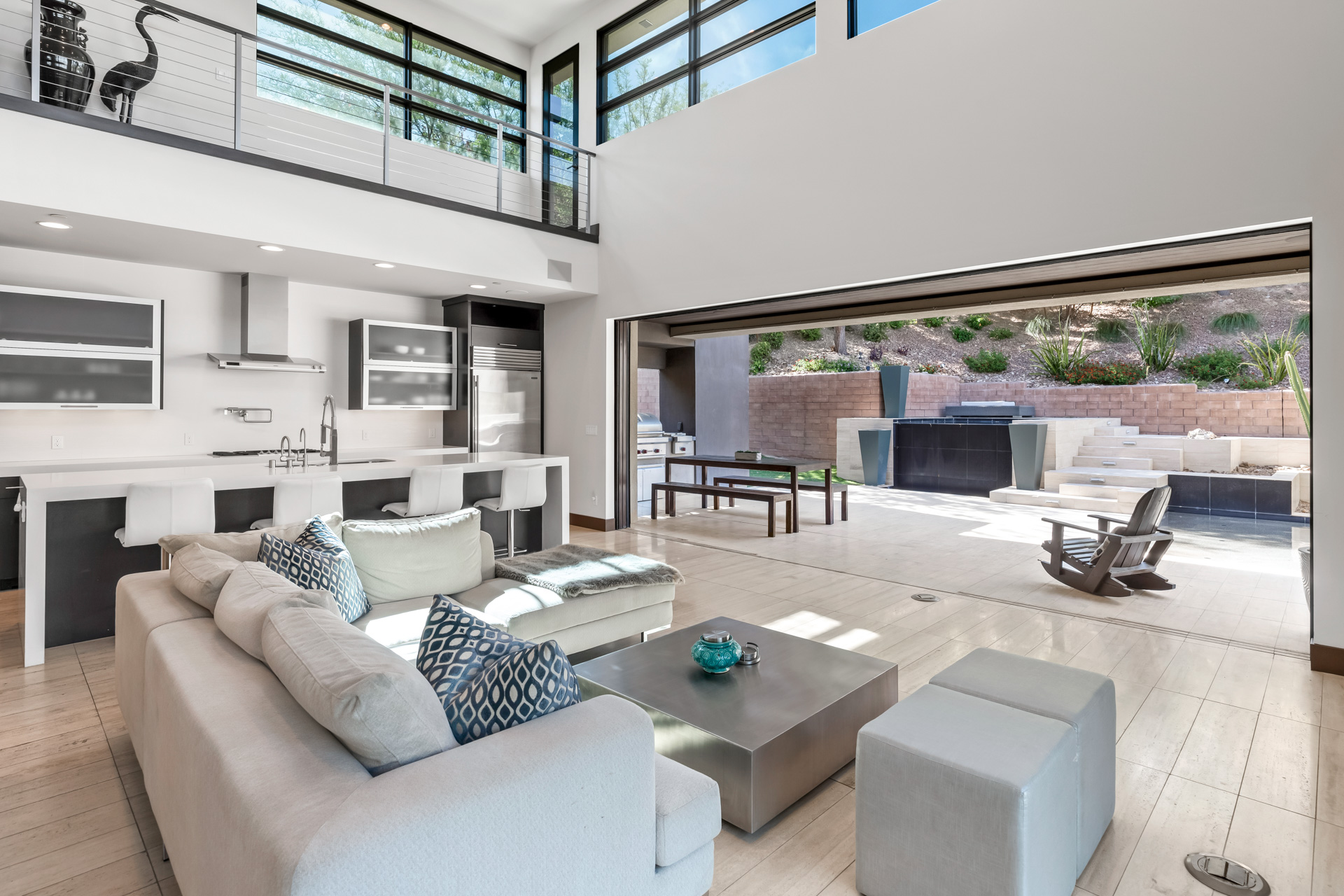 The great room includes a warm fireplace, media center, and kitchen area with island bar seating. A chefās kitchen includes double ovens and a kitchen nook including a second refrigerator/freezer unit, dishwasher, and deep sink. The master suite occupies the opposite wing and opens to a covered patio. A large master bath holds a raised soaking tub and large, walk-in shower. Upstairs, a loft with wet bar overlooks the first floor and exits to a balcony. The gym and a bedroom, with private bath and walk-in closet, exit through pocketed glass doors onto the roof-top deck. Located in Summerlin, nestled against the breathtaking Red Rock Conservation Area and only minutes from the Las Vegas strip, this smart home represents the best of resort-style urban living.