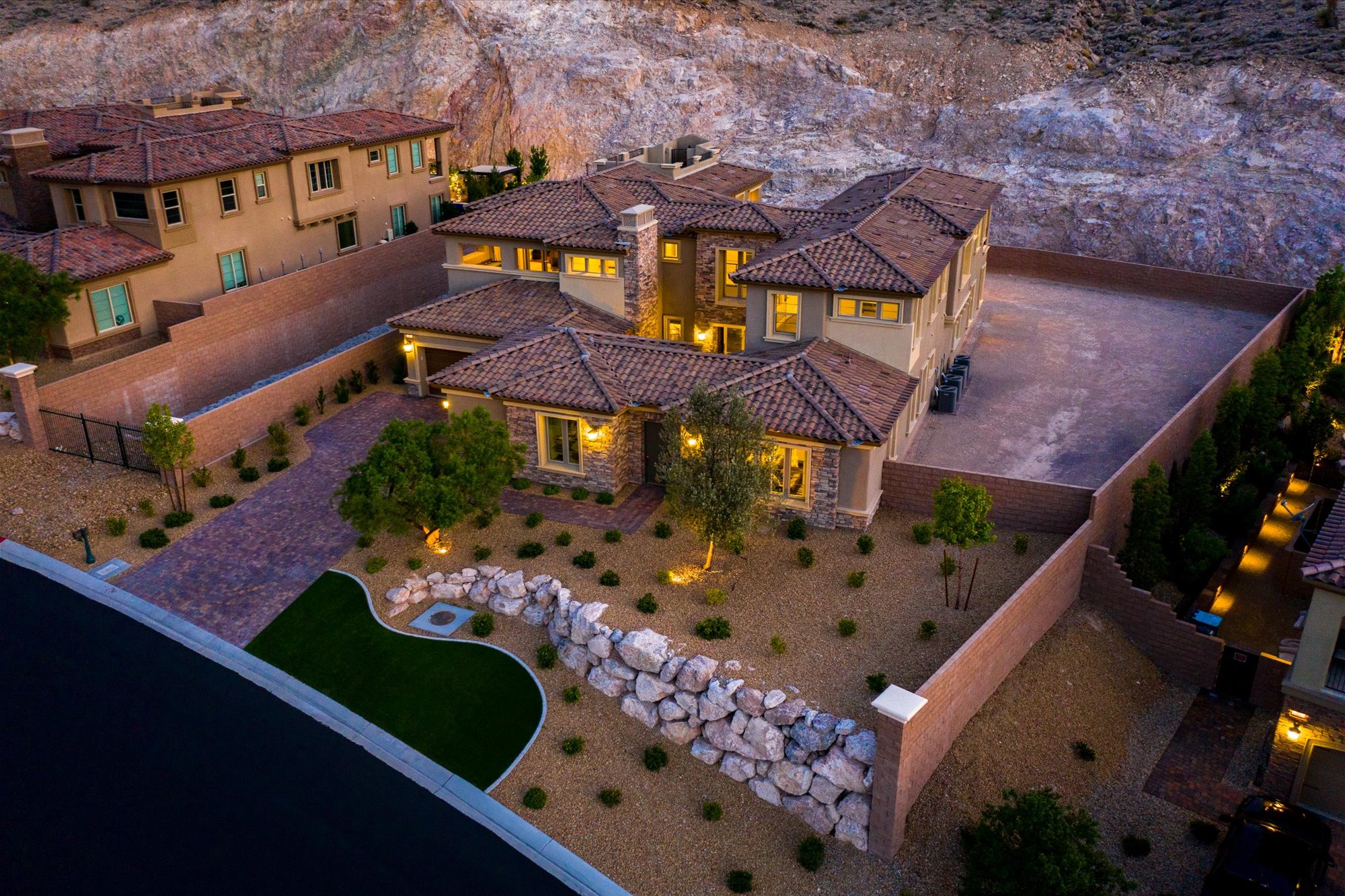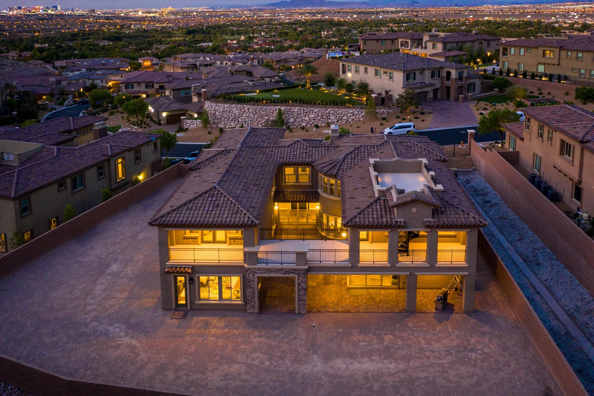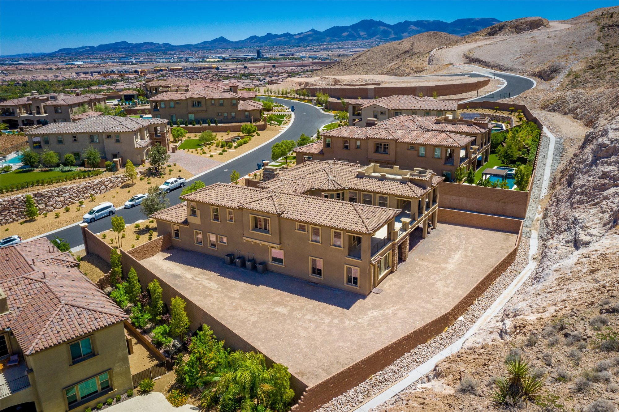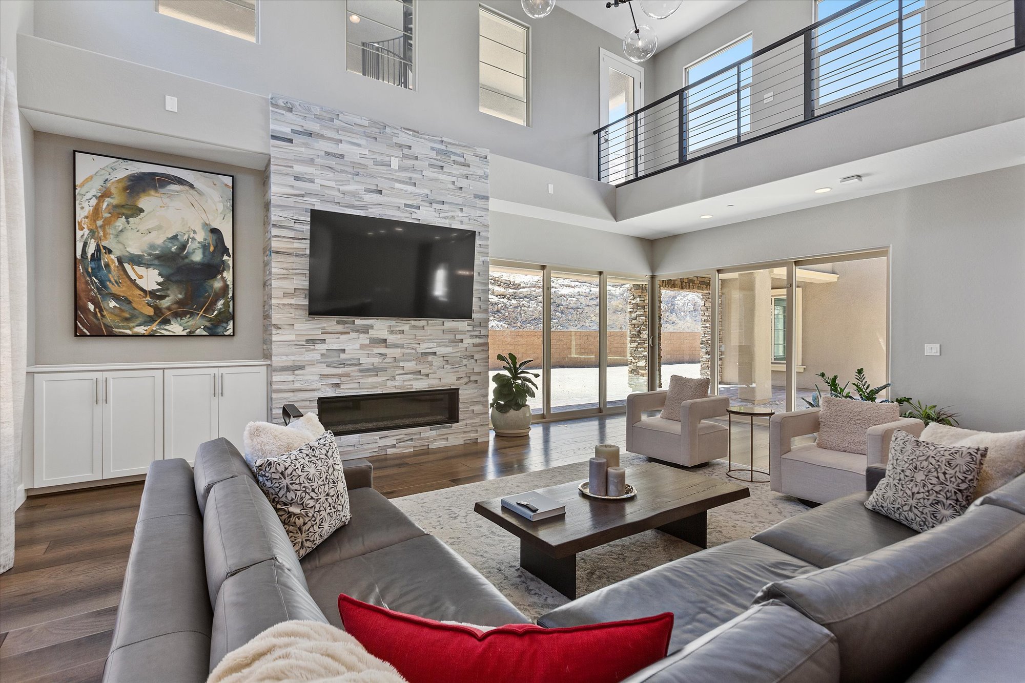 Designed to blend beautifully with its natural surroundings, this modern villa on a half-acre lot in Southern Highlands boasts a private entry courtyard with a fireplace that acts as an open-air living room. Step inside the six-bedroom, seven-bath two-story residence, however, and space expands around you. An interior balcony and catwalk encircles the main floor public rooms, and a rooftop viewing deck captures the Las Vegas skyline and nighttime Strip views.
