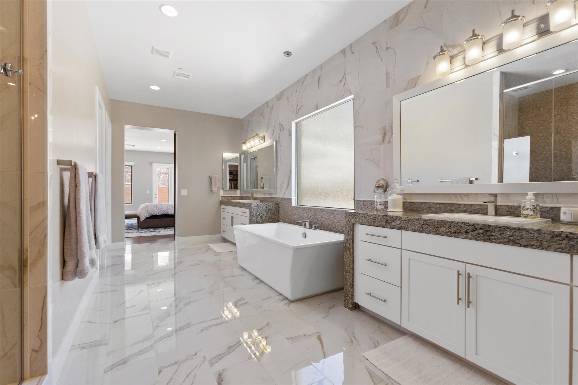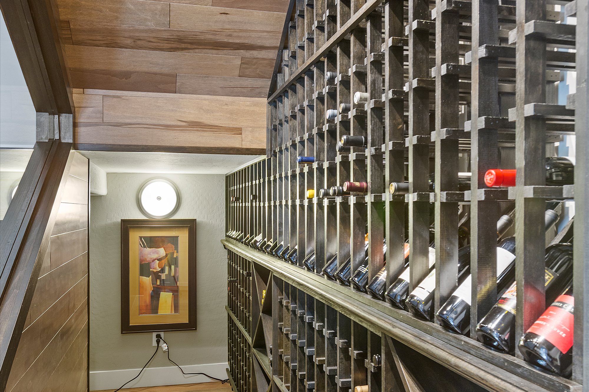 A first-floor primary bedroom occupies a private wing and has a sumptuous bath, two walk-in closets and direct access to the rear yard. Two additional bedrooms, each with a walk-in closet and ensuite bath, occupy the main floor. The front bedroom is currently used as an office. The home's open plan includes a living room with a beautiful stone fireplace, a large kitchen with pro-style appliances, a massive island, and a charming dining nook with a semi-circular window wall. A wine-storage closet is tucked into space under the stairwell. Upstairs, the mix of public and private space includes an open loft with wet bar, three bedrooms with private baths, a laundry center and an outside deck with close-up views of the cliffs, as well as a circular staircase leading up to the rooftop deck. The home has garage space for four vehicles.