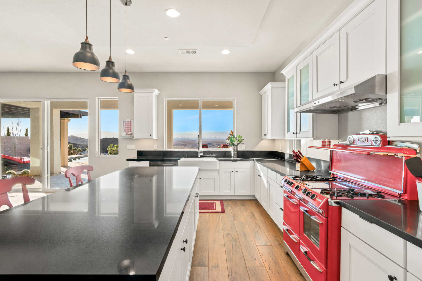 Step into the bright and spacious interior where natural light fills the rooms. The kitchen is a good mix of form and function with a huge farmhouse sink, sleek bar seating, pendant lights and under-counter lighting, along with a large walk-in pantry. There are amazing views of the Strip, City and Mountain when you are cooking up those great meals. There is a charming vintage 1952 gas stove that is the showcase of this kitchen and functions perfectly! There is also a bar, seamlessly connecting the kitchen to the great room, perfect for entertaining family and friends.