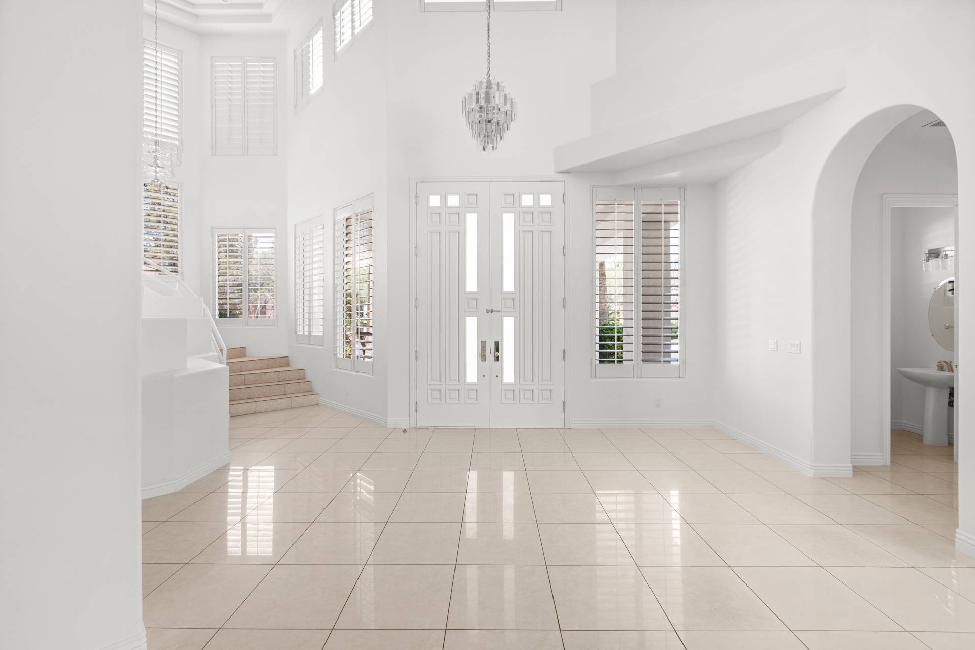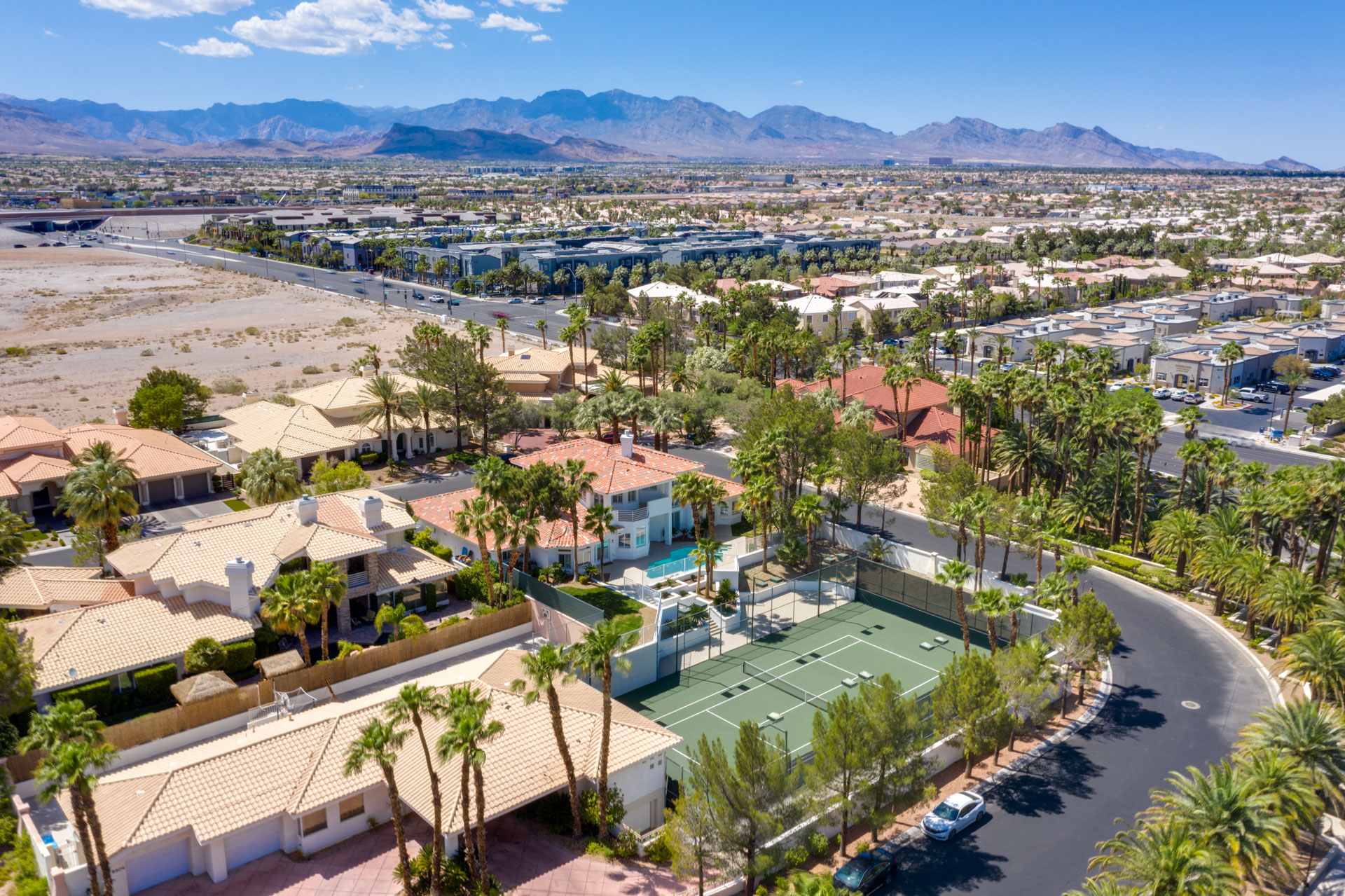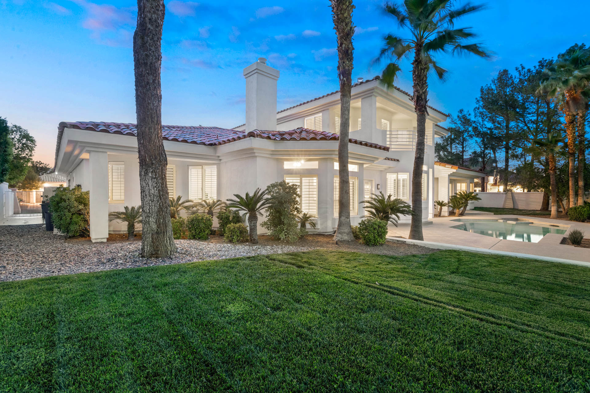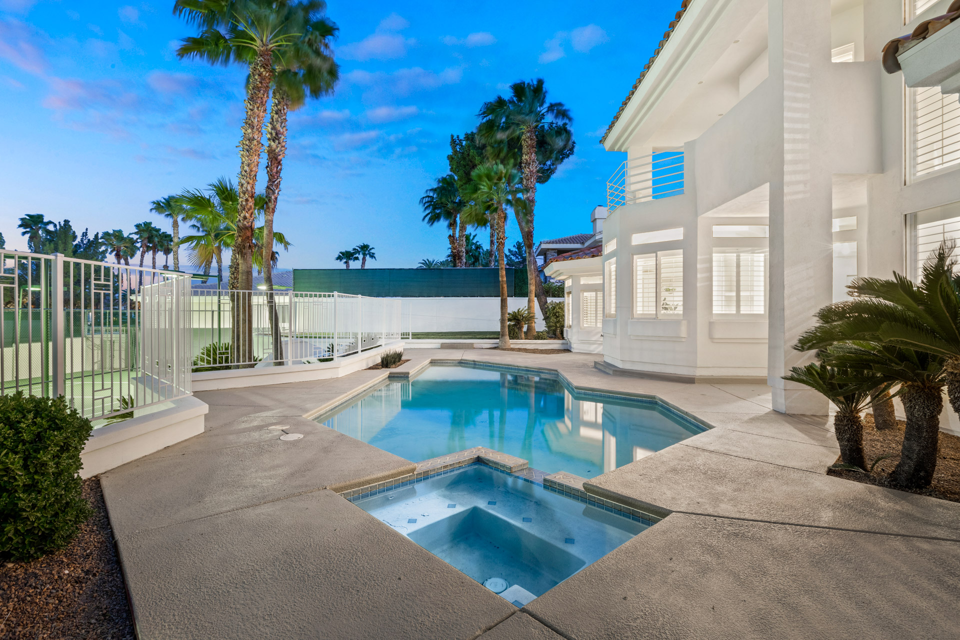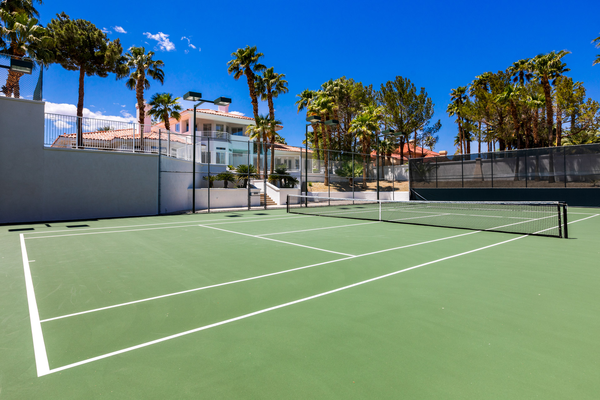 With exquisite design and picturesque surroundings, this is undeniably the best tennis court in Las Vegas. Deep-set 20+ feet into the ground to protect against wind, itās no surprise that world champion tennis professionals have practiced here. With mature landscaping and a fully-walled lot, this is a dream home in a dream location. Enter through massive double doors that lead to a spacious interior foyer. Circular stairs lead to a private master retreat on the upper level. It features a pampering bath, custom-fitted closet/dressing room and an expansive balcony that overlooks the pool and tennis court, with distant mountain vistas beyond.