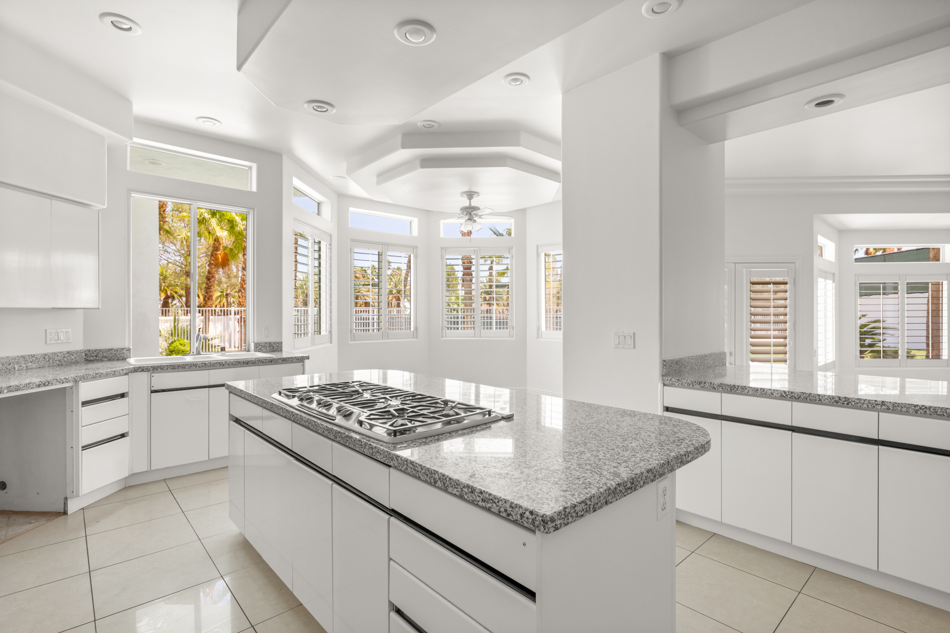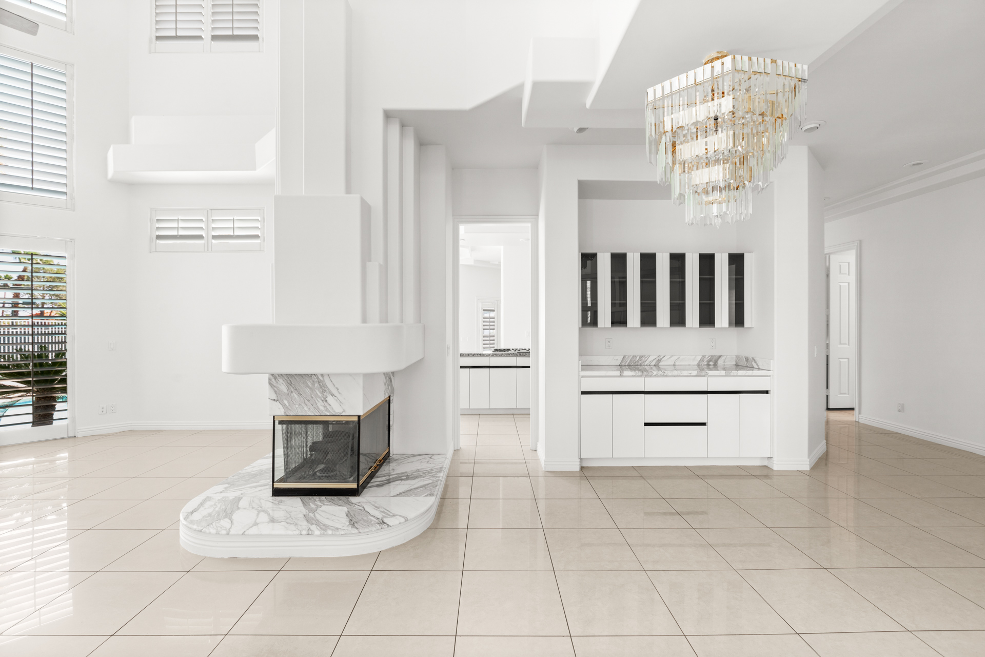 A two-sided fireplace separates the living room from formal dining space, while a convenient beverage bar adds to ease of entertaining. White walls and oversize white tile floors, along with a two-story wall of shuttered windows, fill the interior with light, while built-in niches provide unique display space for an art collection. A separate family room has its own fireplace with backyard views and access to the outdoors. The kitchen is a picture of efficiency with double wall ovens and a center island with pro-style gas cooktop. The clean-up area is situated apart from food-preparation centers, and there is ample room for an oversize built-in refrigerator-freezer. A charming dining nook overlooks the backyard with its mature landscaping and pool. The kitchen also features a walk-in pantry, and the home's large utility room is conveniently located. With nearly 4,600 square feet of living space, this incredible home boasts four bedrooms, five baths and a three-car garage. It has an outdoor barbecue stub, and drip irrigation.