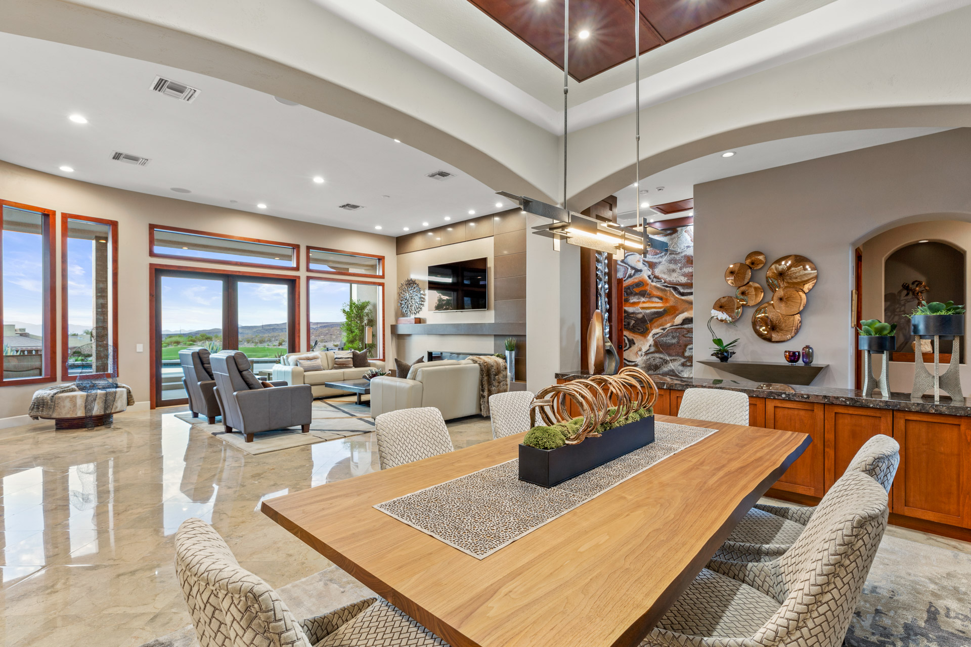 An exquisitely simple open-plan interior includes spacious rooms with beautiful ceiling details, fine wood cabinetry and finishes, and curving glass walls that overlook the pool and spa, capturing views of the golf course and distant mountains beyond. Marble flooring and dramatic stone accent walls add character throughout.