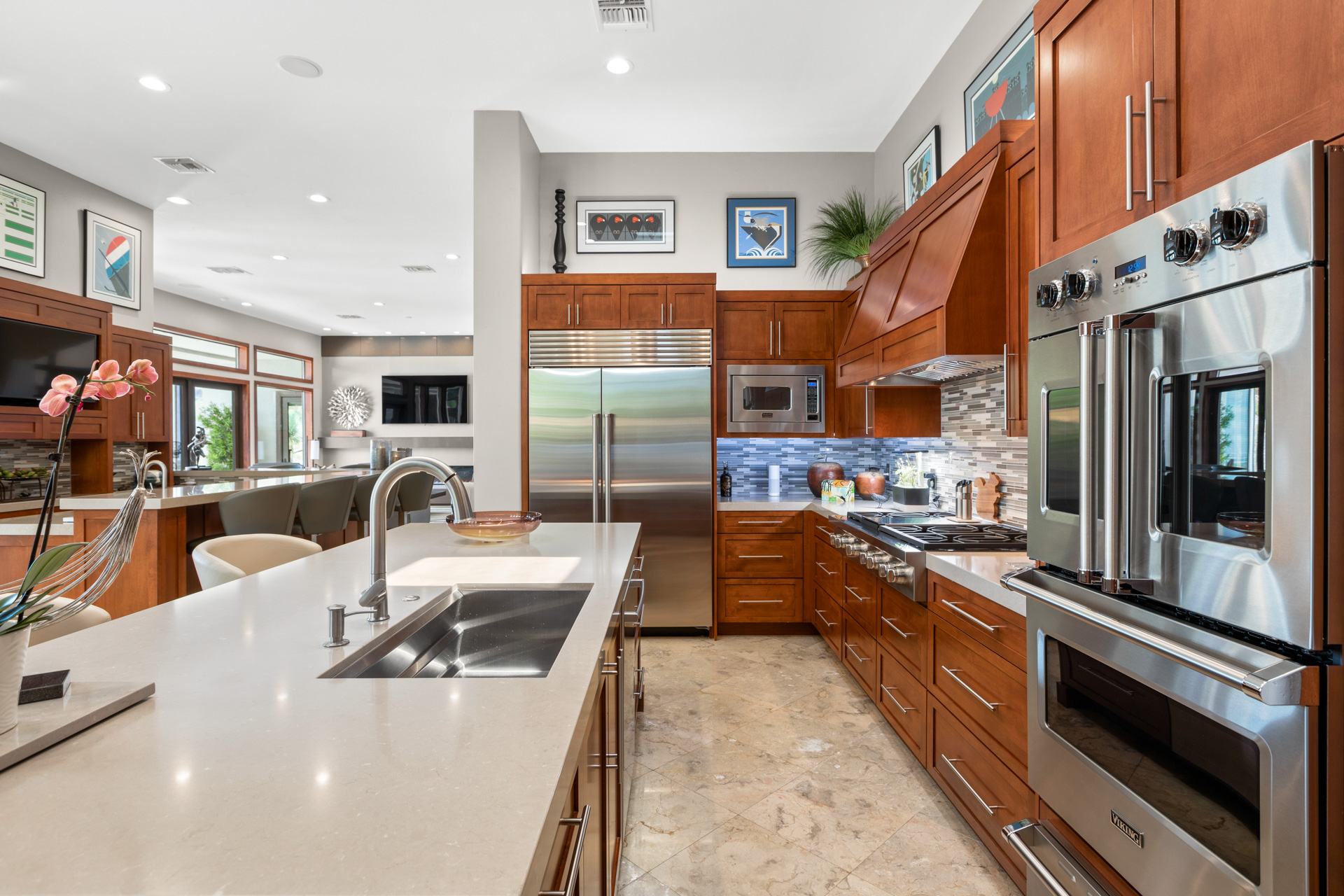 The home's kitchen, with a distinctive built-in Viking triple wall oven, gas cooktop, built-in wine chiller, center island and informal dining space, is adjacent to a large wet bar, located to easily serve indoor and outdoor needs. However, just outside is a full outdoor grilling kitchen with its own bar counter. With a circular windowed sitting area, a sensuous bath with L-shaped window seat and a custom closet/dressing room, the home's master bedroom is the perfect private retreat. The home also features a dedicated den/office. Another bedroom suite boasts a private bath and its own sitting area, while a third bedroom and bath are situated in another wing. Impressive metal gates lead to a beautifully-landscaped entry courtyard that only hints at the treasures within. Nearly 4,000 square feet of interior space, multiple fireplaces and a three-car garage on more than a third of an acre make this a residence that can adapt to a lot of living styles. You'll be proud to call it home!