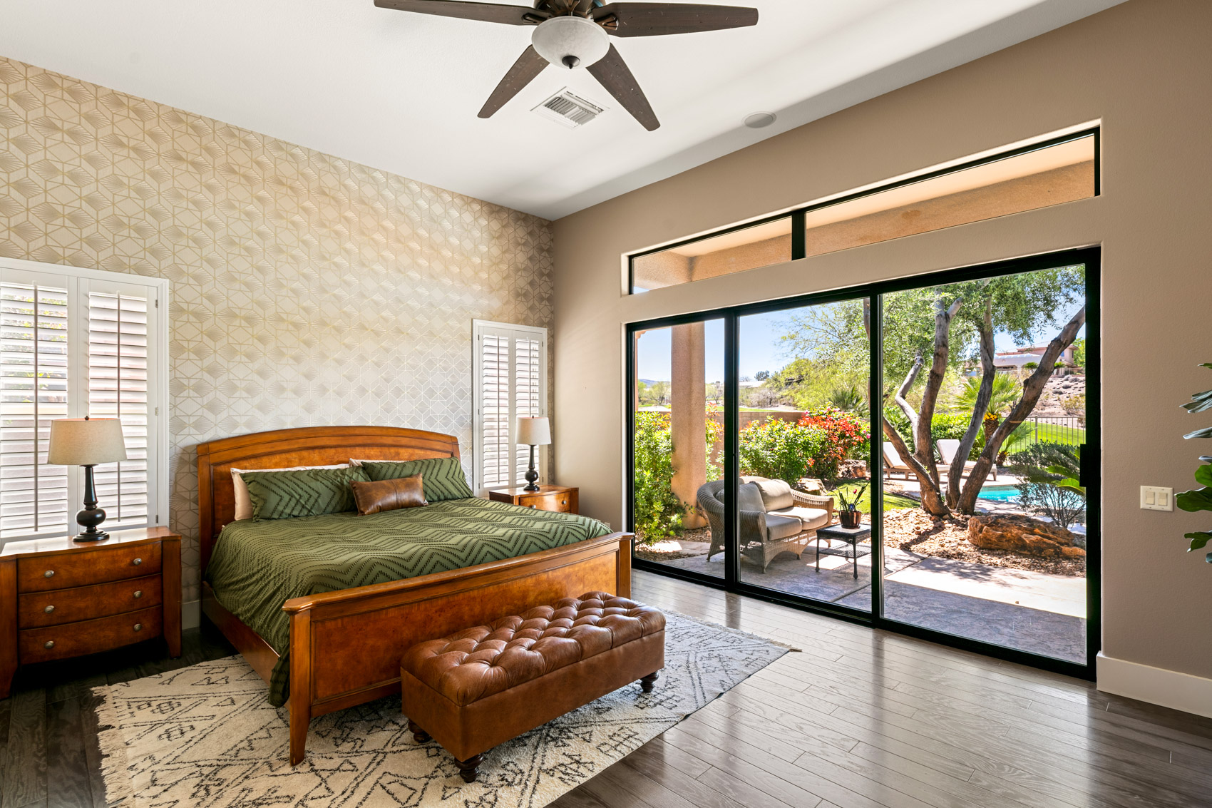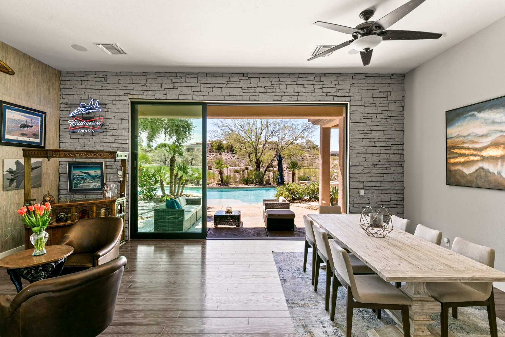 The bright and spacious family roomās focal point is a linear gas fireplace on a designer entertainment wall. The living and dining room is perfect for entertaining, with pocketing doors leading out to the covered patio and the lush, private backyard, featuring an outdoor kitchen, a large sparkling pool/spa, and a fire pit to sit around and admire the stunning mountain views behind the green golf course. Near the elegant powder room, there is a bedroom with a walk-in closet. An impressive spiral staircase leads up to a unique mid-stairs office and the second floor with two bedrooms, a bathroom, and a spacious loft. The 3-car garage has epoxy-finished flooring and custom cabinets. Living in Anthem Country Club means you'll have access to world-class amenities, including a championship golf course, tennis courts, a gym, a magnificent clubhouse, and two restaurants for grand social gatherings and cherished memories. Surrounded by stunning views and lush landscapes, this lifestyle is beyond compare for those who desire easy access to The Strip, Harry Reid International Airport, Henderson Executive Airport, or one of the shortest drives to Los Angeles.
